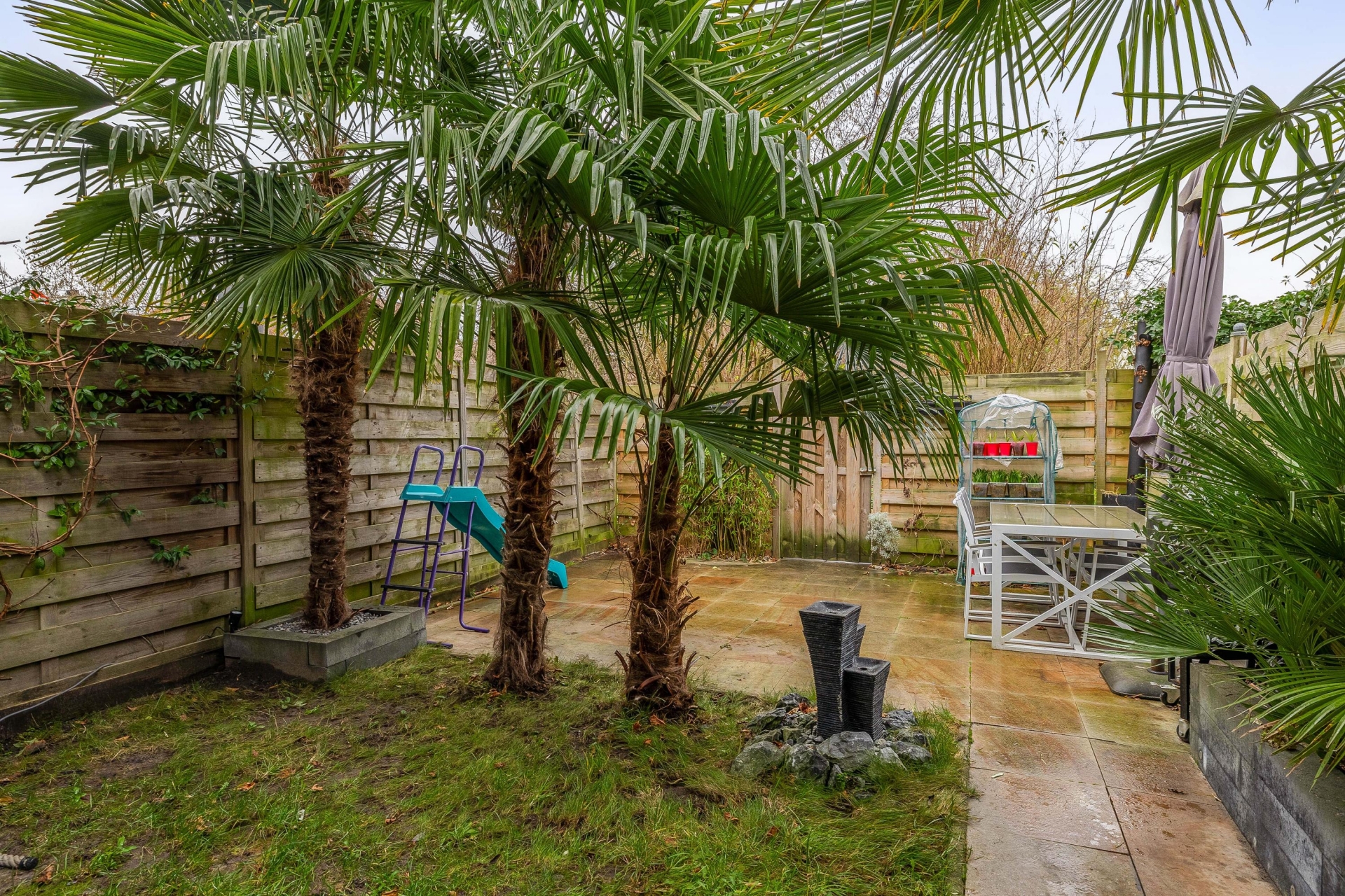 De achtertuin, gelegen op het oosten, is een echte eyecatcher. Dankzij de fraaie palmbomen krijgt de tuin direct een unieke sfeer. Er is een betegeld terras onder een overkapping, ideaal voor lange zomerse dagen en gezellige barbecues. Het overige tuinonderdeel biedt plek voor groen en speelruimte, met voldoende privacy en een eigen achterom.