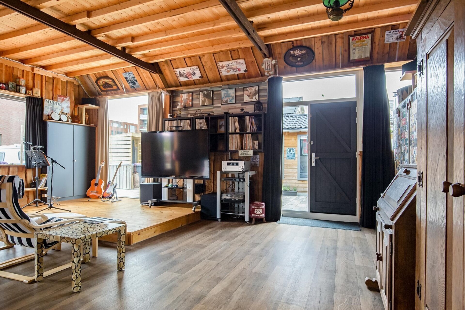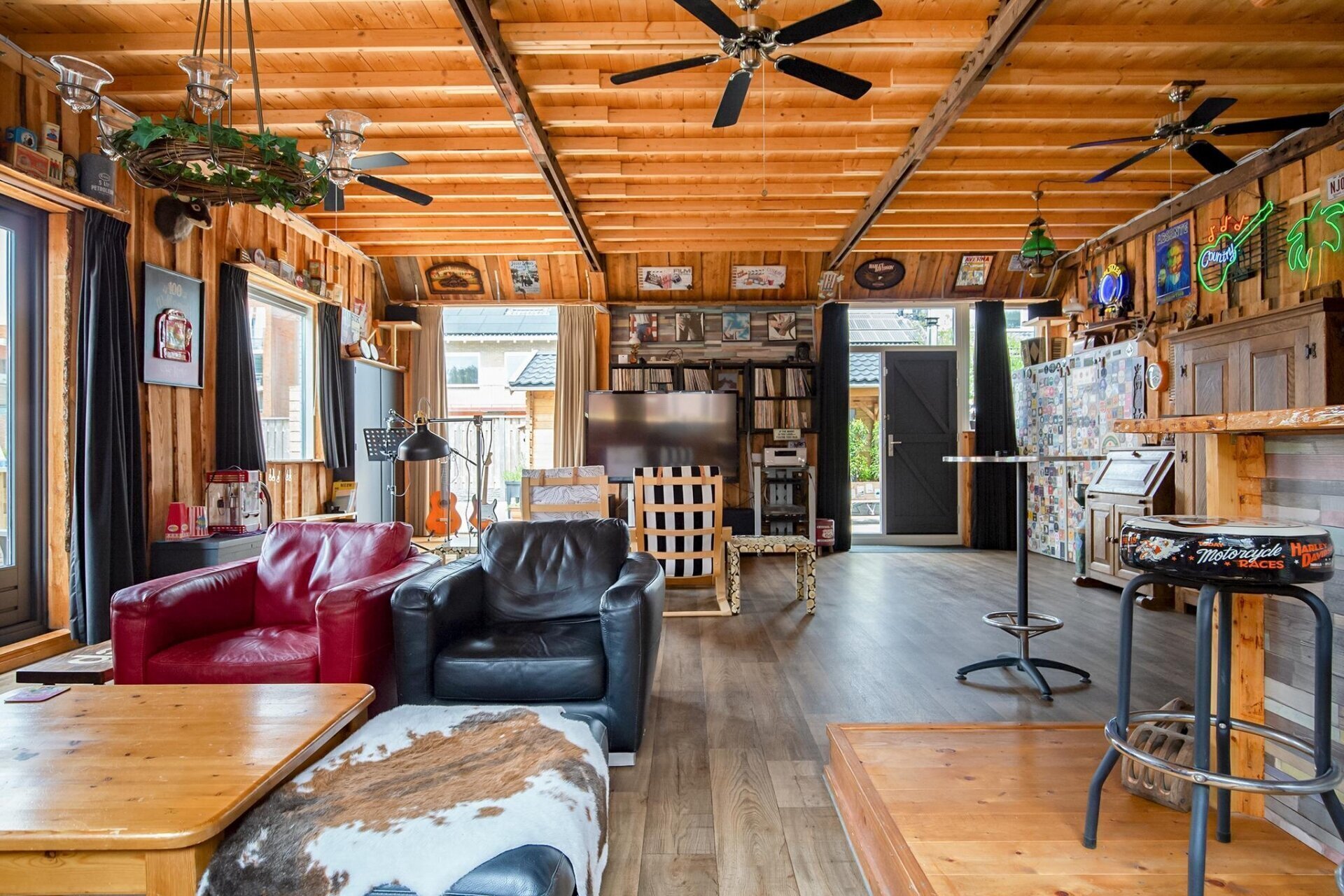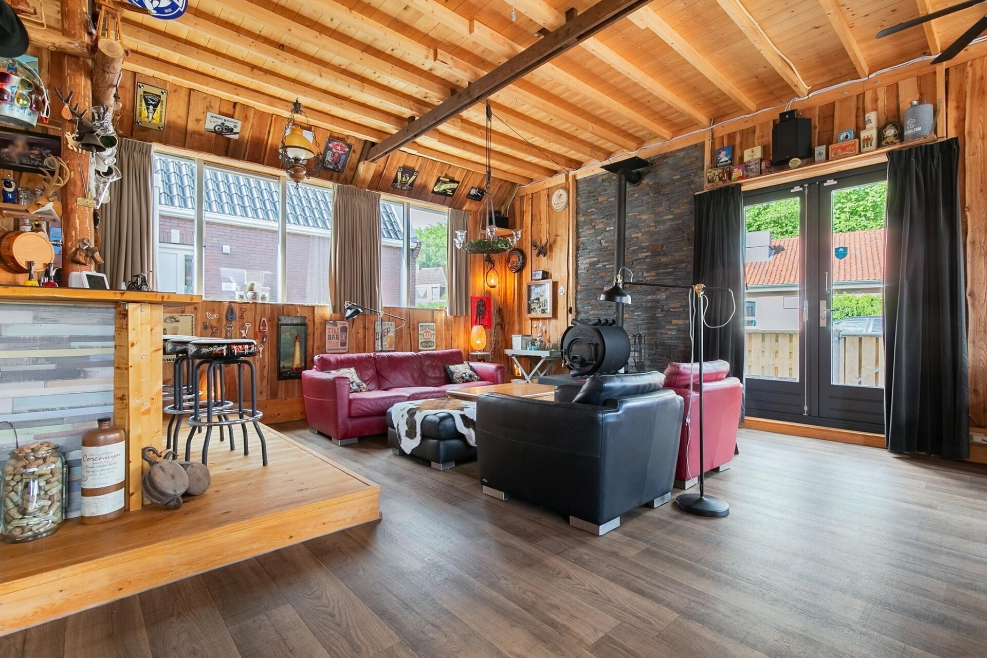Entree zijkant, royale woonruimte/living met gezellige bar van circa 72m2, toegang naar de tuin aan de voorzijde middels openslaande deuren. Deze ruimte heeft een hoog plafond en is v.v. een gave houtkachel. Aansluitend komt u in de royale eetkamer/multifunctionele ruimte met pooltafel. Vanuit deze ruimte is er toegang tot de ruime slaapkamer, de twee inpandige garages en de horeca keuken met toegang tot de bijkeuken met afwasmachine. Voorts via de gang met separaat toilet komt u bij de bijkeuken en berging aan de achterzijde alsmede de moderne en riante badkamer met ruime inloopdouche, dubbele wastafel met meubel, hangend tweede toilet, designradiator en aansluitingen voor wasmachine en droger.
