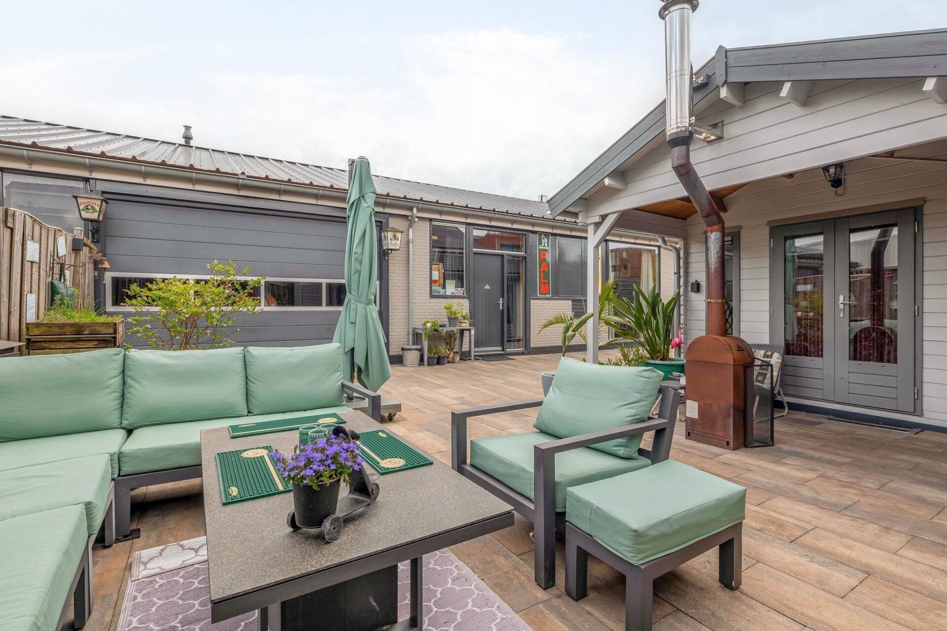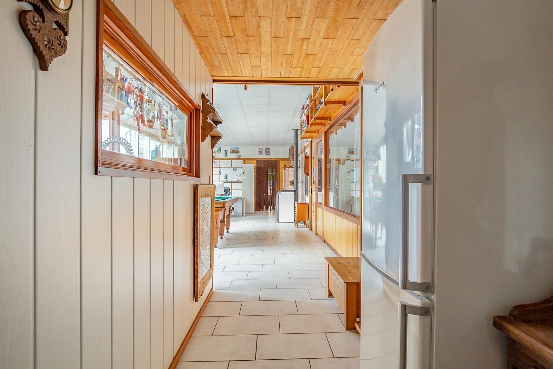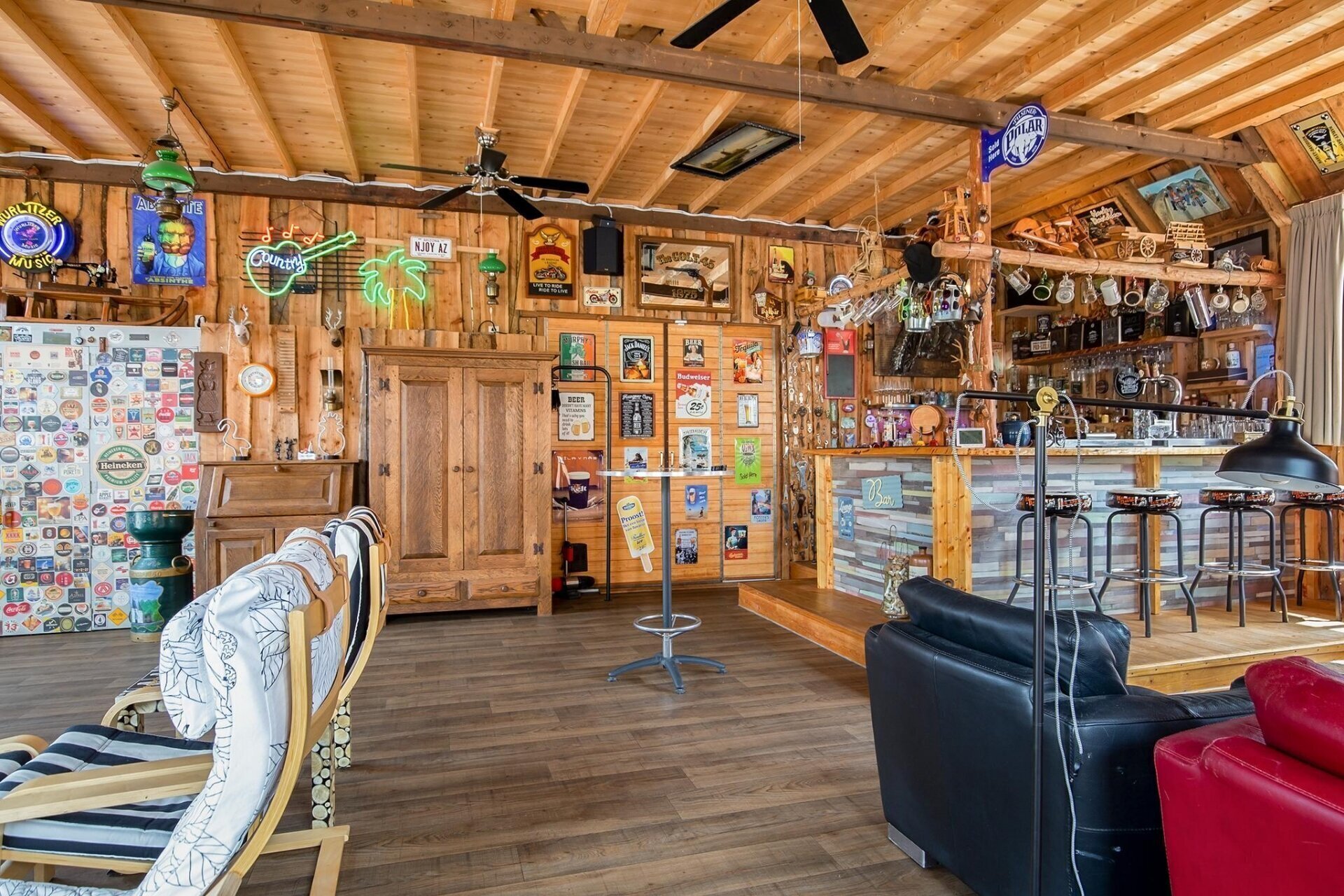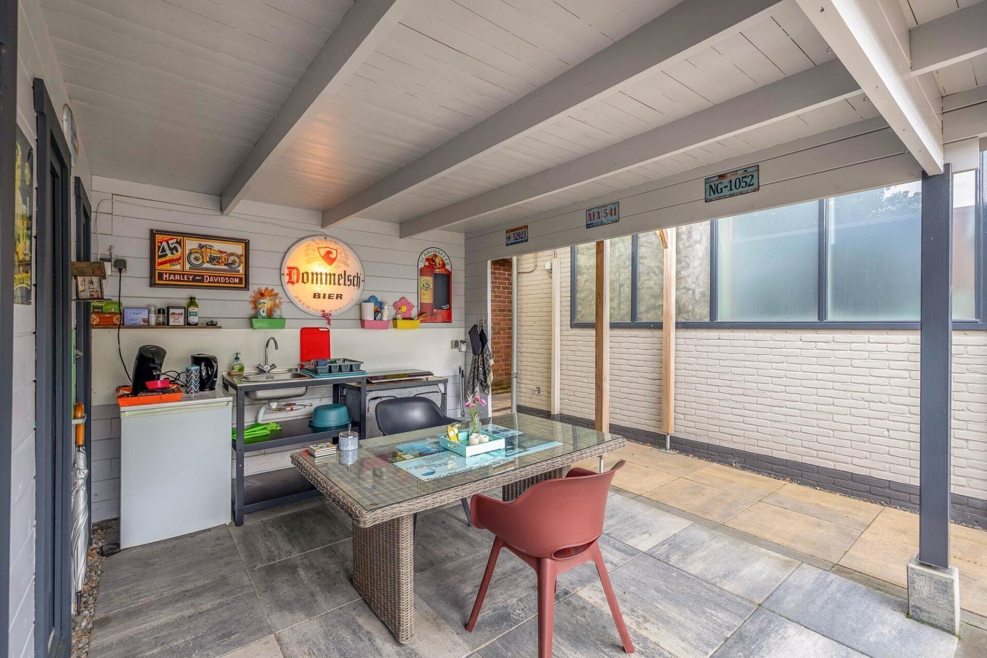 Entree zijkant, royale woonruimte/living met gezellige bar van circa 72m2, toegang naar de tuin aan de voorzijde middels openslaande deuren. Deze ruimte heeft een hoog plafond en is v.v. een gave houtkachel. Aansluitend komt u in de royale eetkamer/multifunctionele ruimte met pooltafel. Vanuit deze ruimte is er toegang tot de ruime slaapkamer, de twee inpandige garages en de horeca keuken met toegang tot de bijkeuken met afwasmachine. Voorts via de gang met separaat toilet komt u bij de bijkeuken en berging aan de achterzijde alsmede de moderne en riante badkamer met ruime inloopdouche, dubbele wastafel met meubel, hangend tweede toilet, designradiator en aansluitingen voor wasmachine en droger.