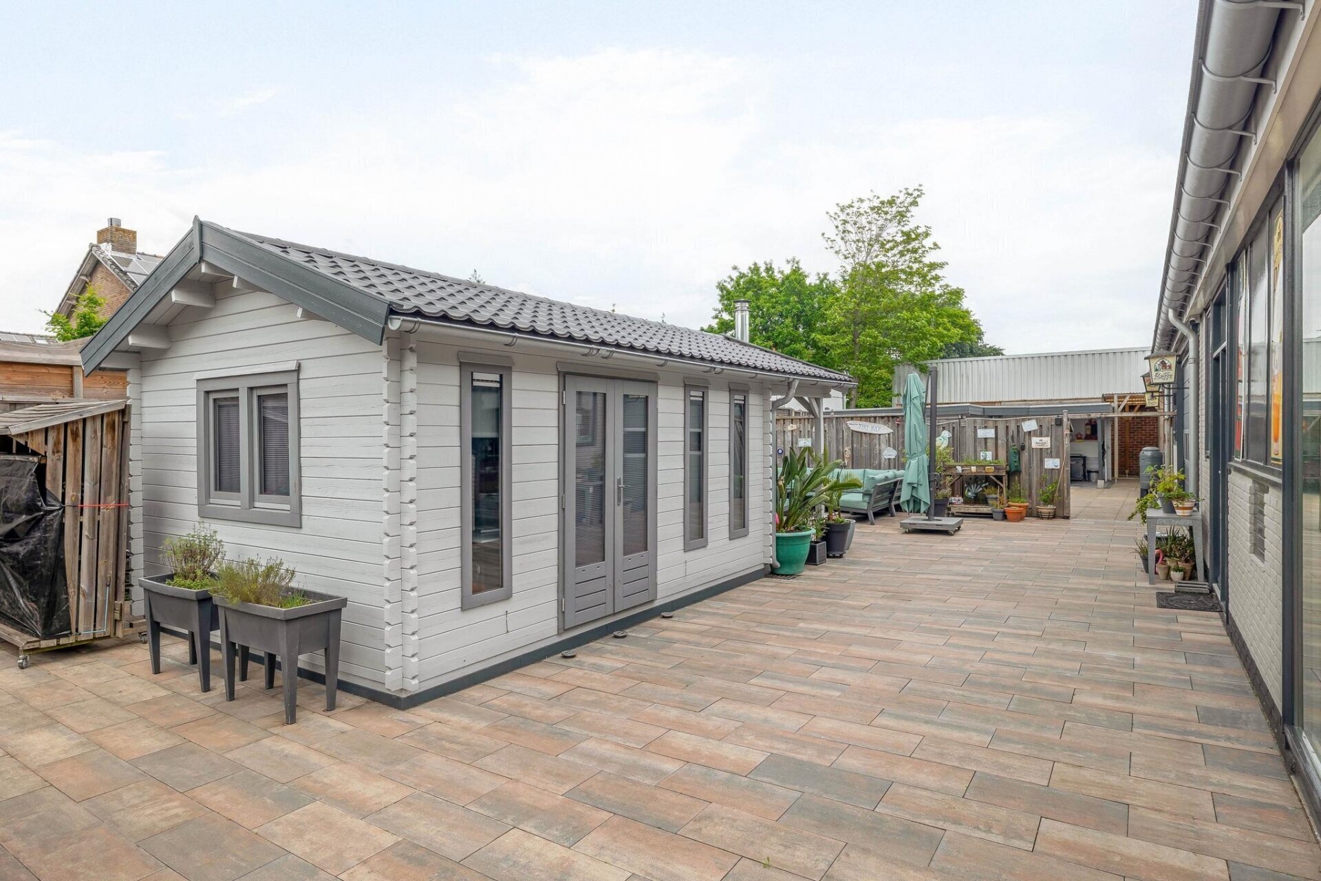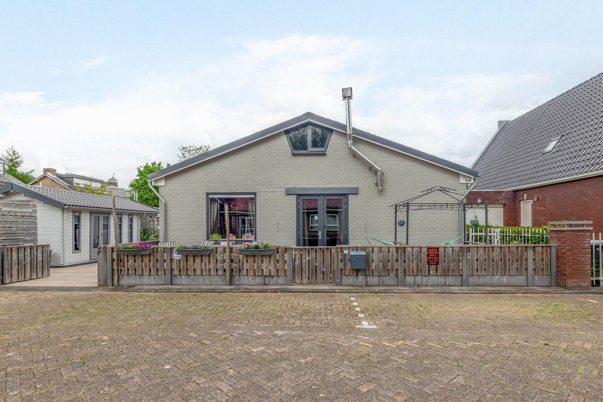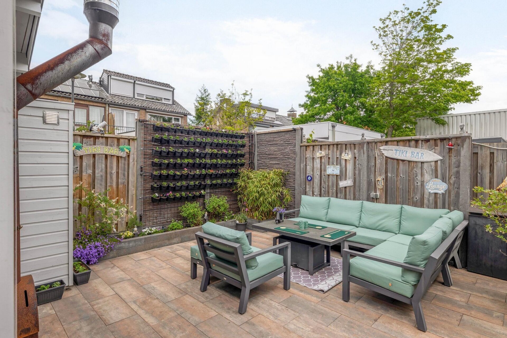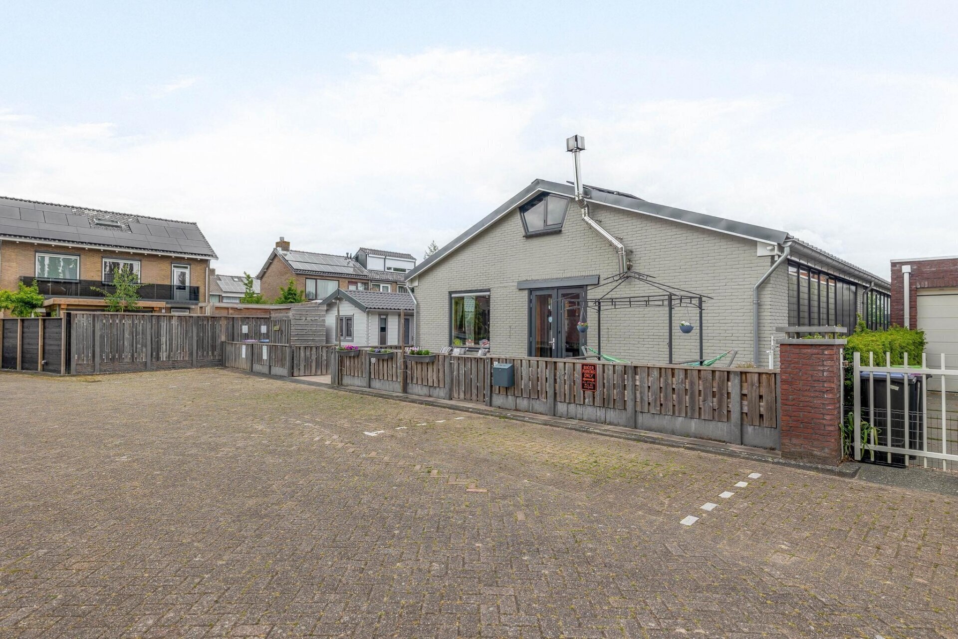 Keurig aangelegde en bestraatte tuin rondom de woning v.v. degelijke schuttingen op betonpalen.