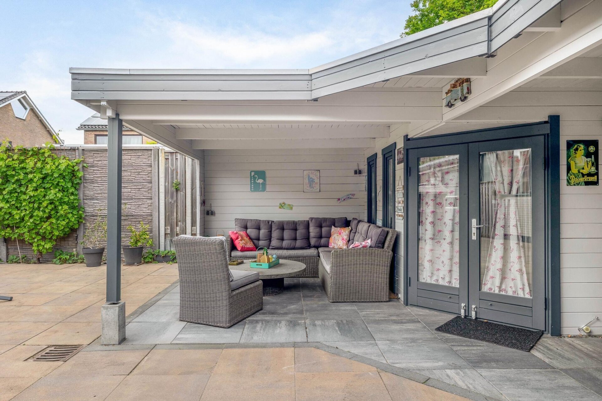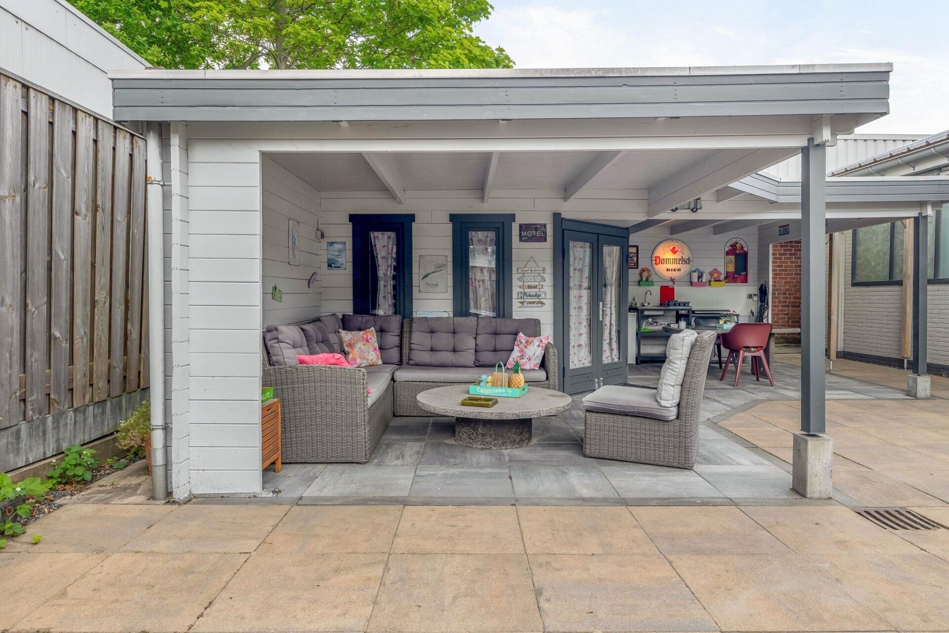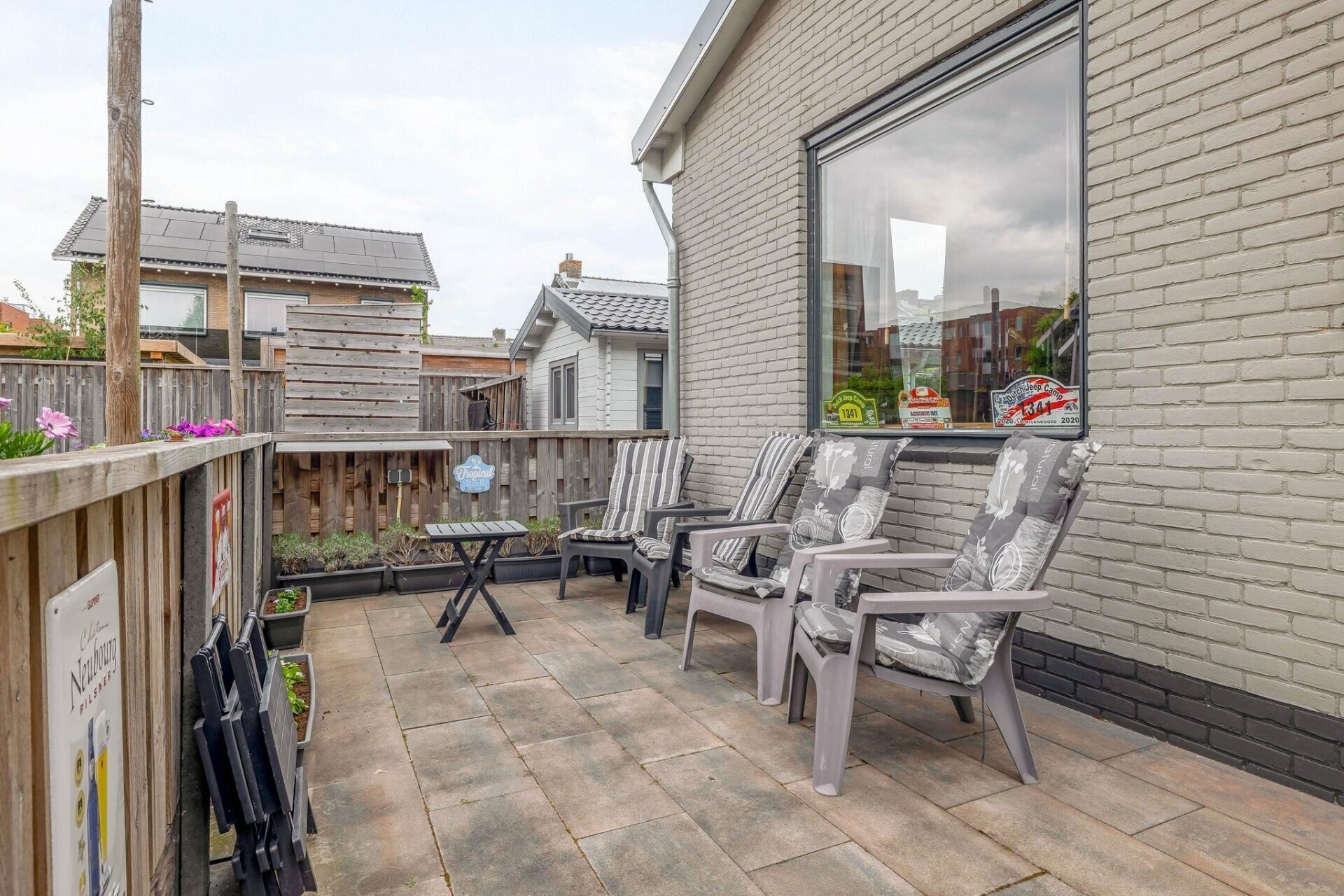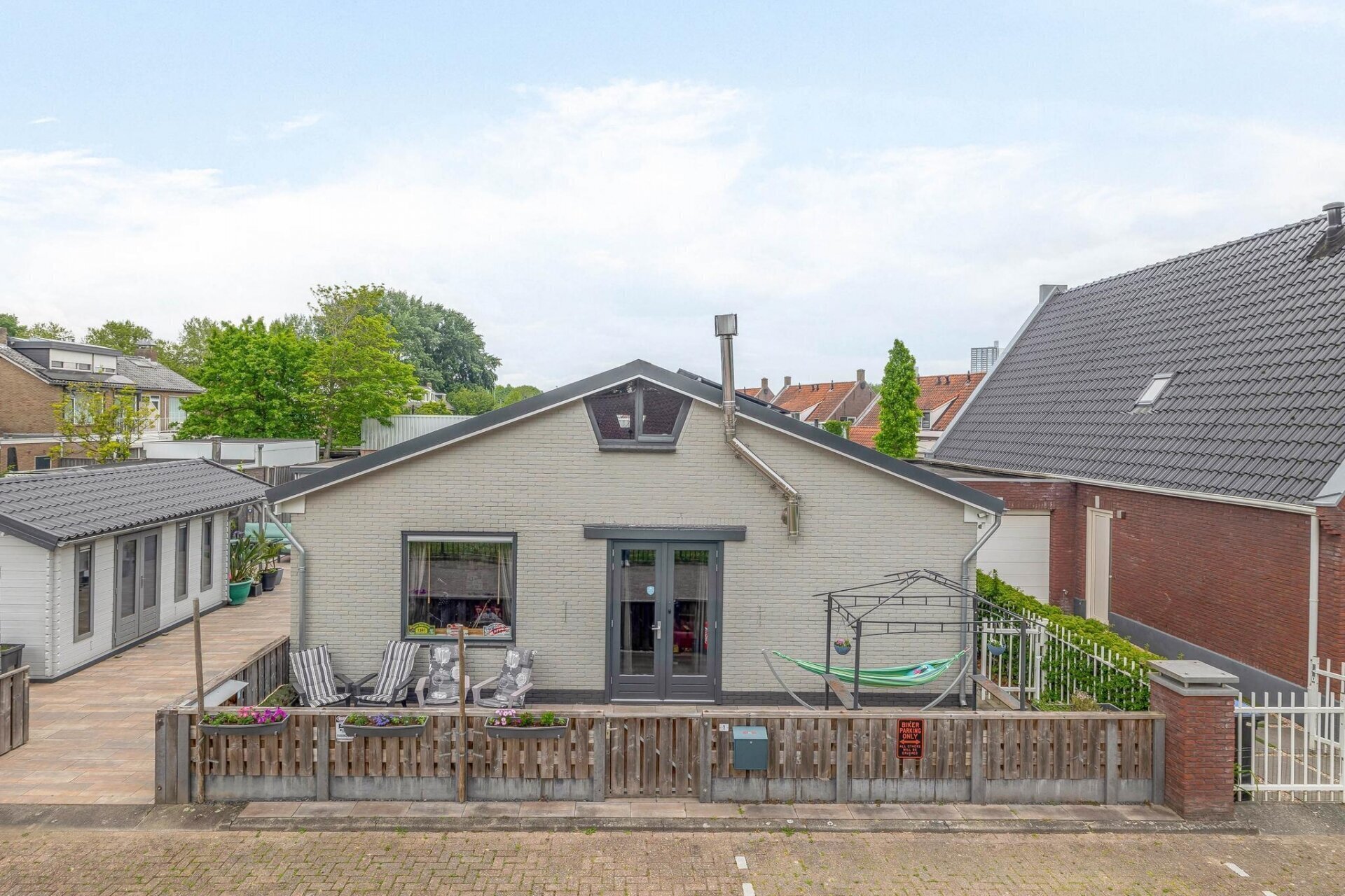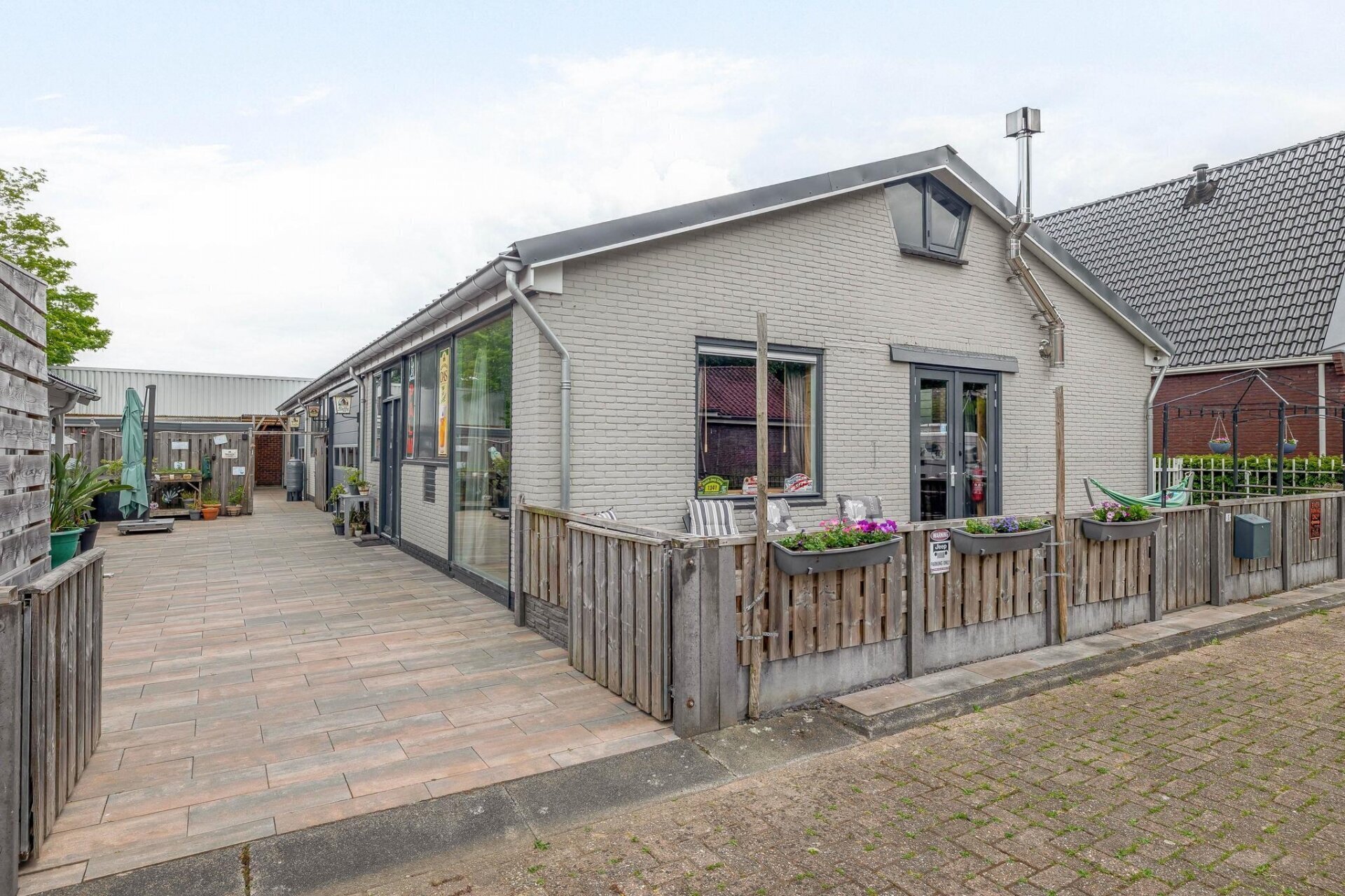 Keurig aangelegde en bestraatte tuin rondom de woning v.v. degelijke schuttingen op betonpalen.