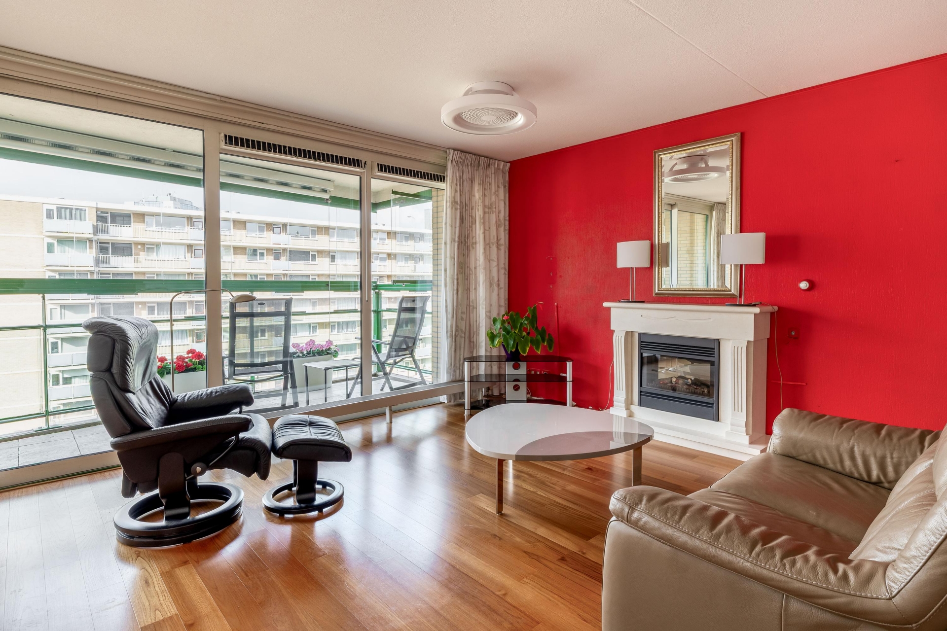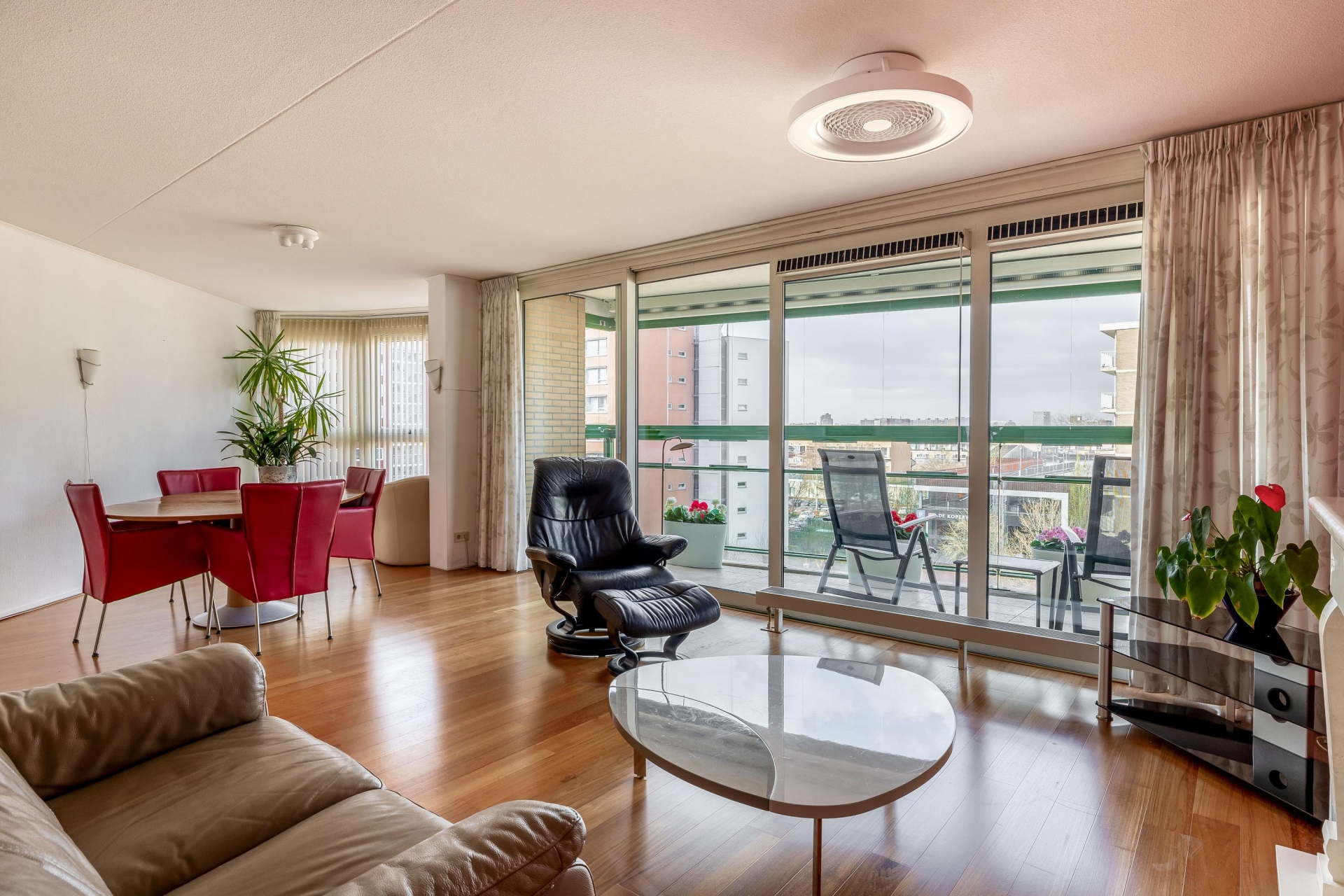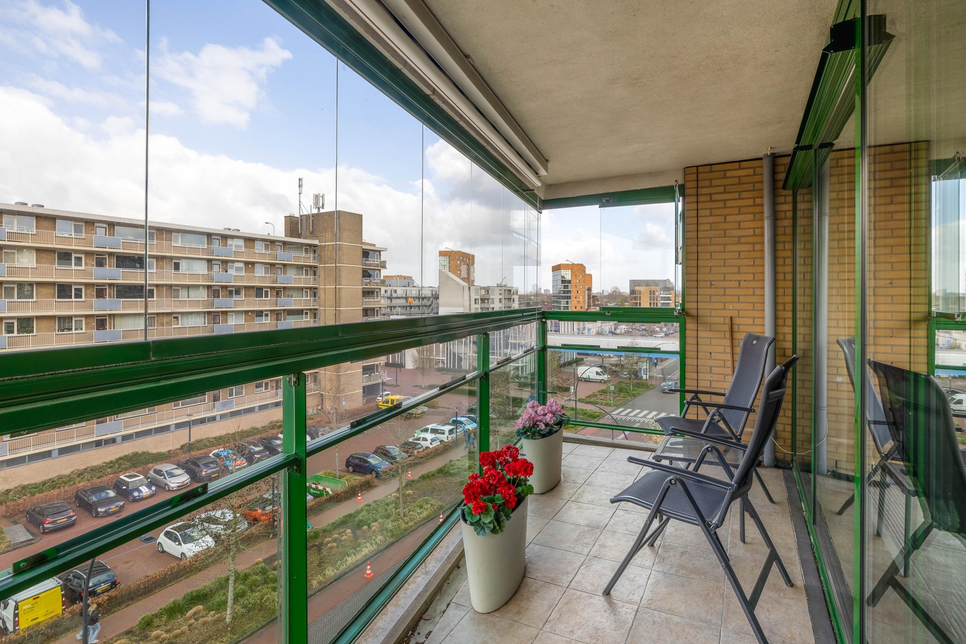 Vanuit de woonkamer biedt een brede schuifpui toegang tot het overdekte balkon met glazen schuifwanden:
