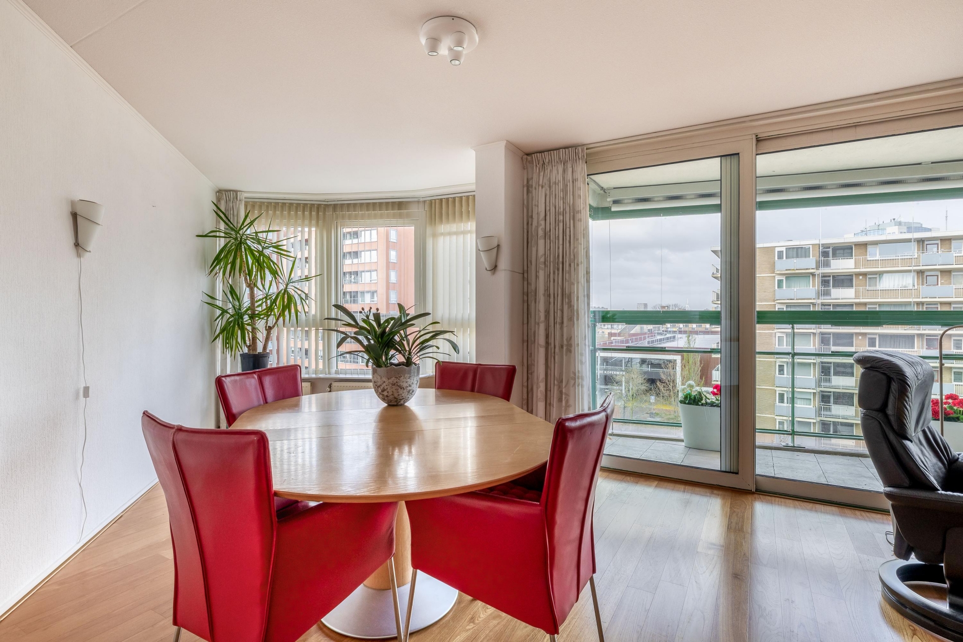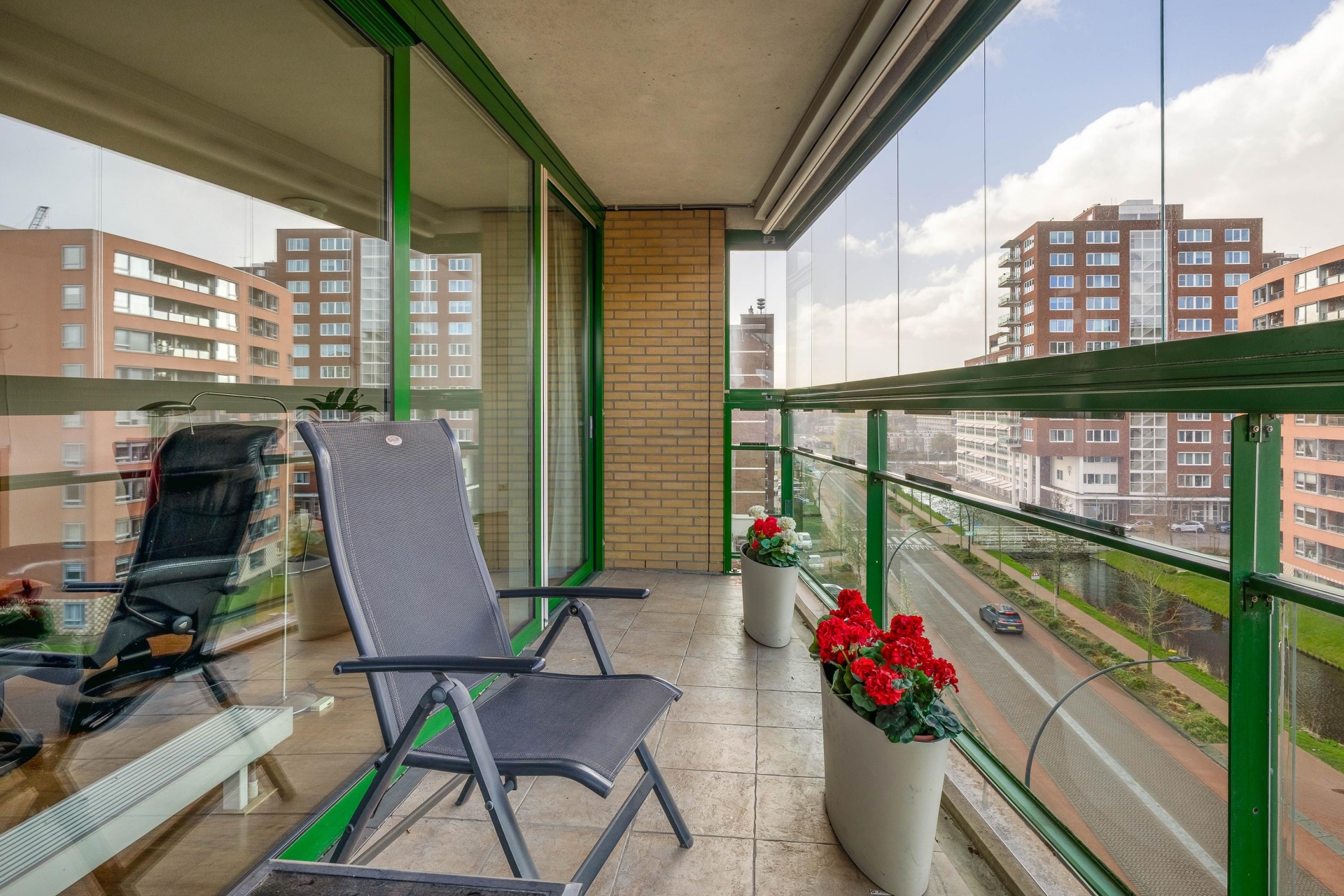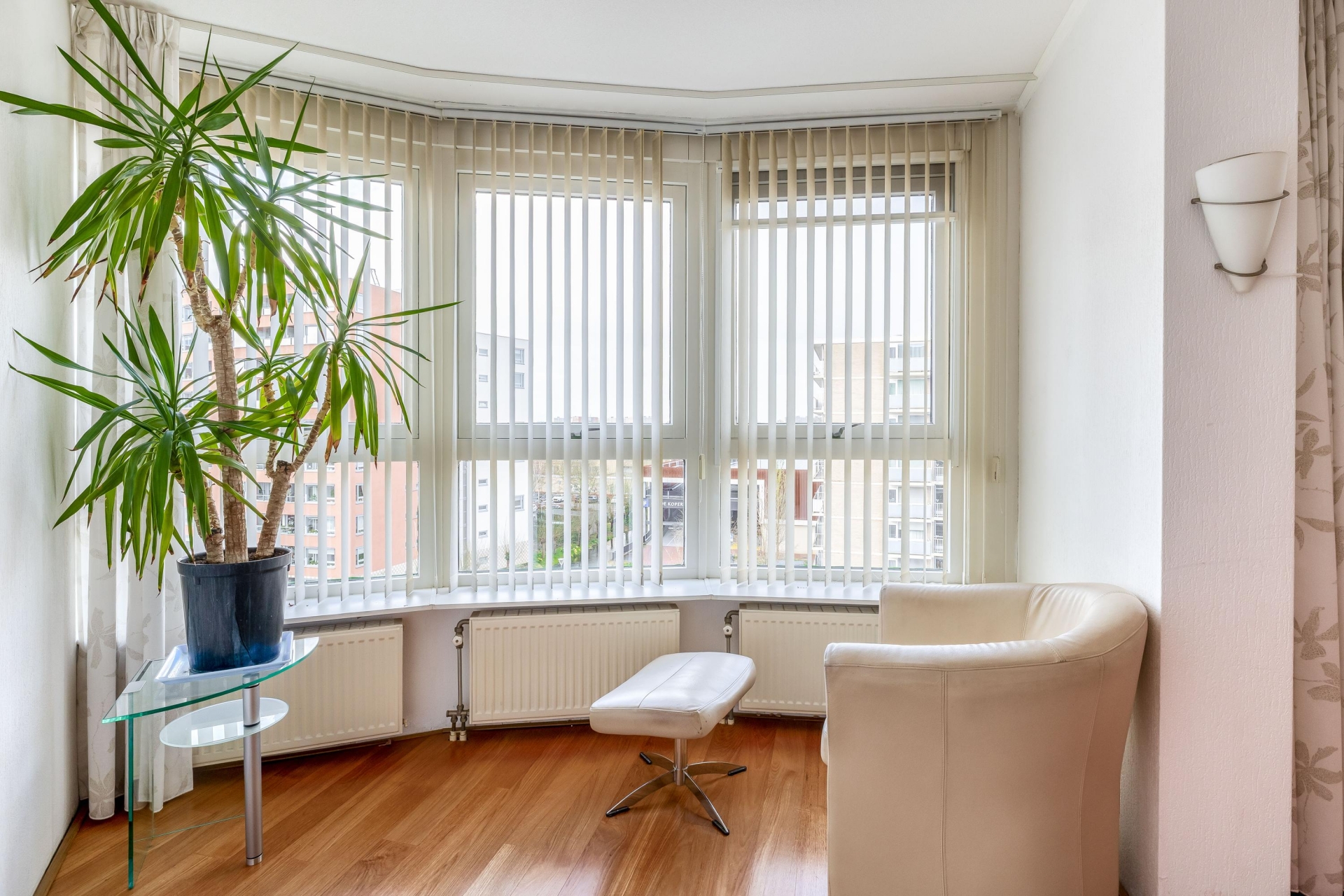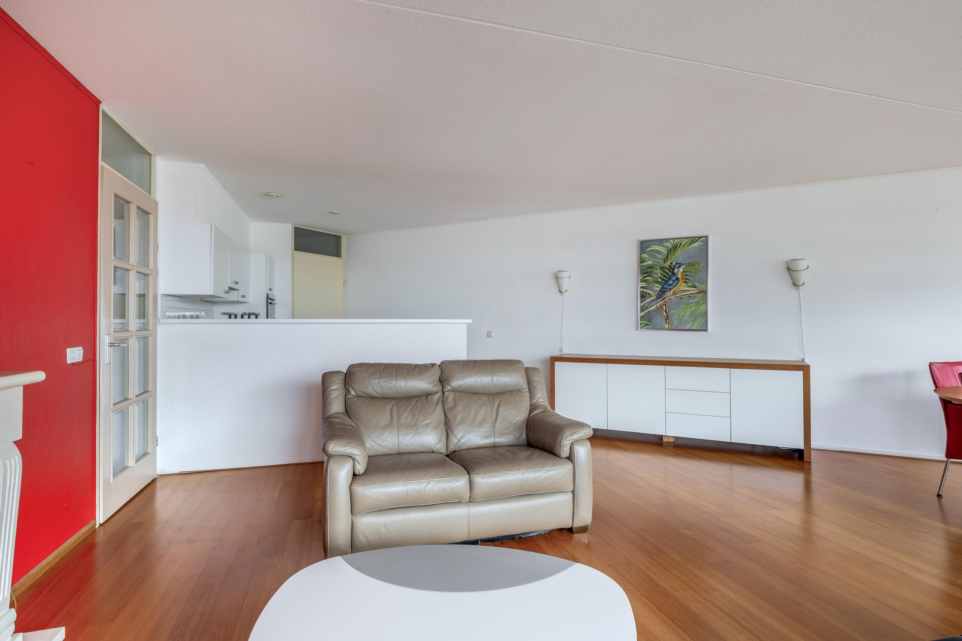 Vanuit de woonkamer biedt een brede schuifpui toegang tot het overdekte balkon met glazen schuifwanden: