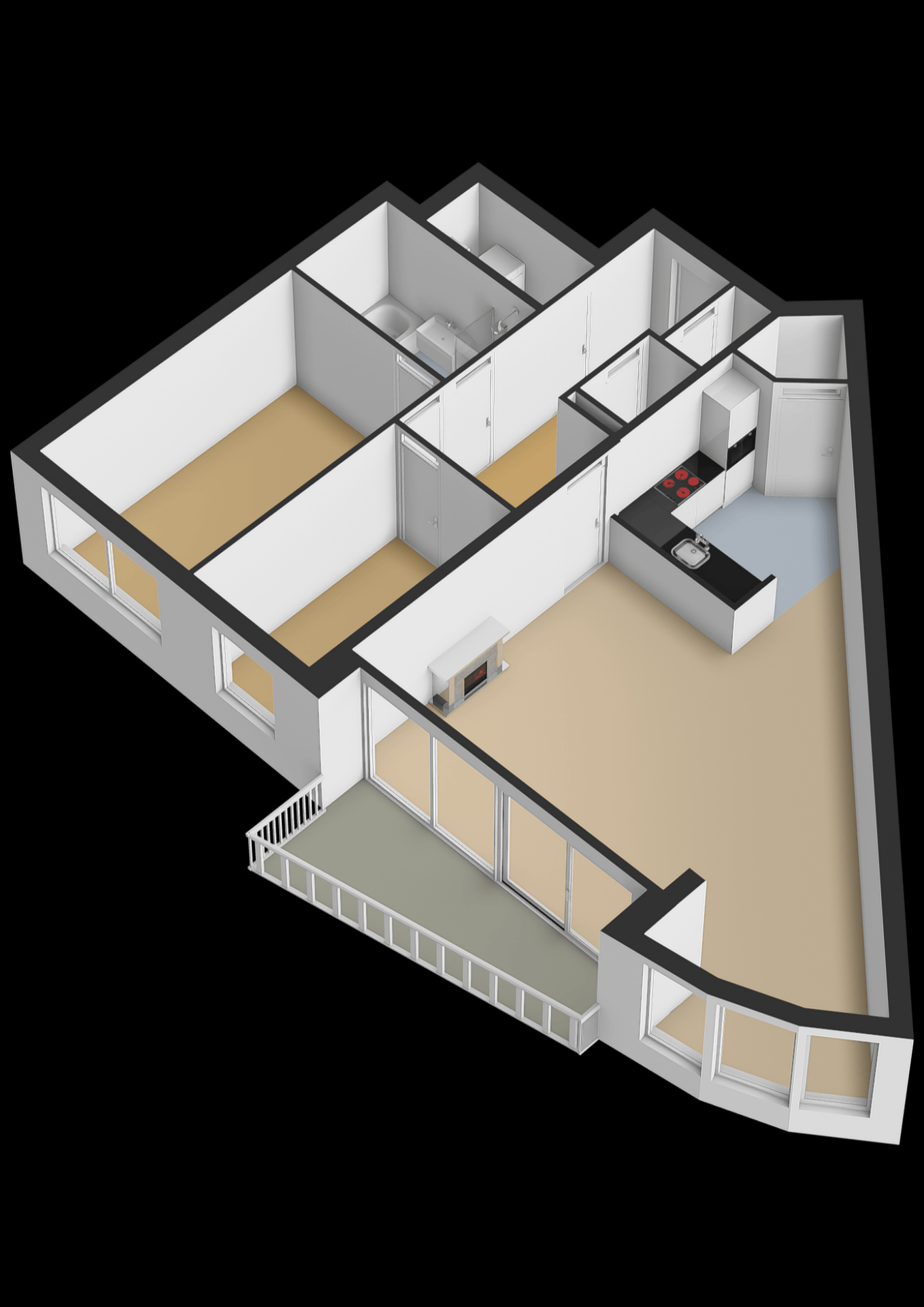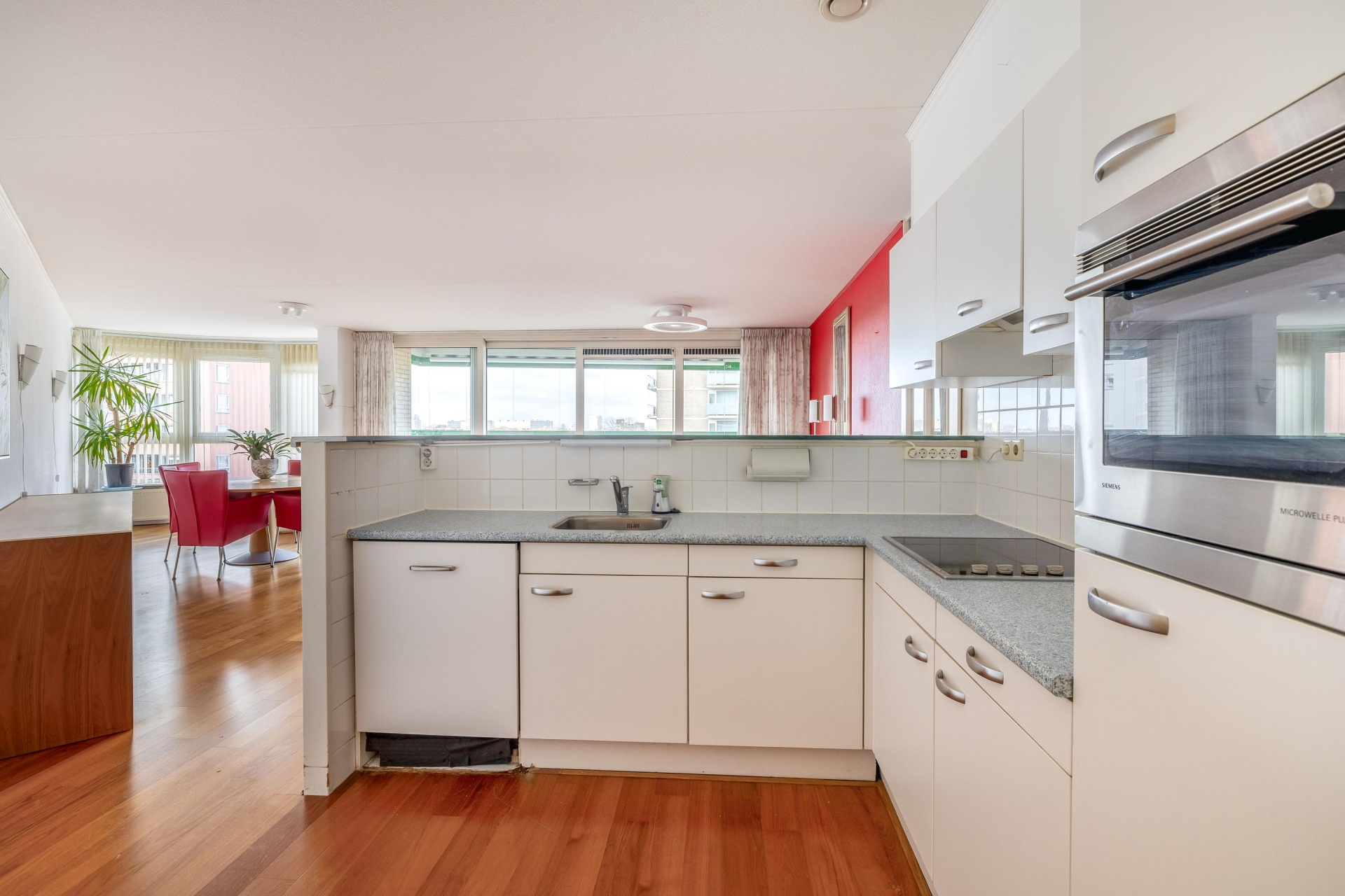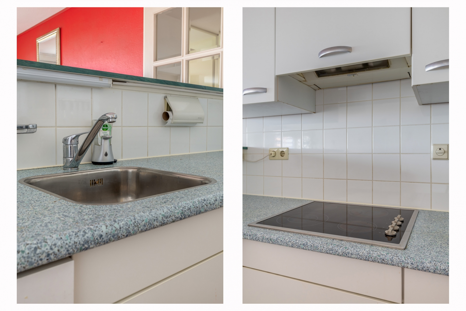 en keuken. De half open keuken is voorzien van een licht keukenblok in L-opstelling, met daarin ruimte voor een spoelbak met mengkraan, kookplaat met afzuigkap, koelkast, vaatwasser en combi magnetron.