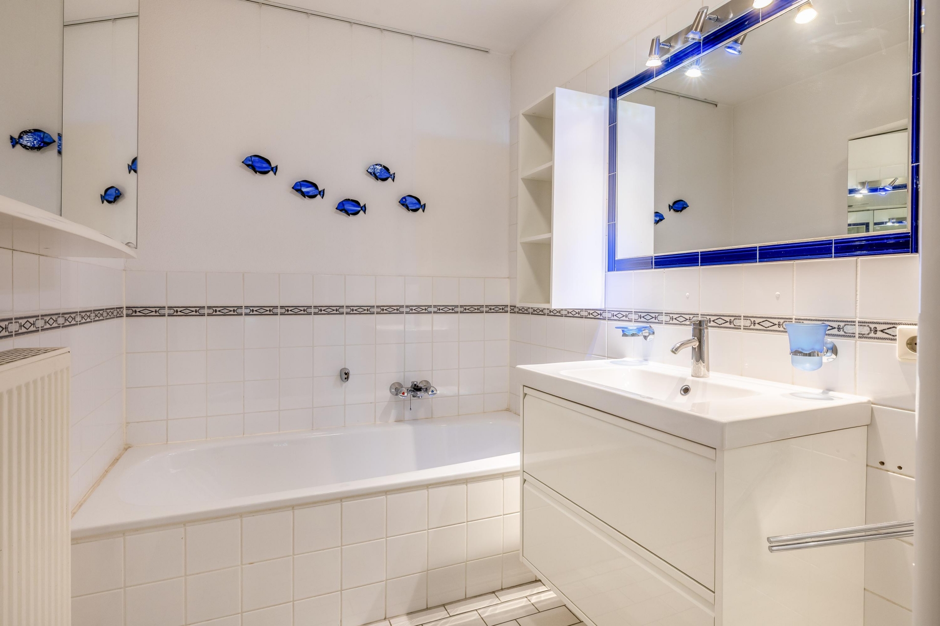 Deze badkamer is voorzien van een ligbad, douche cabine, wastafelmeubel met brede spiegel en verwarmingsradiator.