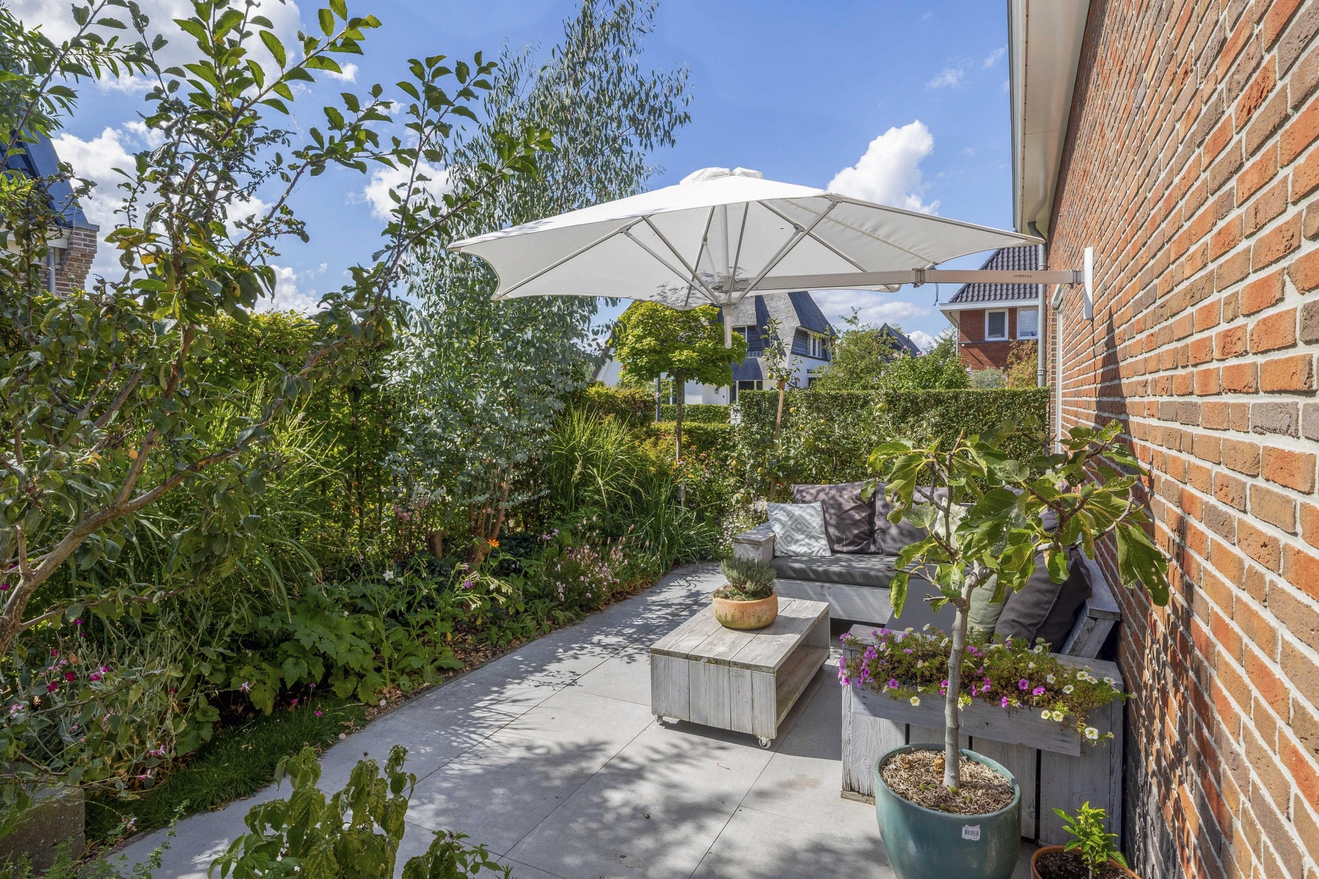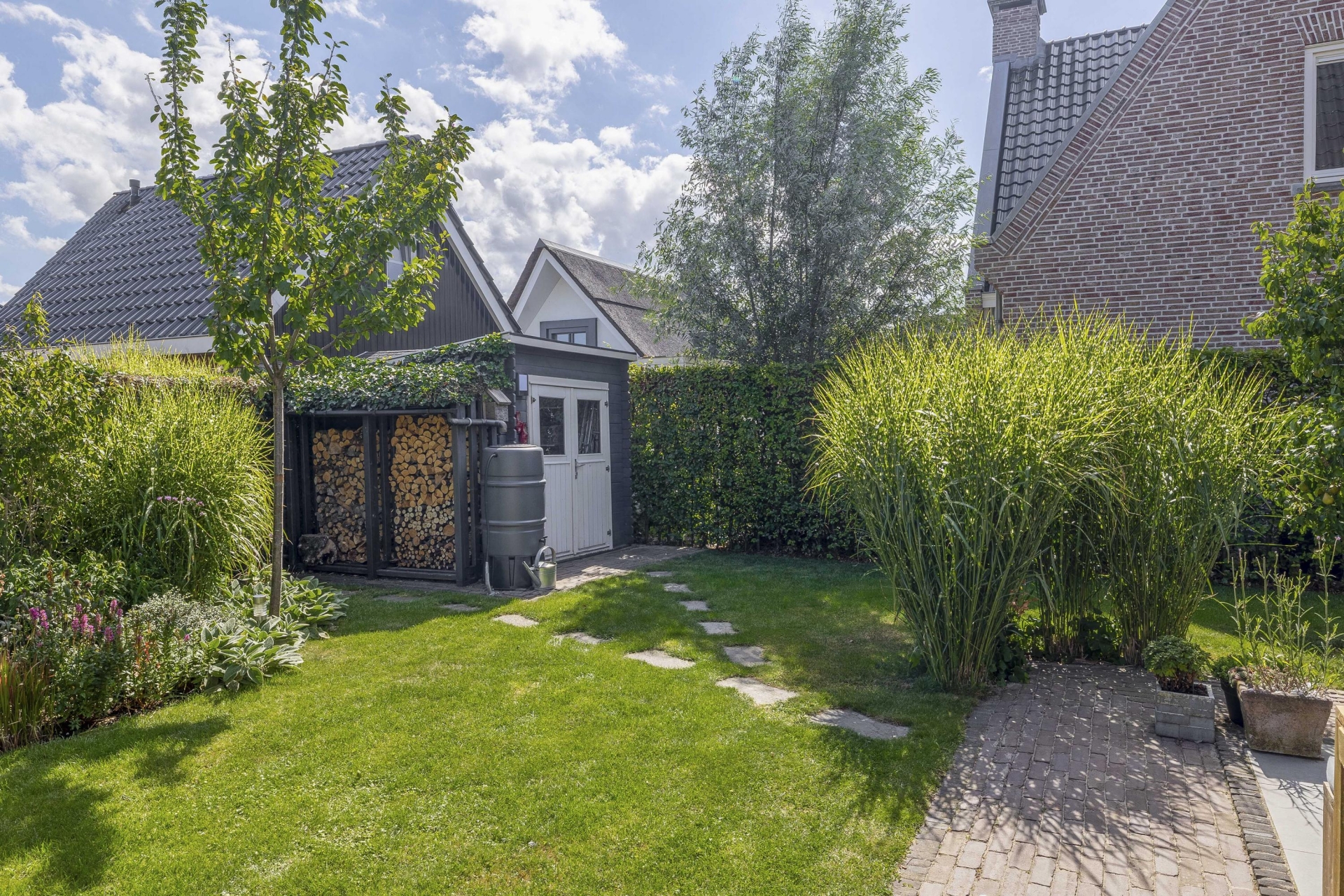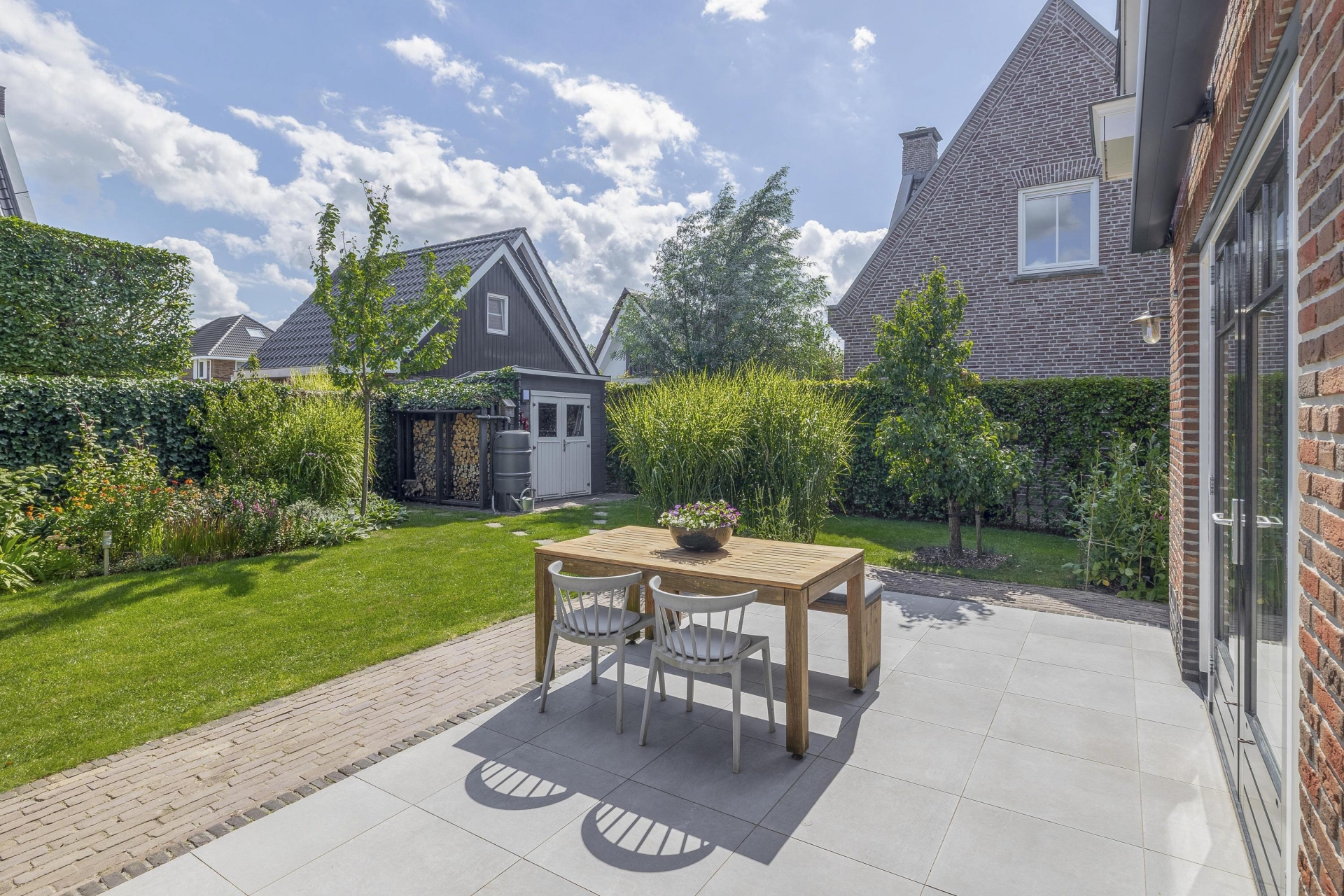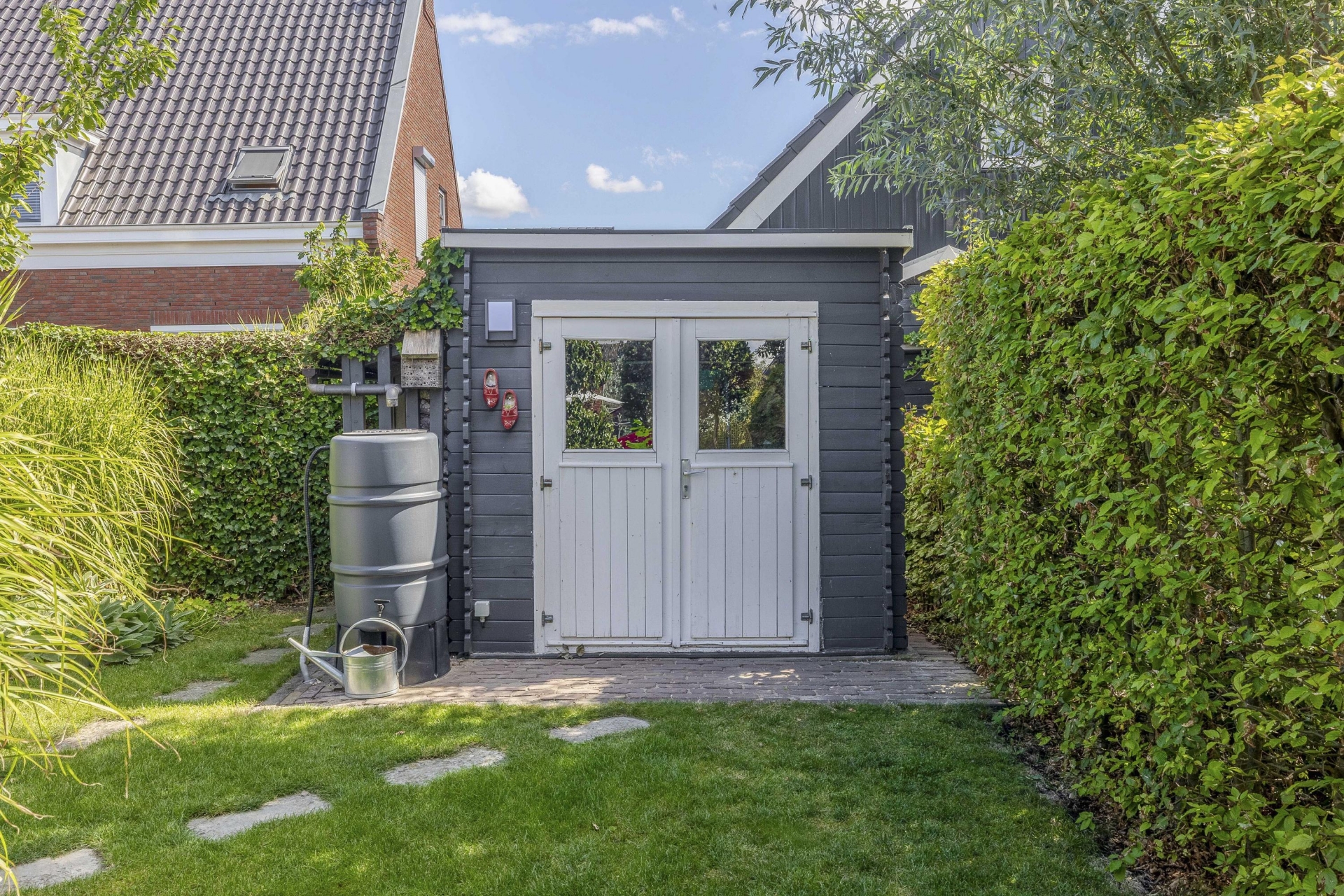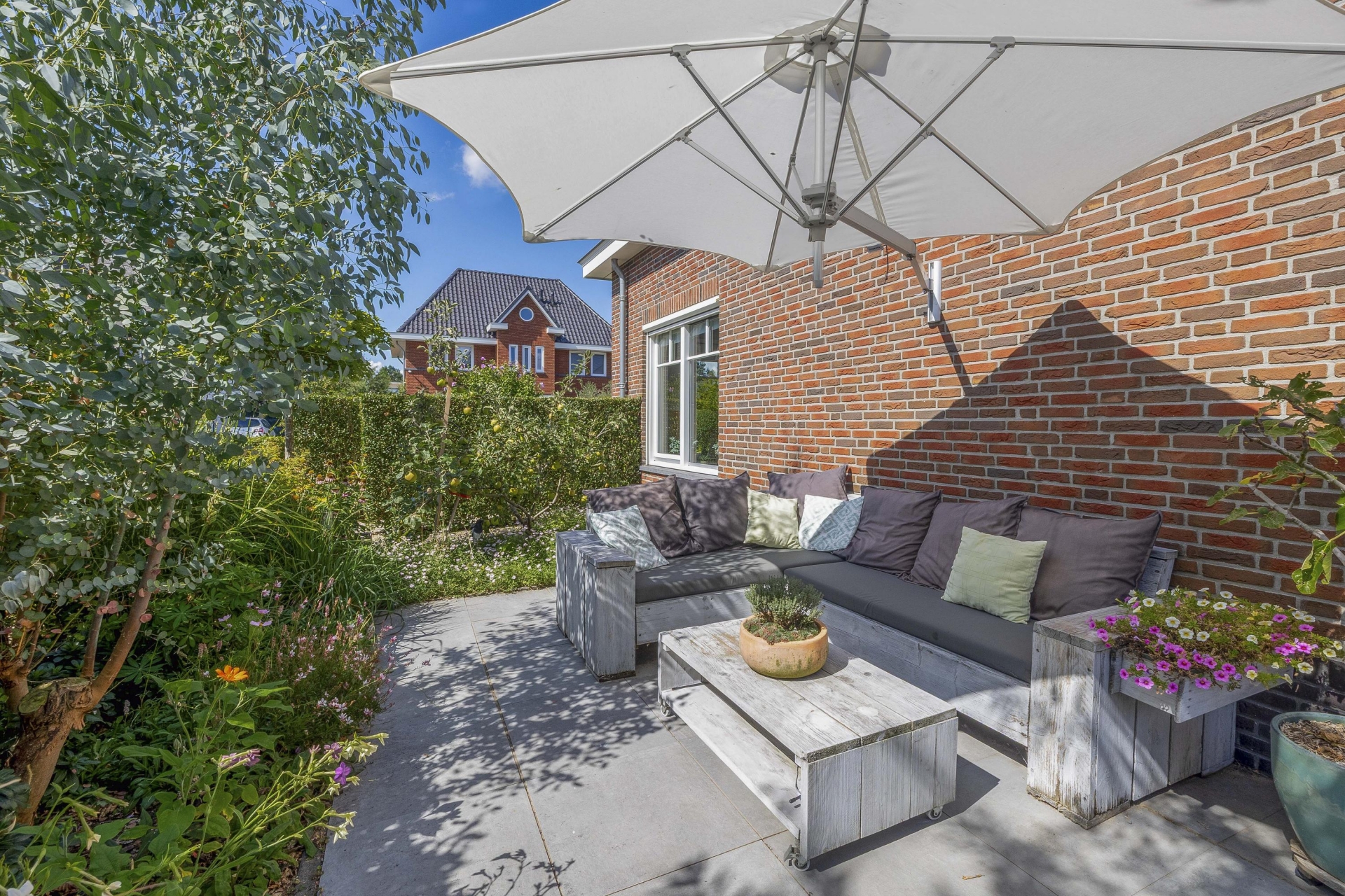Buiten vind je rondom het huis een fraai aangelegde tuin met meerdere zitplekken, beplanting en een mooie balans tussen groen en bestrating. De achtertuin ligt gunstig voor de zon en is via meerdere deuren te bereiken. Of je nu wilt genieten van de ochtendzon of juist een fijne plek zoekt voor de BBQ in de avond: de tuin biedt altijd een geschikte hoek. Er is meer dan genoeg ruimte voor een loungeset, buitenkeuken of speeltoestellen voor kinderen. Achterin de tuin is een praktische berging en natuurlijk parkeer je je auto's gewoon op je eigen oprit.