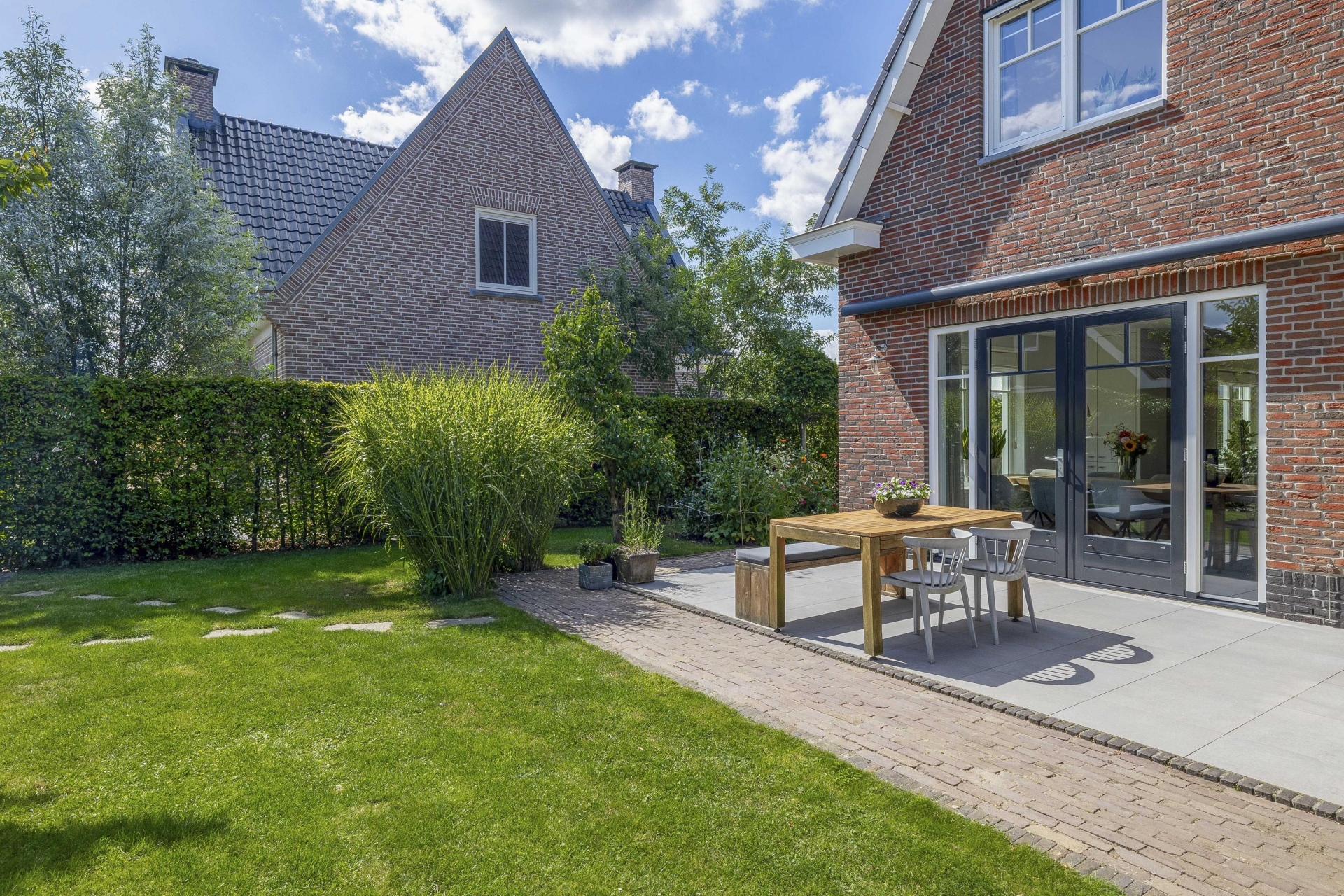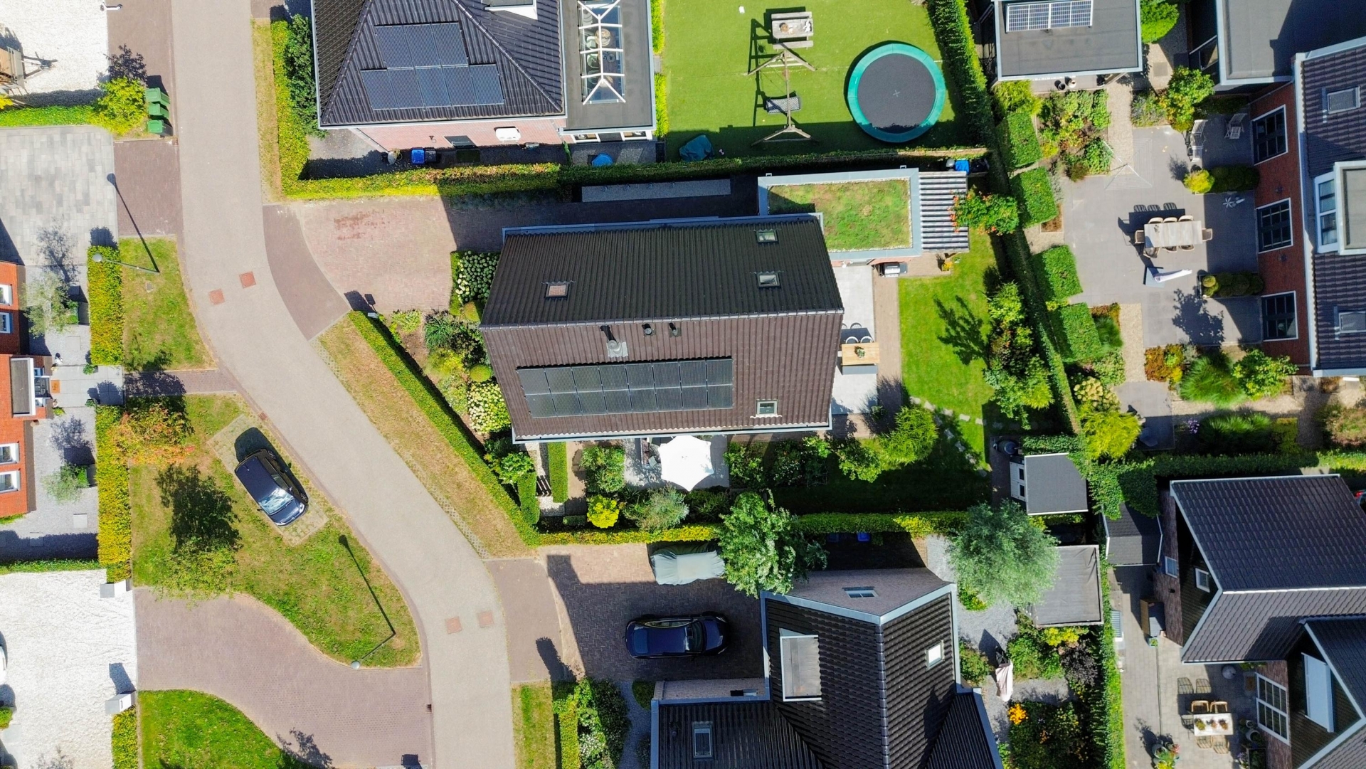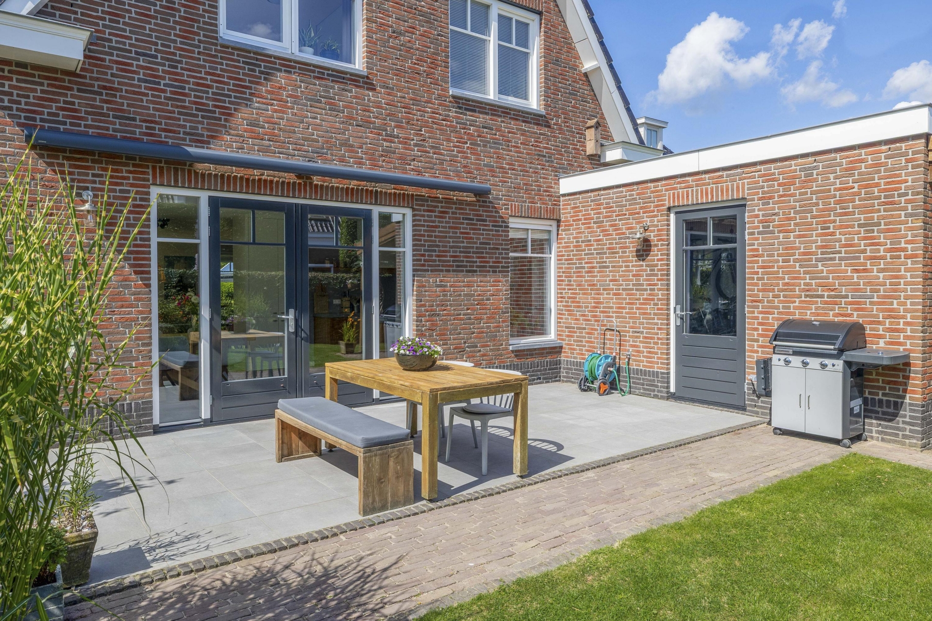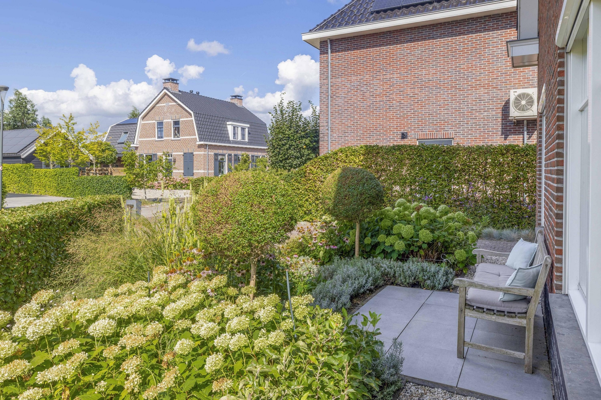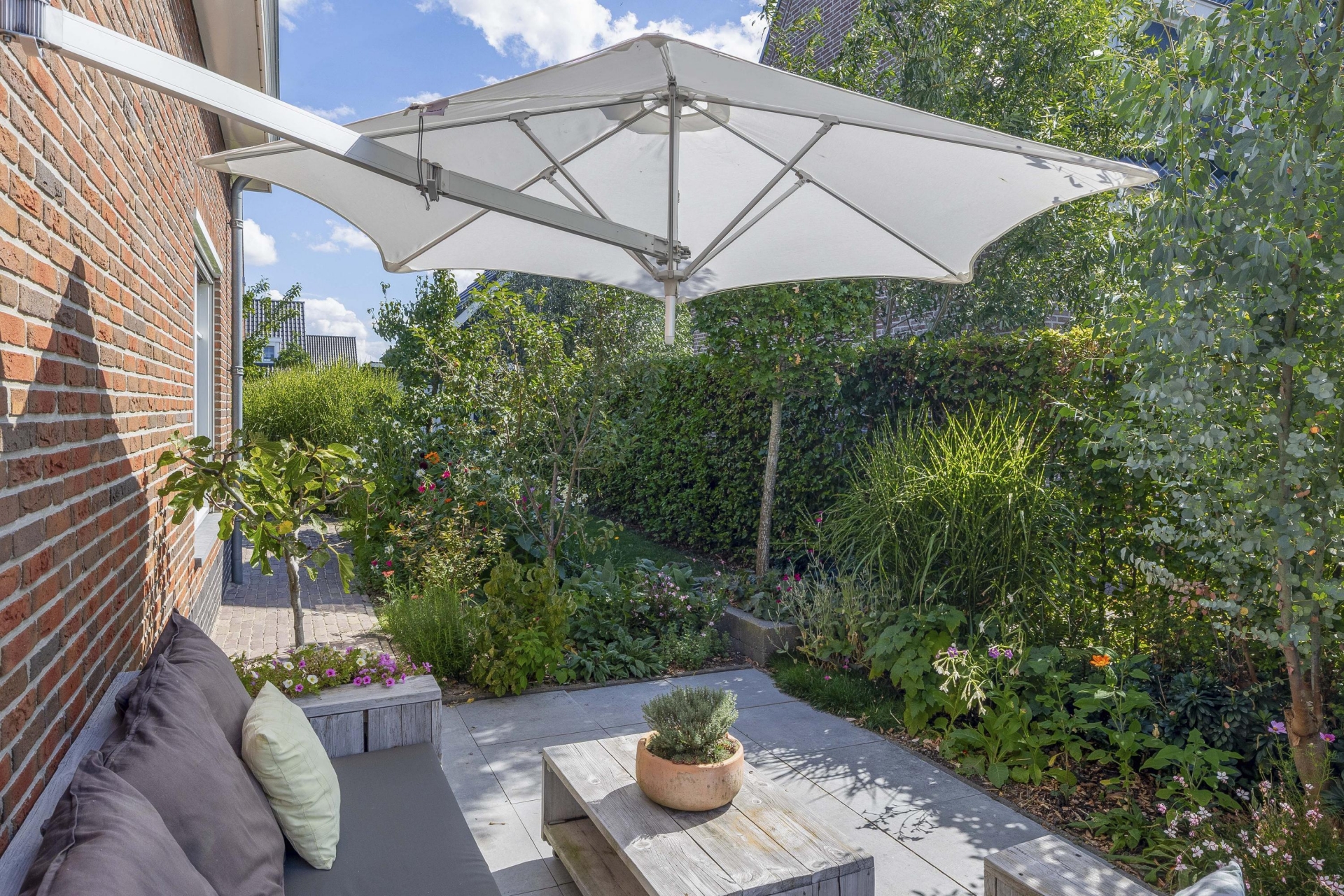 Buiten vind je rondom het huis een fraai aangelegde tuin met meerdere zitplekken, beplanting en een mooie balans tussen groen en bestrating. De achtertuin ligt gunstig voor de zon en is via meerdere deuren te bereiken. Of je nu wilt genieten van de ochtendzon of juist een fijne plek zoekt voor de BBQ in de avond: de tuin biedt altijd een geschikte hoek. Er is meer dan genoeg ruimte voor een loungeset, buitenkeuken of speeltoestellen voor kinderen. Achterin de tuin is een praktische berging en natuurlijk parkeer je je auto's gewoon op je eigen oprit.
