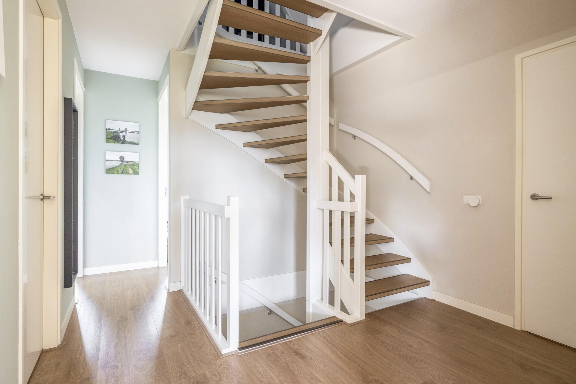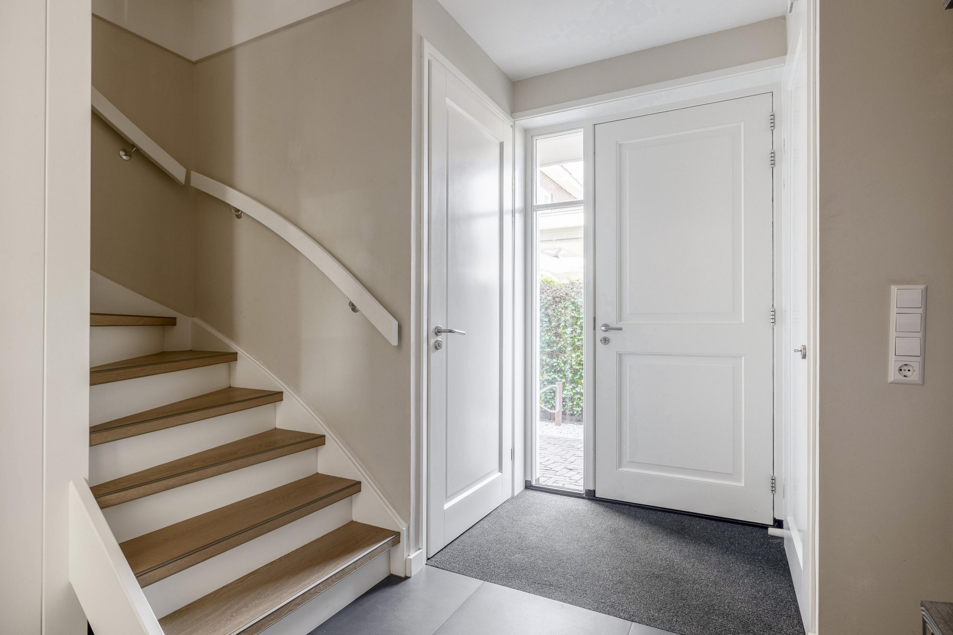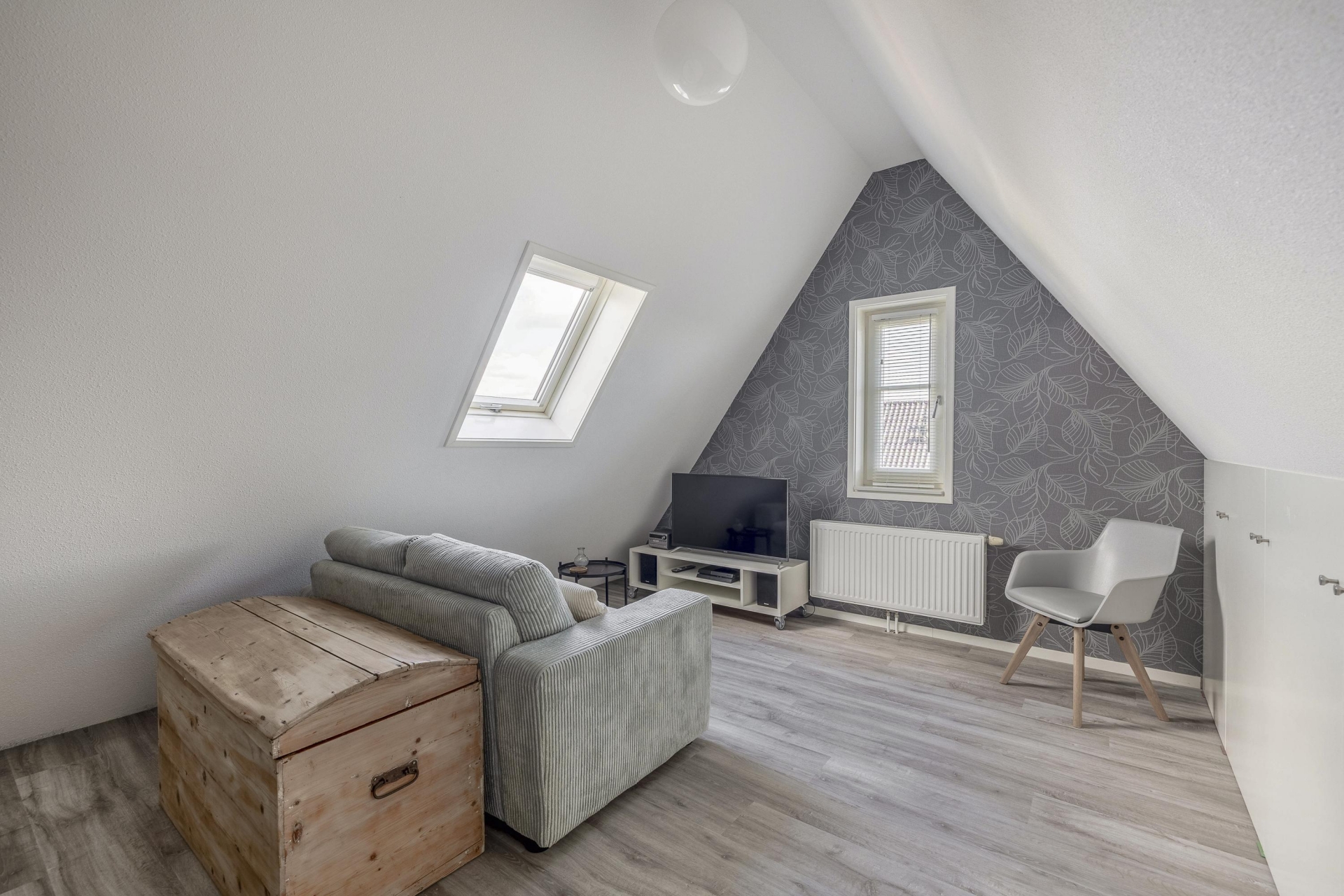 Wat direct opvalt als je binnenkomt? De ruimte en het licht. De woonkamer aan de voorzijde strekt zich uit over de volledige breedte van het huis en is ingericht met grote raampartijen aan meerdere zijden. Hierdoor komt het daglicht van alle kanten naar binnen. De eikenhouten vloer, strak gestucte wanden en warme kleuraccenten zorgen voor een huiselijke en moderne sfeer.