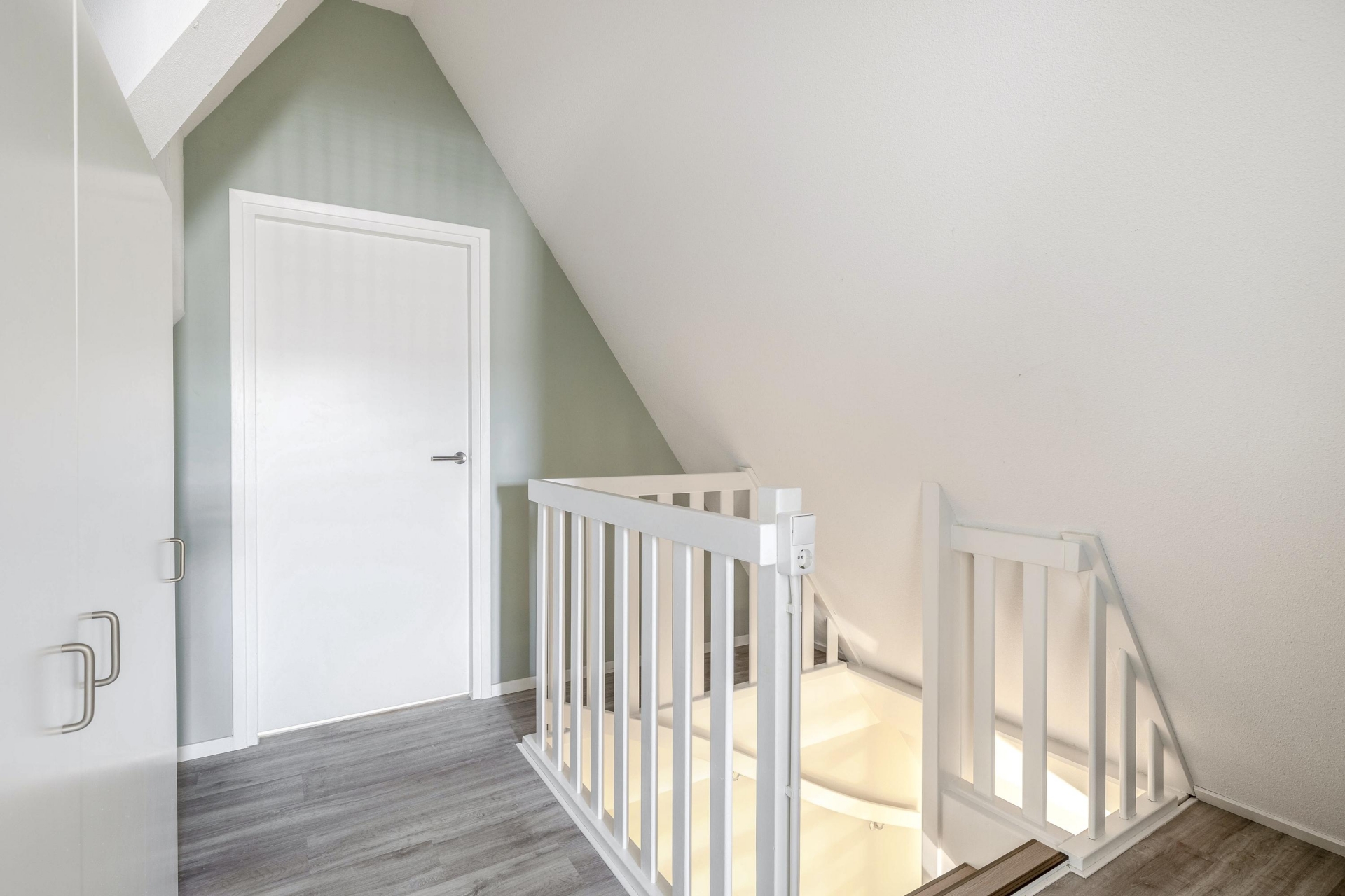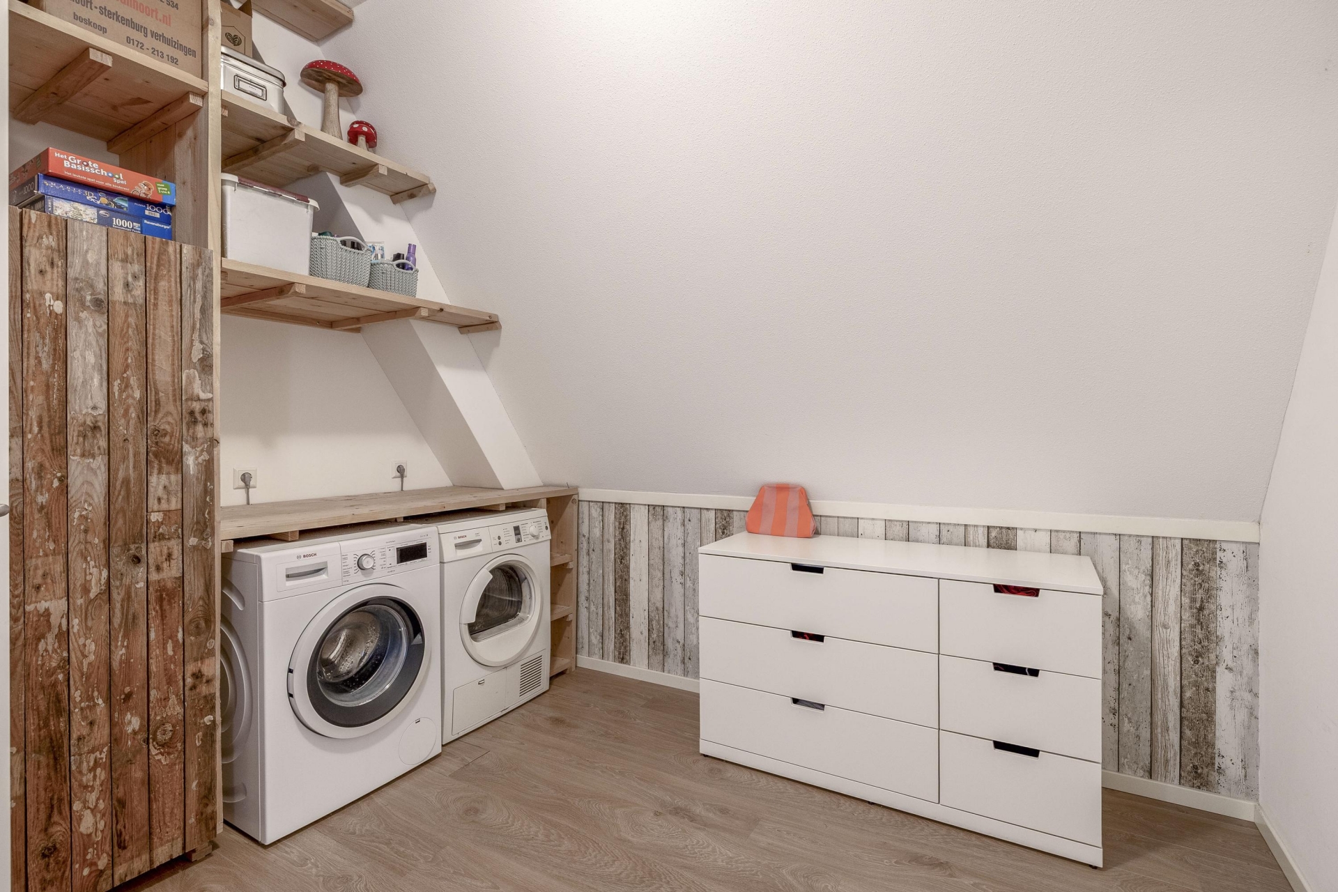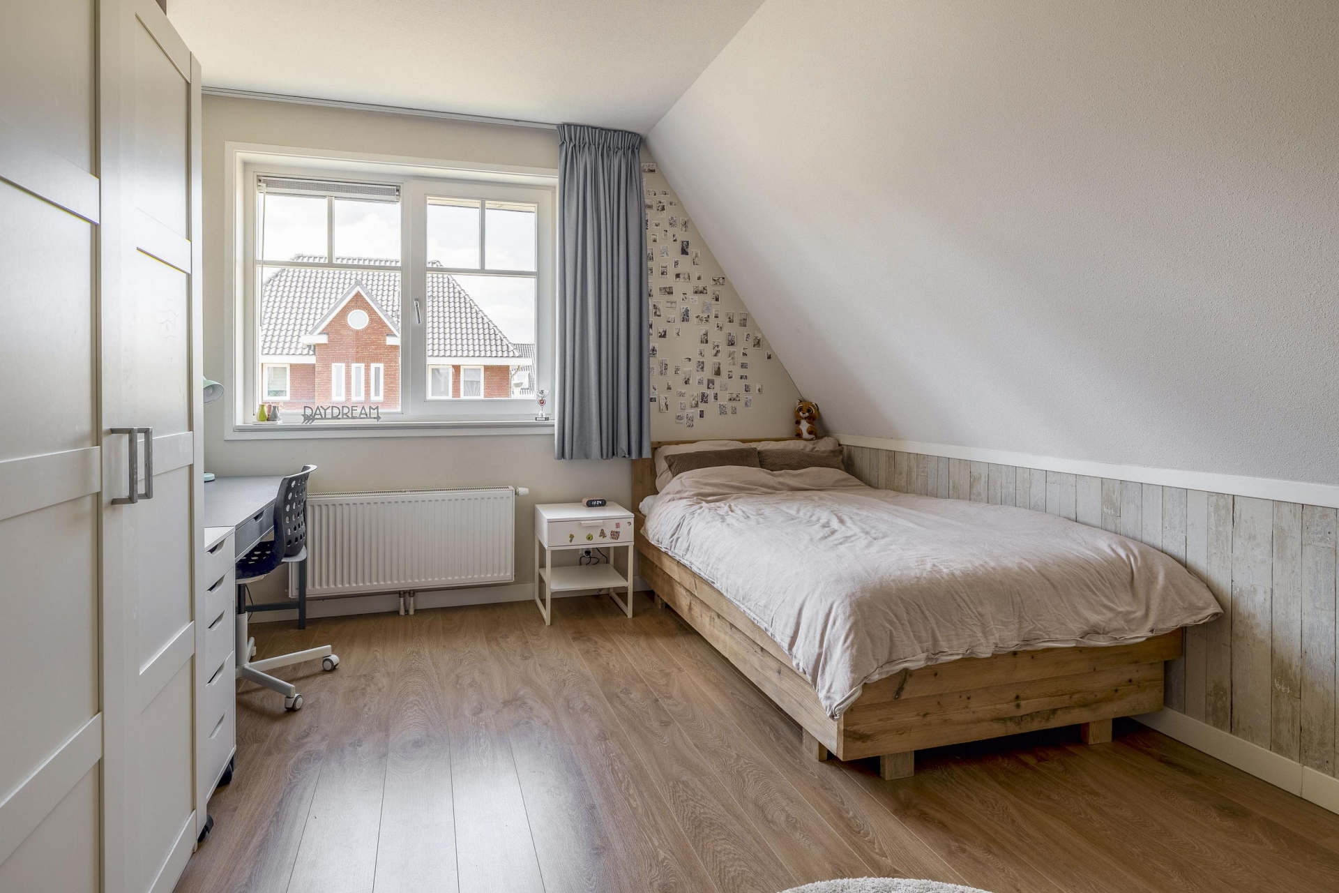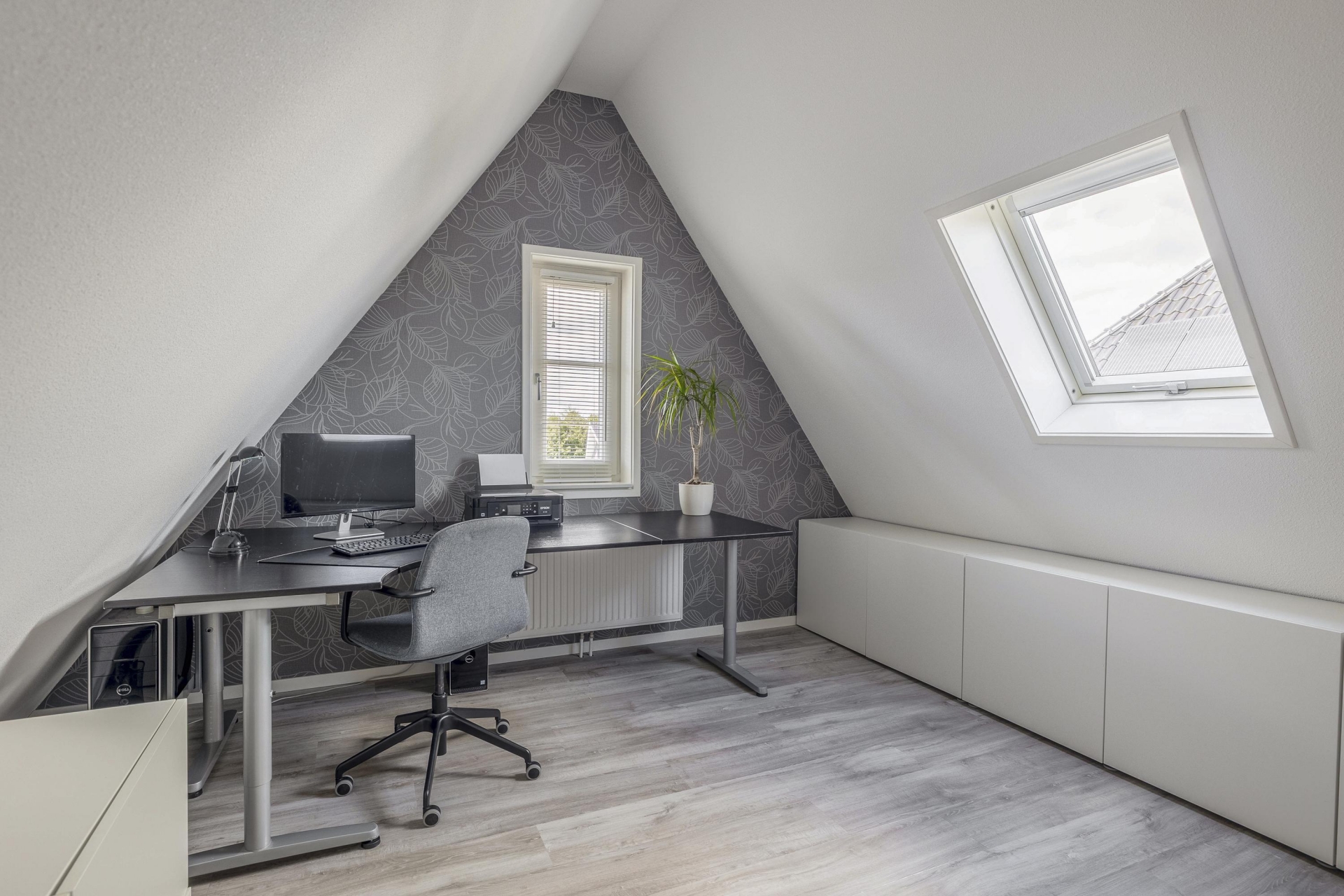 Wat direct opvalt als je binnenkomt? De ruimte en het licht. De woonkamer aan de voorzijde strekt zich uit over de volledige breedte van het huis en is ingericht met grote raampartijen aan meerdere zijden. Hierdoor komt het daglicht van alle kanten naar binnen. De eikenhouten vloer, strak gestucte wanden en warme kleuraccenten zorgen voor een huiselijke en moderne sfeer.