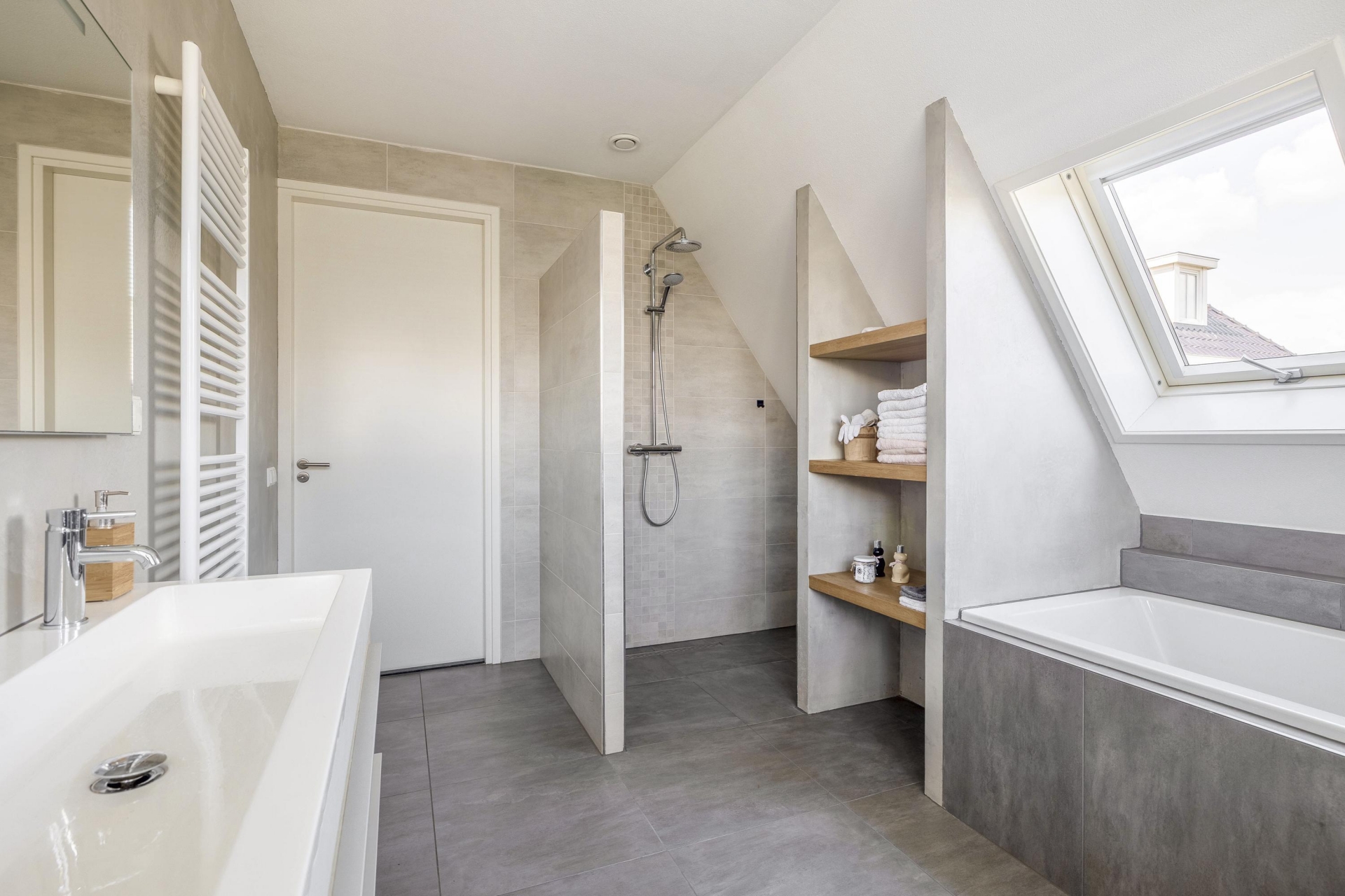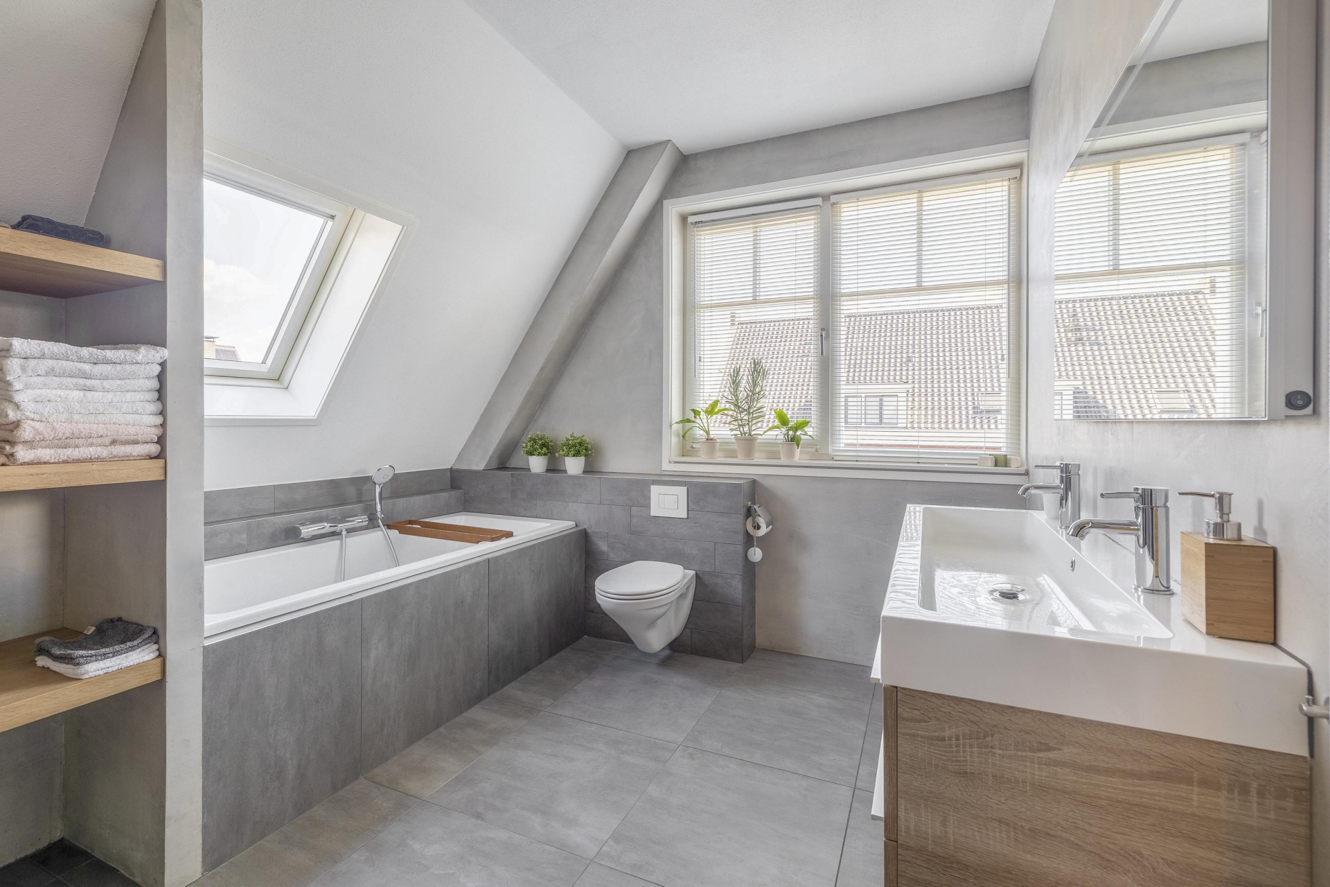 De eerste verdieping telt drie ruime slaapkamers, waarvan de grootste zich aan de achterzijde bevindt en uitzicht biedt op de tuin. De andere twee kamers aan de voorzijde zijn perfect als kinderkamer, logeerkamer of werkkamer. De badkamer is eigentijds afgewerkt met een inloopdouche, ligbad, dubbel wastafelmeubel en een tweede toilet.