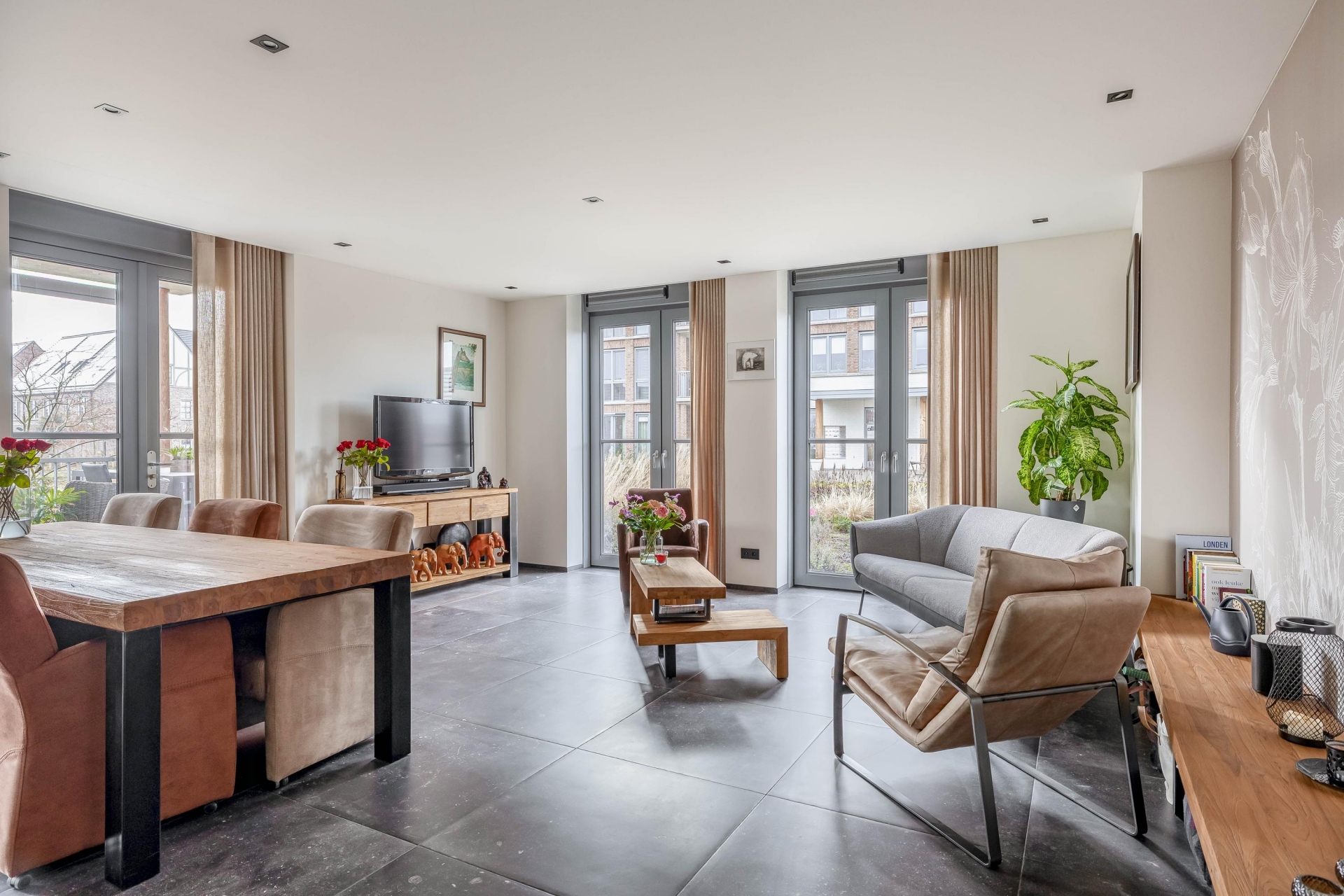 De woonkamer is royaal opgezet en opvallend licht dankzij de grote raampartijen en dubbele deuren naar het terras. De hoge ramen met HR+++ glas zorgen niet alleen voor veel daglicht, maar ook voor uitstekende isolatie. De strakke keramische tegelvloer met vloerverwarming (door het hele appartement) geeft een moderne en rustige basis. De indeling is praktisch en comfortabel. Er is veel ruimte voor een royale eettafel én een ruime zithoek. De huidige opstelling laat mooi zien hoe je hier gezellig kunt tafelen met vrienden of rustig kunt genieten van een goed boek met uitzicht naar buiten.