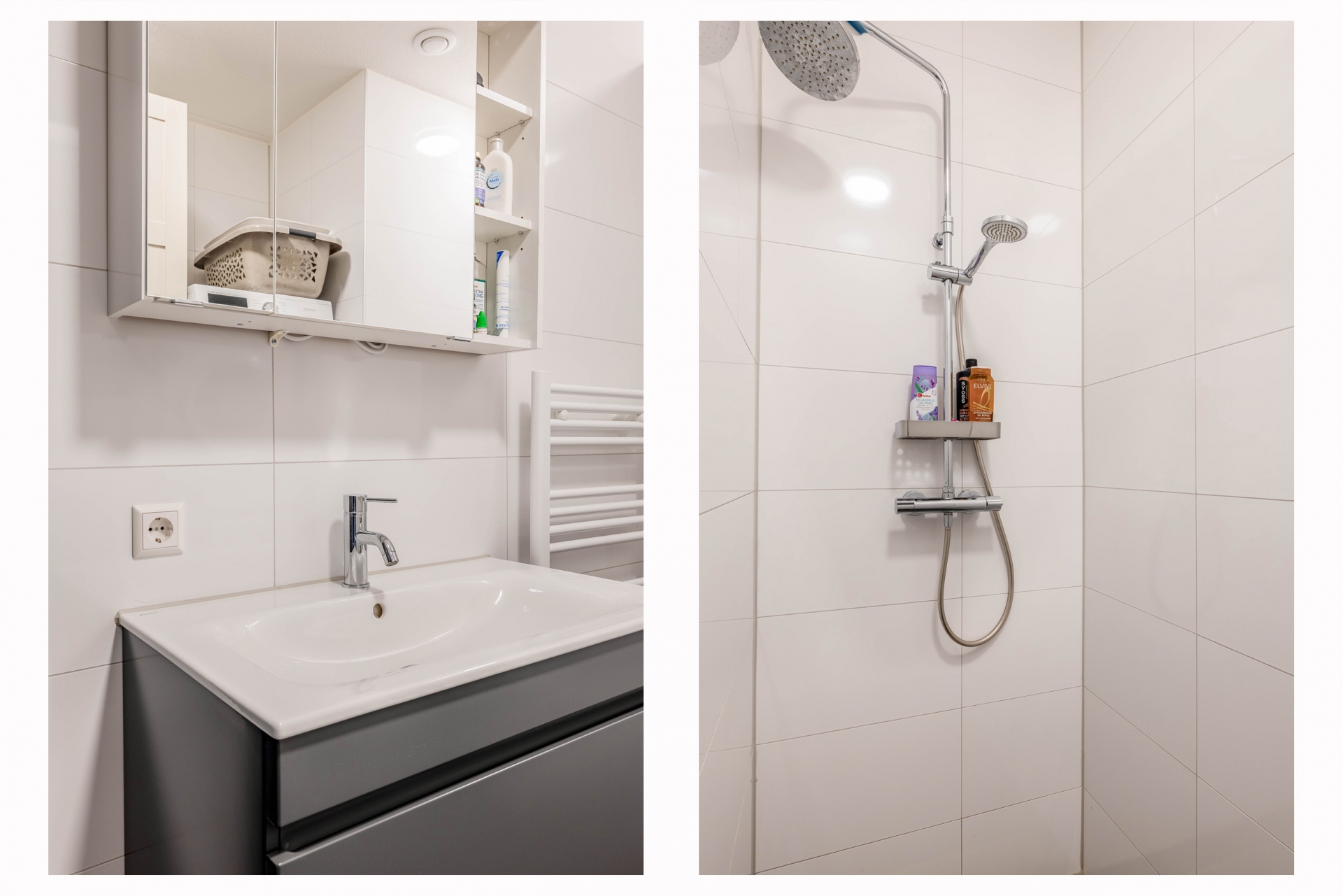 De badkamer is modern en volledig betegeld in lichte tinten. Voorzien van een ruime inloopdouche, tweede toilet, strak wastafelmeubel en wasmachine- en drogeraansluiting. Alles is nieuw en fris, precies wat je verwacht bij een appartement uit 2024. Daarnaast is er een separaat toilet aanwezig. Ook hier zie je de zorgvuldige afwerking.