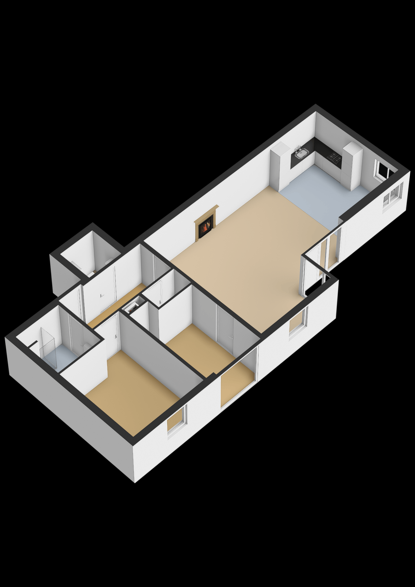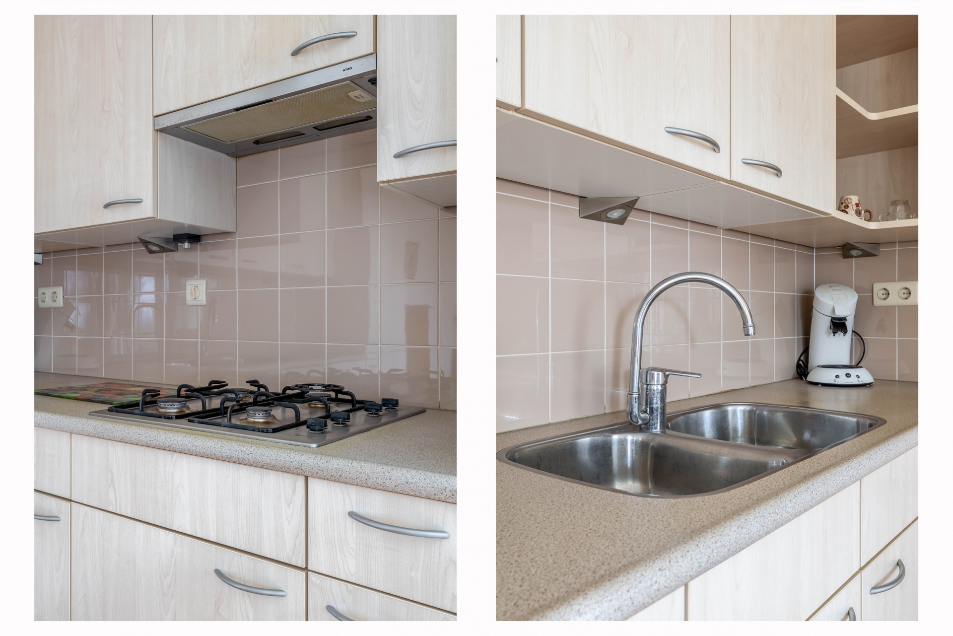 De open keuken sluit direct aan op de woonkamer en is praktisch ingedeeld. Hier kook je met zicht op de leefruimte, wat het geheel gezellig en betrokken maakt. De keuken biedt voldoende werk- en kastruimte en is functioneel opgezet voor dagelijks gebruik.