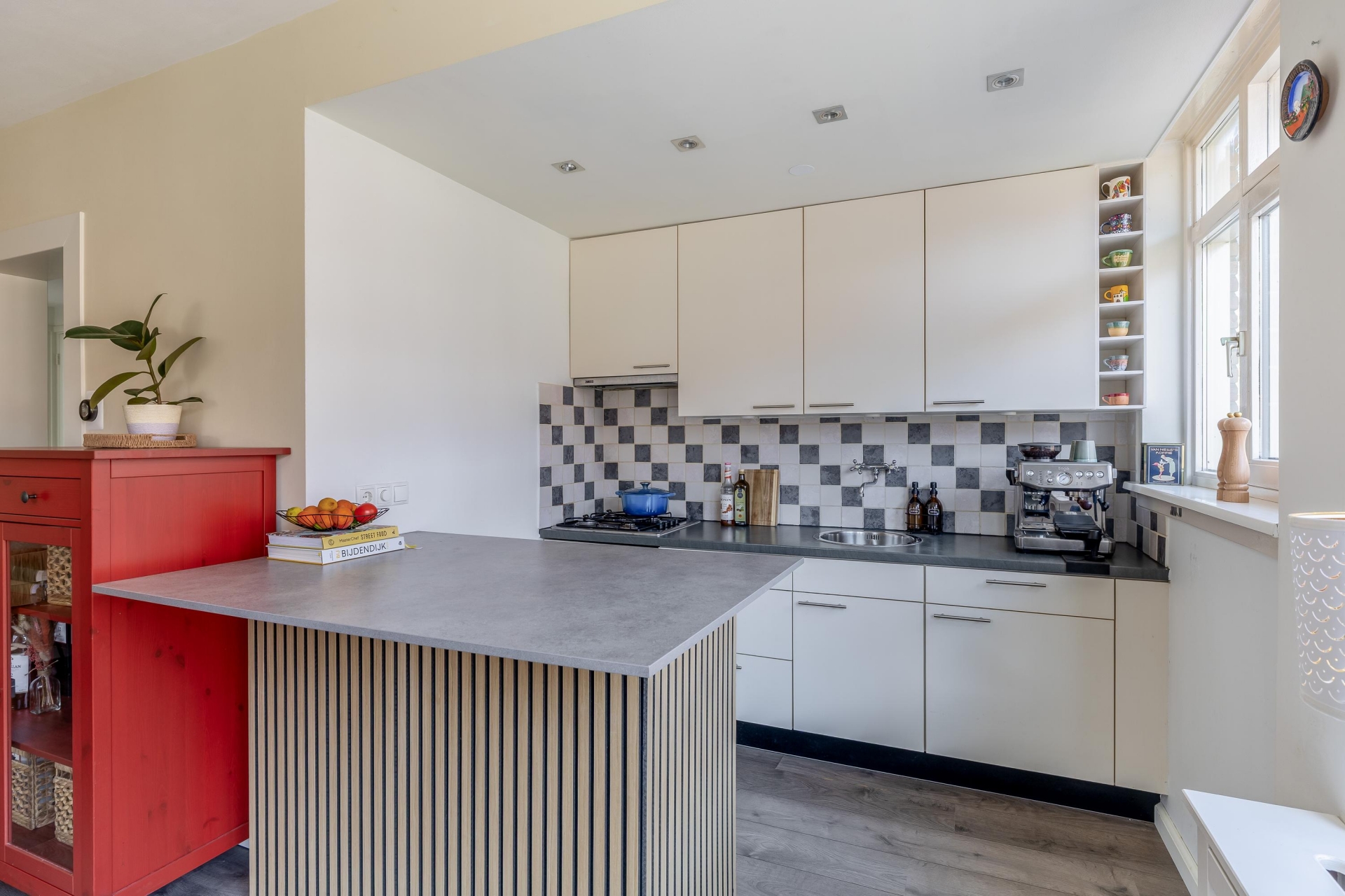 De woonkamer staat in verbinding met de keuken, waardoor de ruimte praktisch en overzichtelijk blijft. Of je nu een avondje op de bank ontspant of vrienden uitnodigt voor een etentje, hier kun je alle kanten op. De neutrale afwerking maakt het eenvoudig om het appartement helemaal naar jouw eigen smaak in te richten. De keuken is functioneel ingericht en beschikt over voldoende werk- en opbergruimte. Je hebt hier alles bij de hand om dagelijks te koken, terwijl je toch in contact blijft met de rest van de leefruimte. Dat maakt het een fijne plek waar koken en gezelligheid samenkomen.