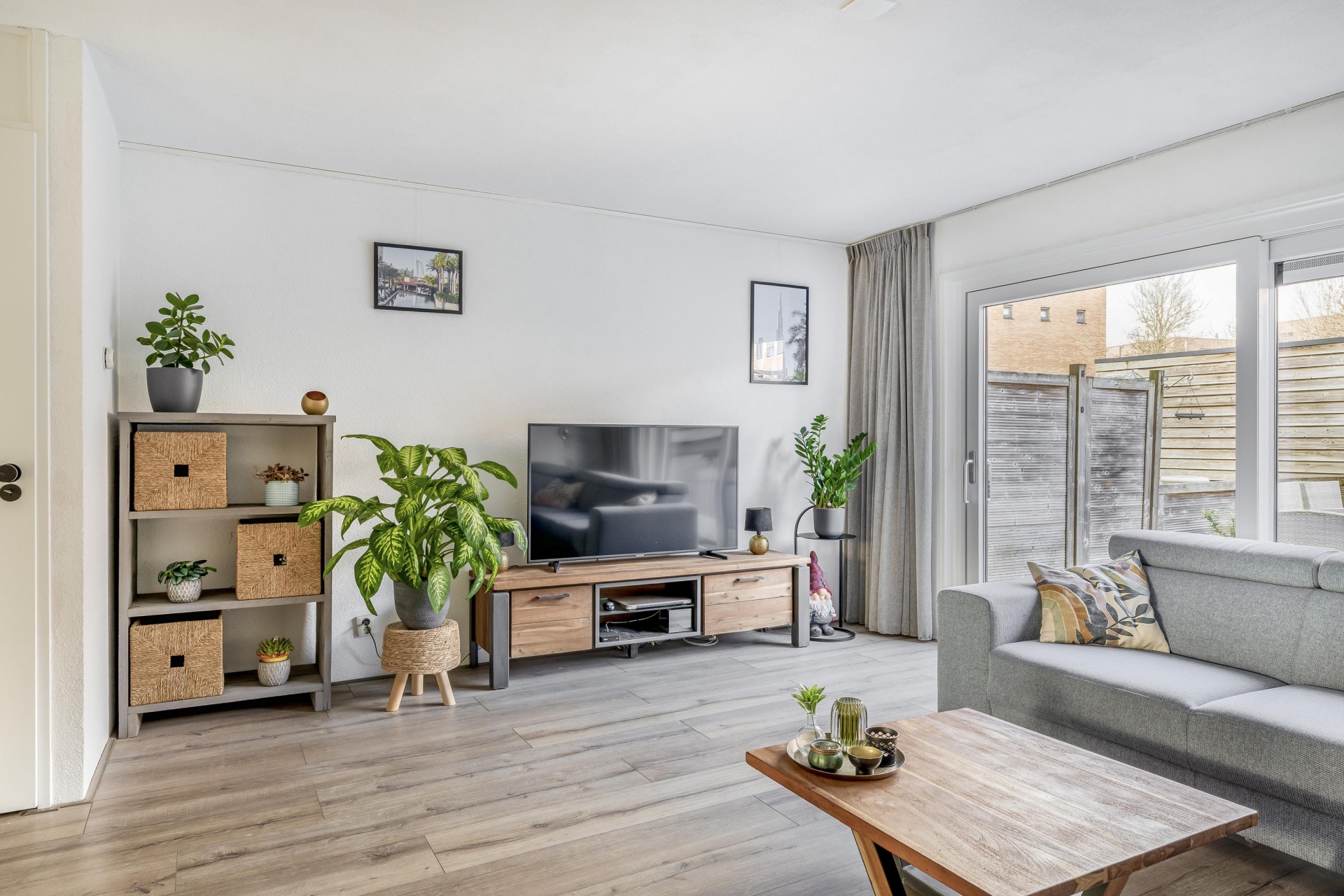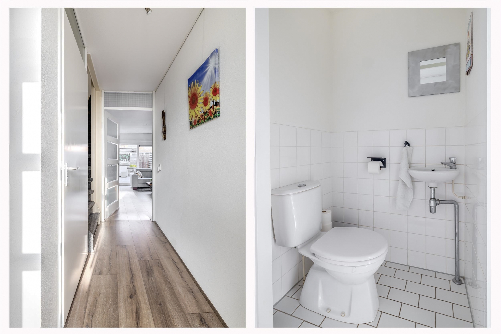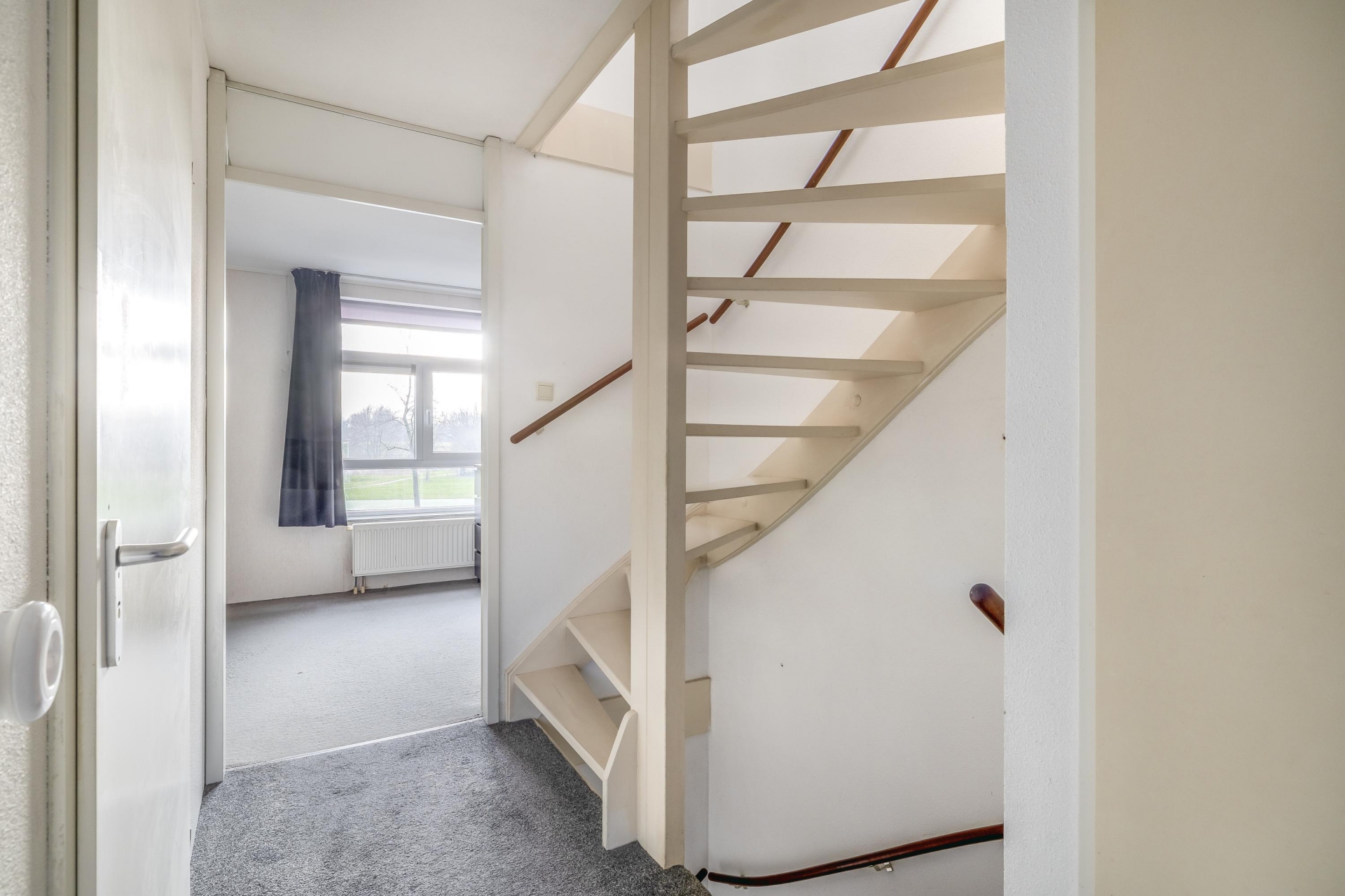 Ruime entreehal met garderobe, meterkast en toiletruimte voorzien van closet en fonteintje. De lichte woonkamer beschikt over een trapkast, open keuken en een grote kunststof schuifpui die toegang geeft tot de achtertuin en zorgt voor veel natuurlijke lichtinval.