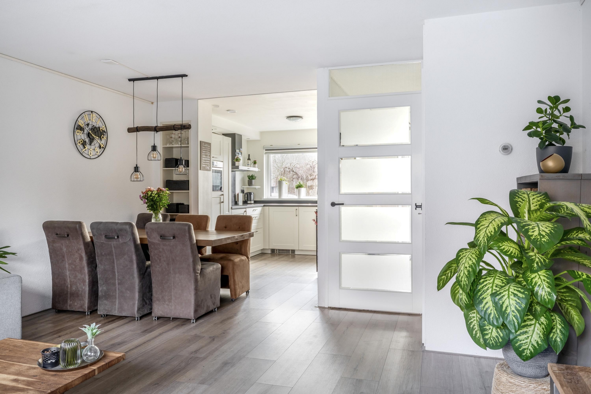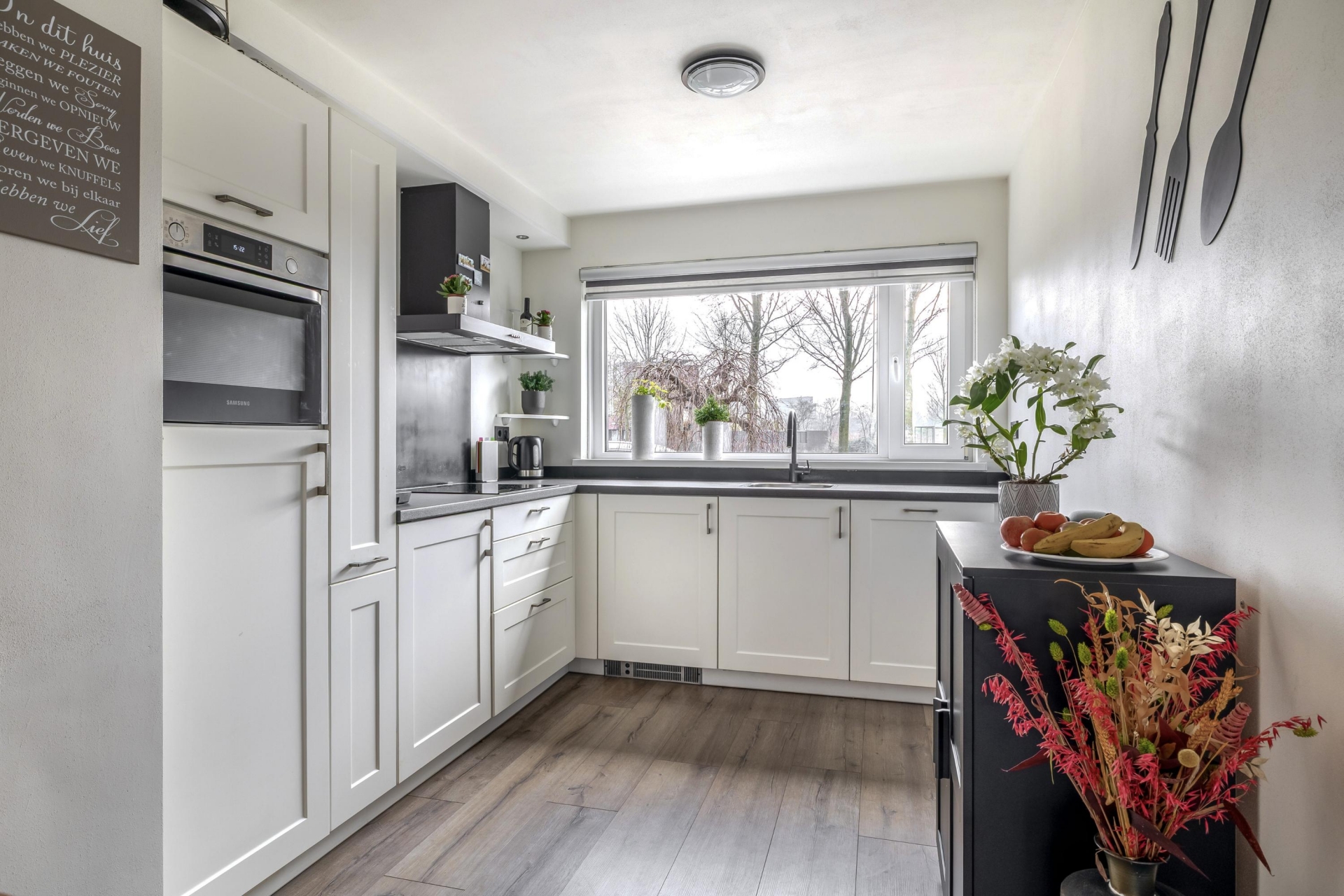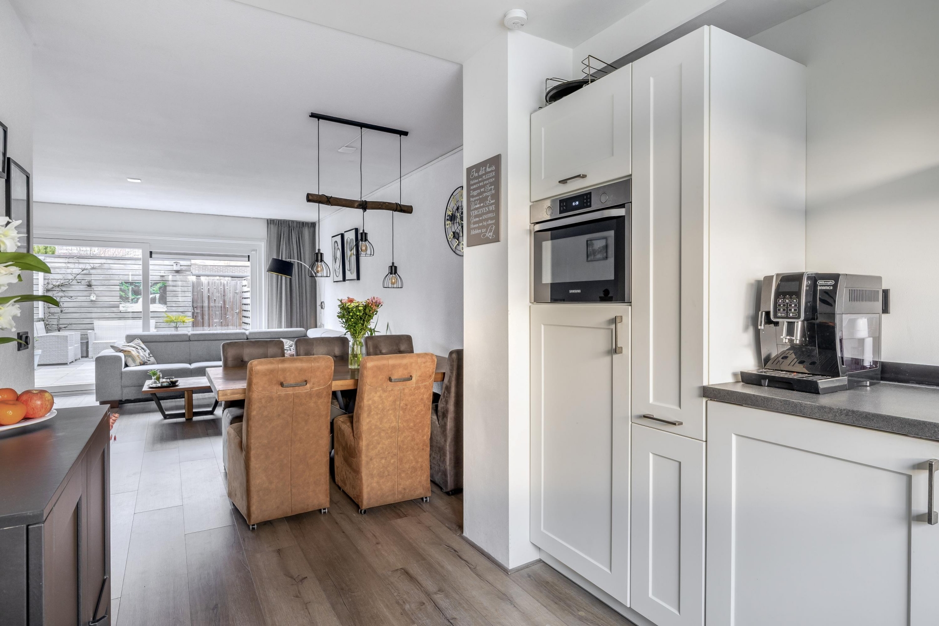 De open keuken aan de voorzijde is uitgevoerd in een hoekopstelling en voorzien van diverse inbouwapparatuur, waaronder een vaatwasser, combi-oven, inductiekookplaat, afzuigkap, koelkast en een aparte vriezer.