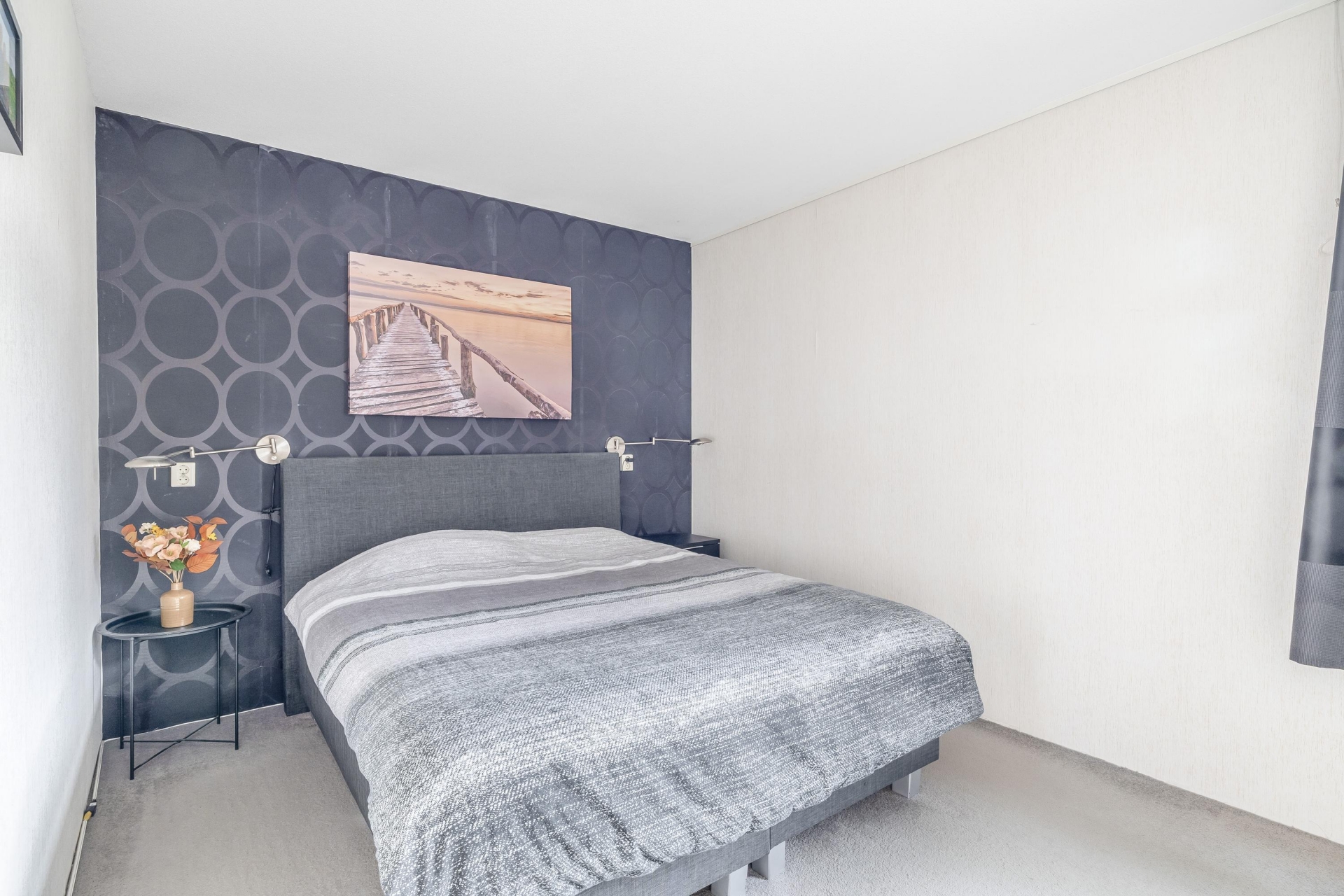 Overloop met ruime hoofdslaapkamer aan de voorzijde van de woning. Moderne, vernieuwde badkamer (2022) voorzien van een inloopdouche, wastafel met meubel en spiegel en een tweede toilet.