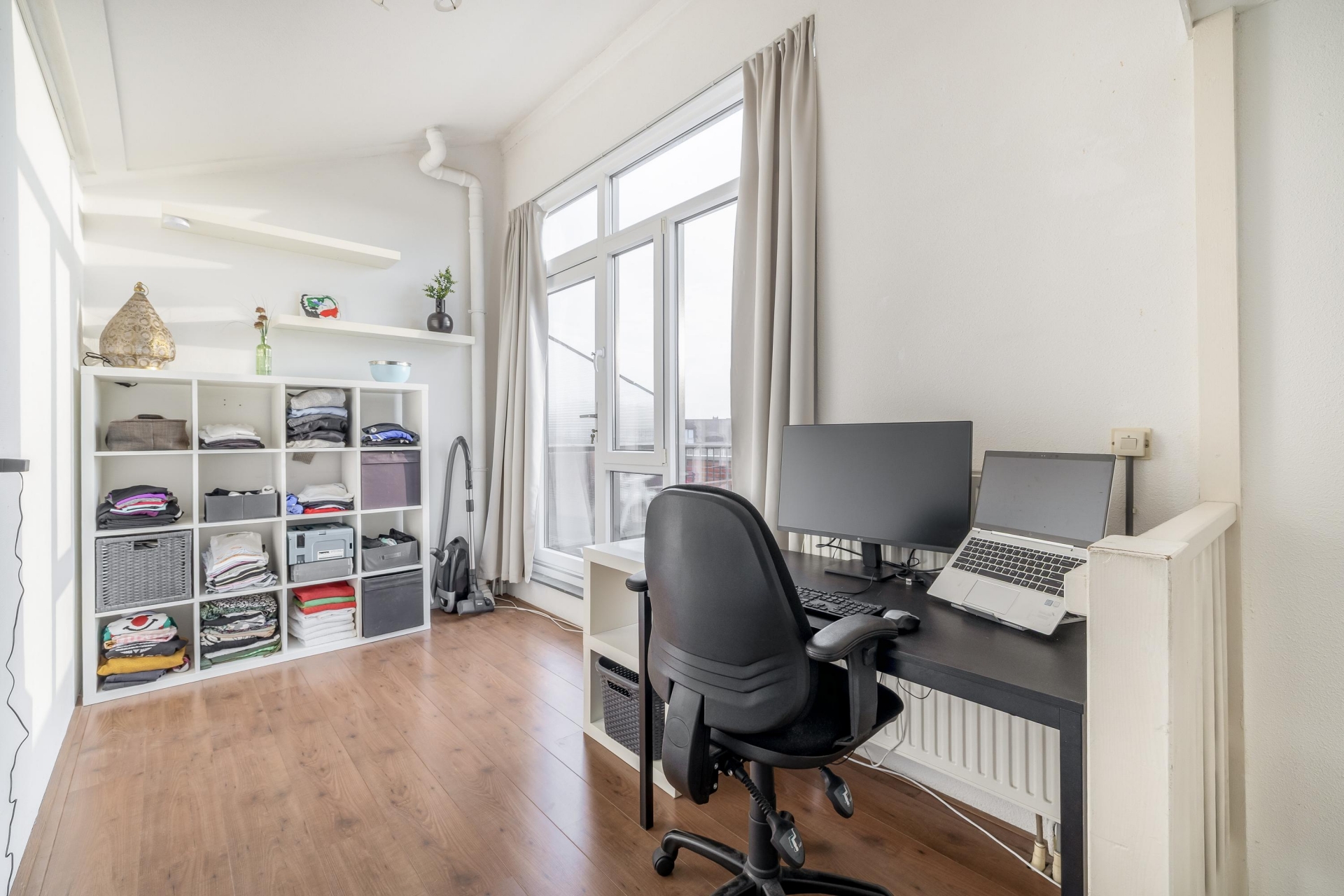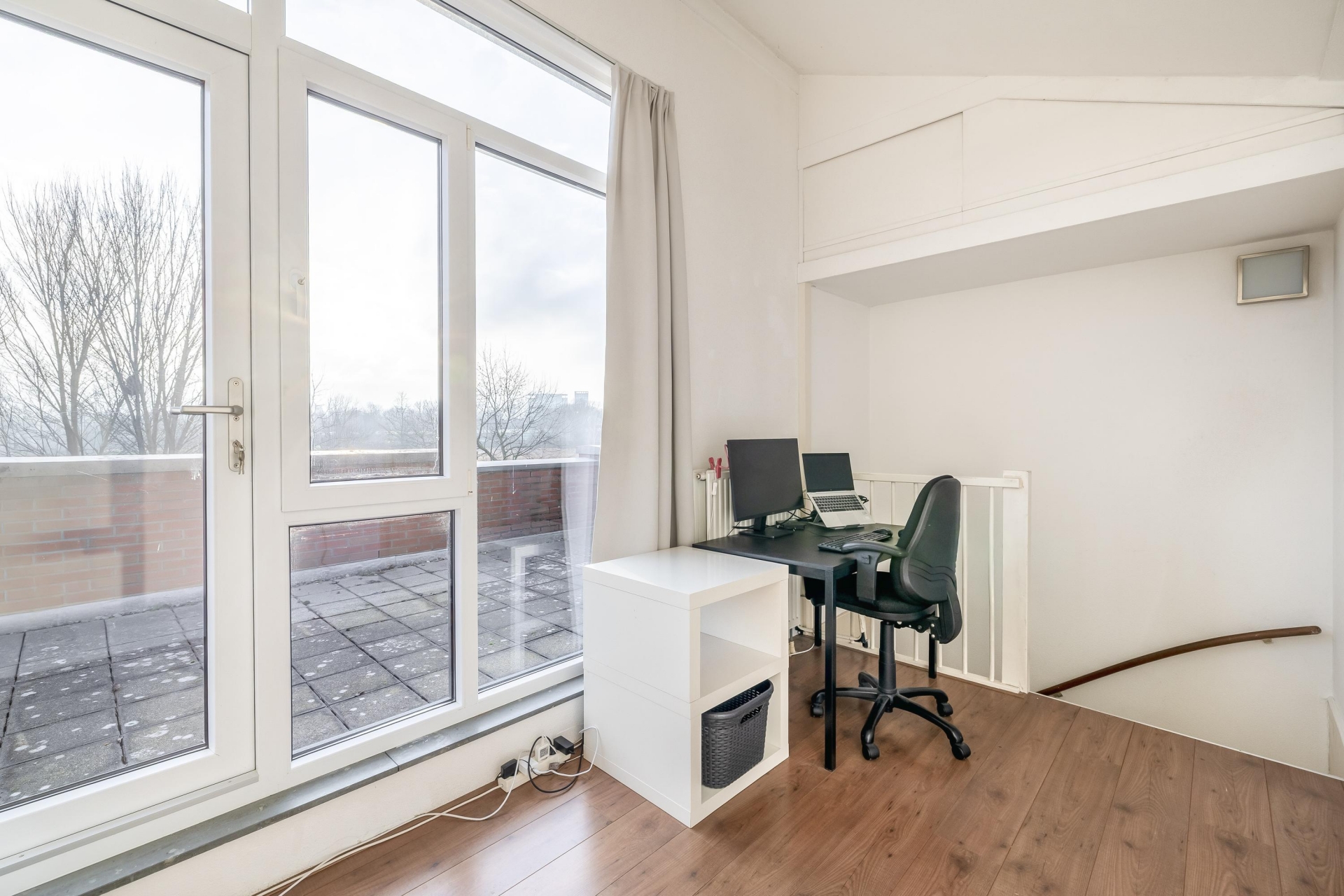 Ruime overloop met toegang tot het zonnige dakterras aan de voorzijde, met vrij uitzicht over de groenvoorzieningen en speeltuinen. De vierde slaapkamer is voorzien van een dakkapel aan de achterzijde en toegang tot een bergkast met de opstelplaats voor de cv-combiketel, mechanische ventilatie, wasmachine en droger.