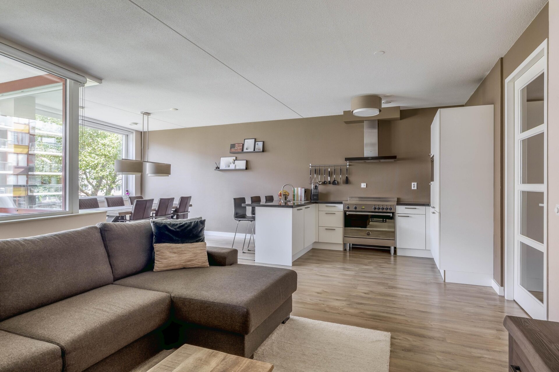 APPARTEMENT: Je komt het appartement binnen in een nette, ruime hal die toegang geeft tot alle ruimtes in huis. De lichte en ruime woonkamer vormt het hart van het appartement. Dankzij de open keuken blijf je altijd in contact met de rest van het gezin of jouw gasten. De moderne keuken is uitgevoerd in een neutrale kleurstelling en compleet ingericht met onder andere een strak elektrisch inductie fornuis met zeer ruime oven van het merk Bertazzoni. De keuken is verder voorzien van een afzuigkap, magnetron, vaatwasser en ruime spoelbak. Het composieten aanrechtblad loopt bewust verder door dan de onderliggende kasten zodat er gezellig aan de bar gegeten kan worden. De keuken bevat alles wat je nodig hebt voor dagelijks gemak én sfeervol koken. De huidige bewoners hebben het appartement verduurzaamd en zijn afgestapt van koken op gas. Dit is gerealiseerd door een 3-Fasen aansluiting in de meterkast. De badkamer is modern en ruim; voorzien van een inloopdouche en dubbel wastafelmeubel. Het aparte toilet met fonteintje is praktisch geplaatst in de hal.