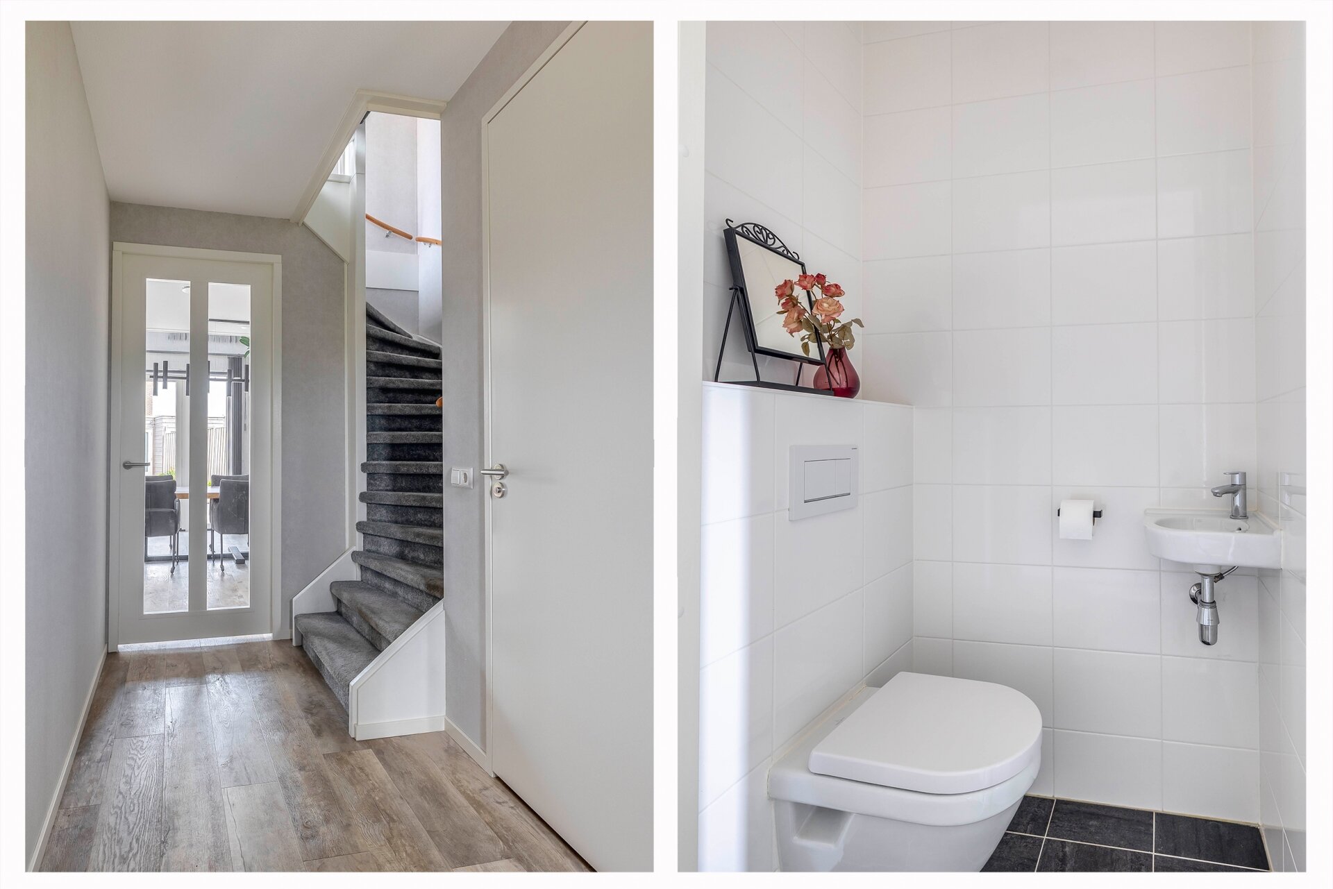 Via de voordeur betreedt u de ruime entree van waar alle vertrekken eenvoudig bereikbaar zijn. Hier bevinden zich de meterkast, het toilet, geheel betegeld met fonteintje en de trapopgang naar de eerste verdieping. Verder bevindt zich op de begane grond de royale, lichte en ruime woonkeuken met volop ruimte voor een grote eettafel, zodat u hier heerlijk met familie en vrienden kunt dineren.