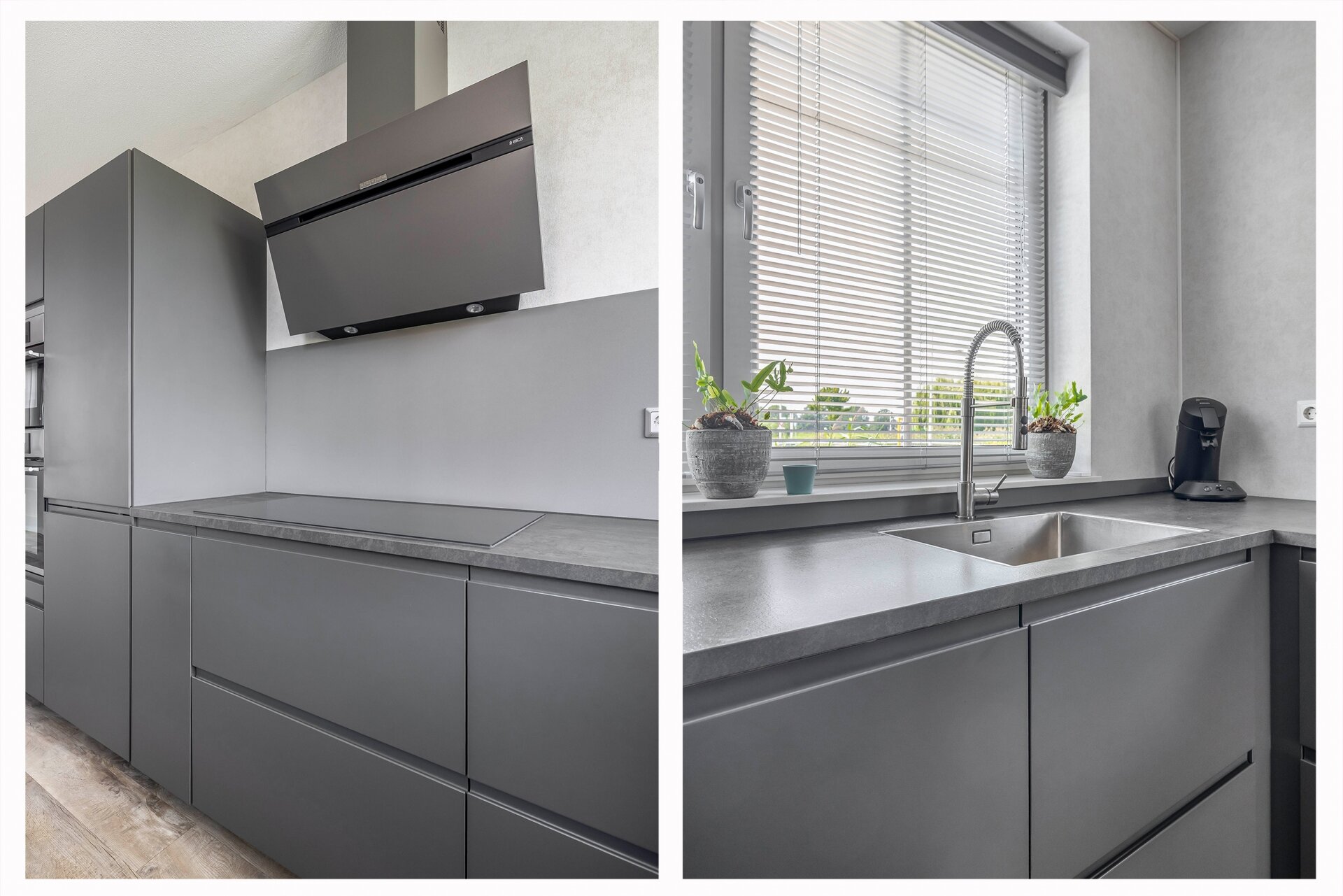 De keuken is gesitueerd aan de voorzijde van de woning en is een U-opstelling. De ruime keuken is voorzien van diverse inbouwapparatuur zoals heteluchtoven, combimagnetron, Boretti inductie kookplaat, wandafzuigkap, vaatwasser, hoge inbouwkoelkast en een hoge inbouw vriezer.