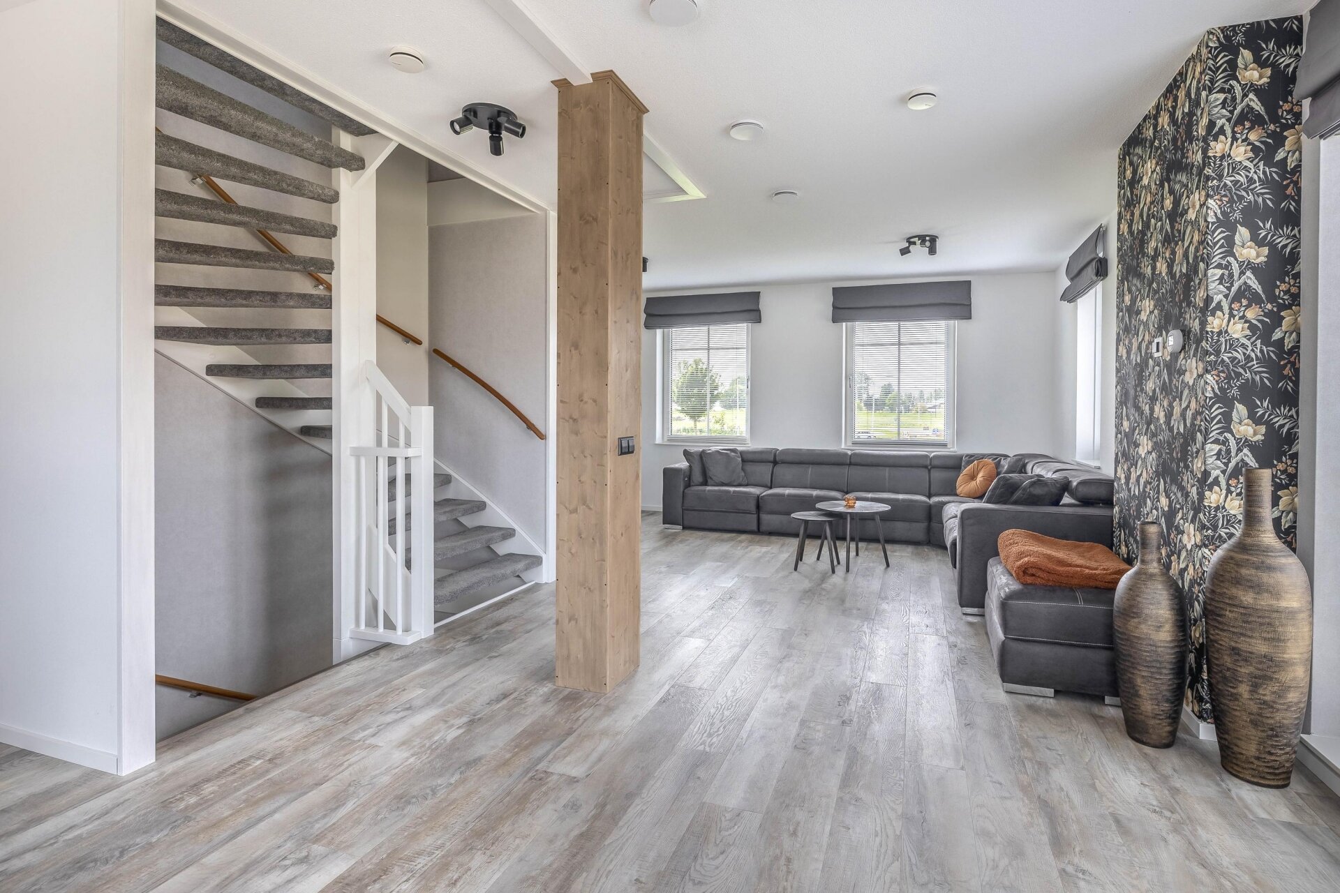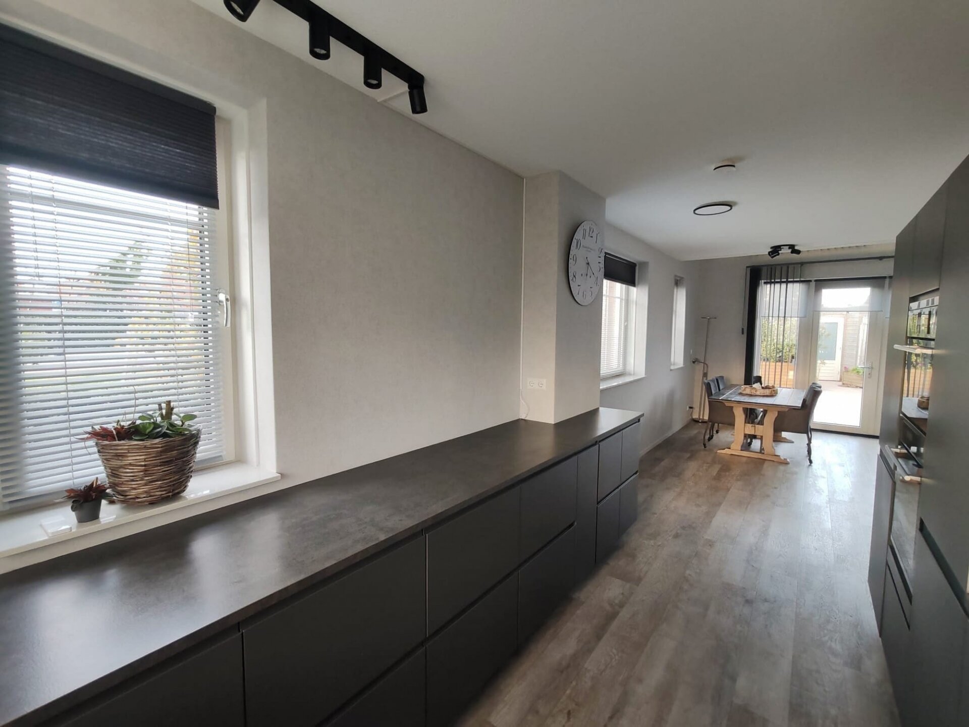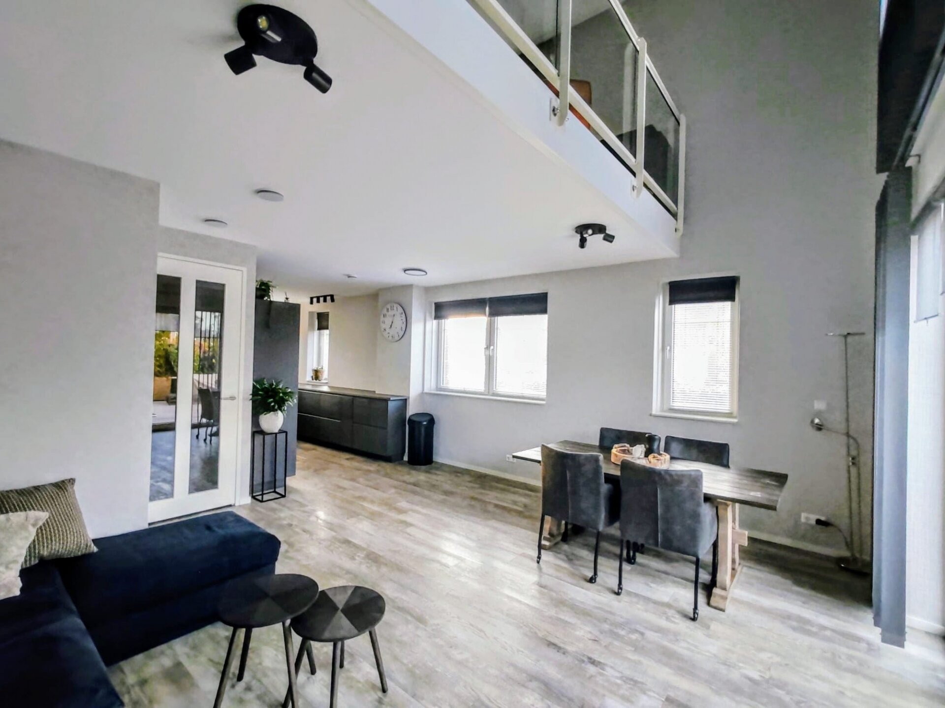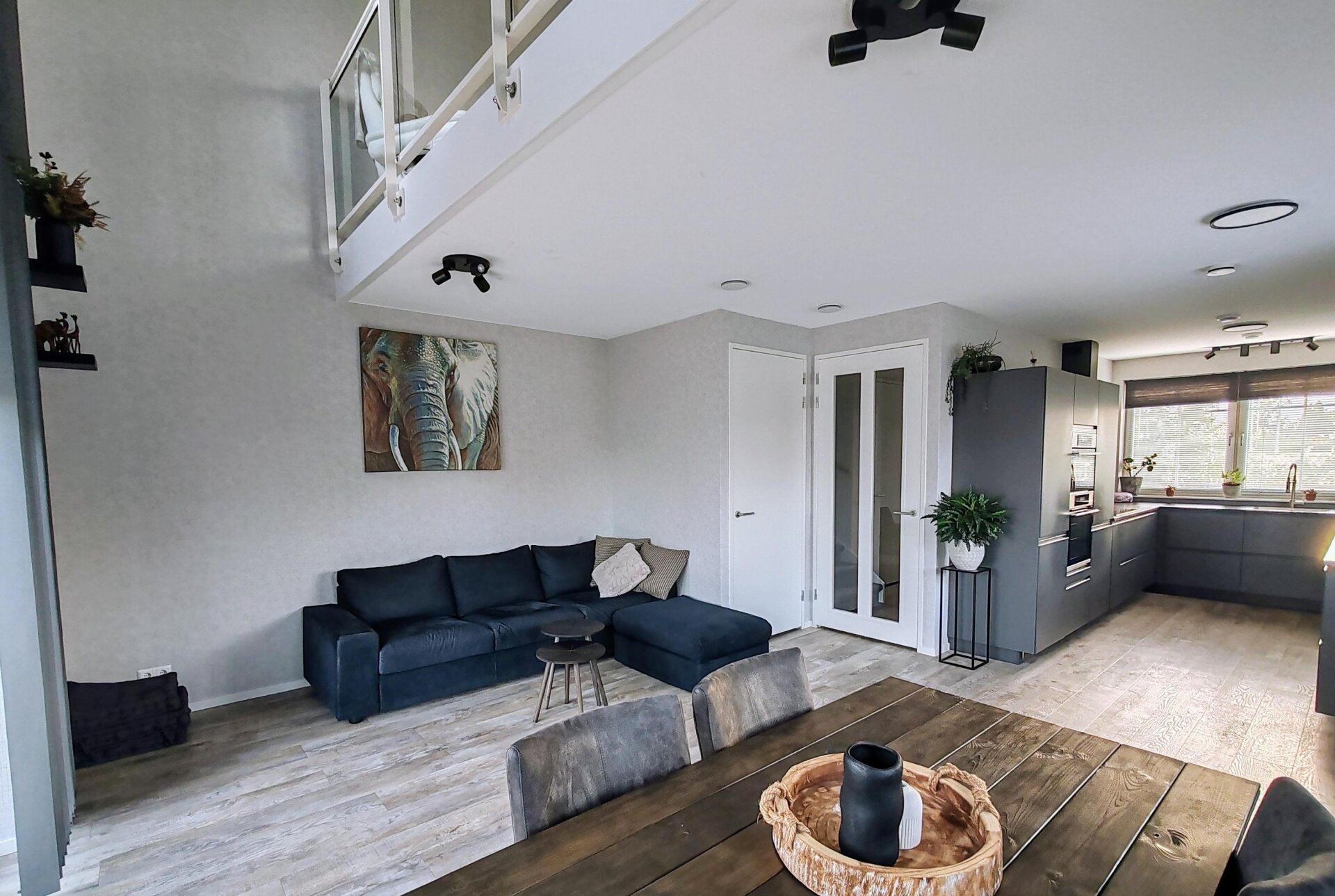 Vanuit de woonkeuken is er een directe verbinding met de ruime en lichte woonkamer op de eerste verdieping door de woningbrede vide, die zorgt voor extra lichtinval en een ruimtelijk gevoel.