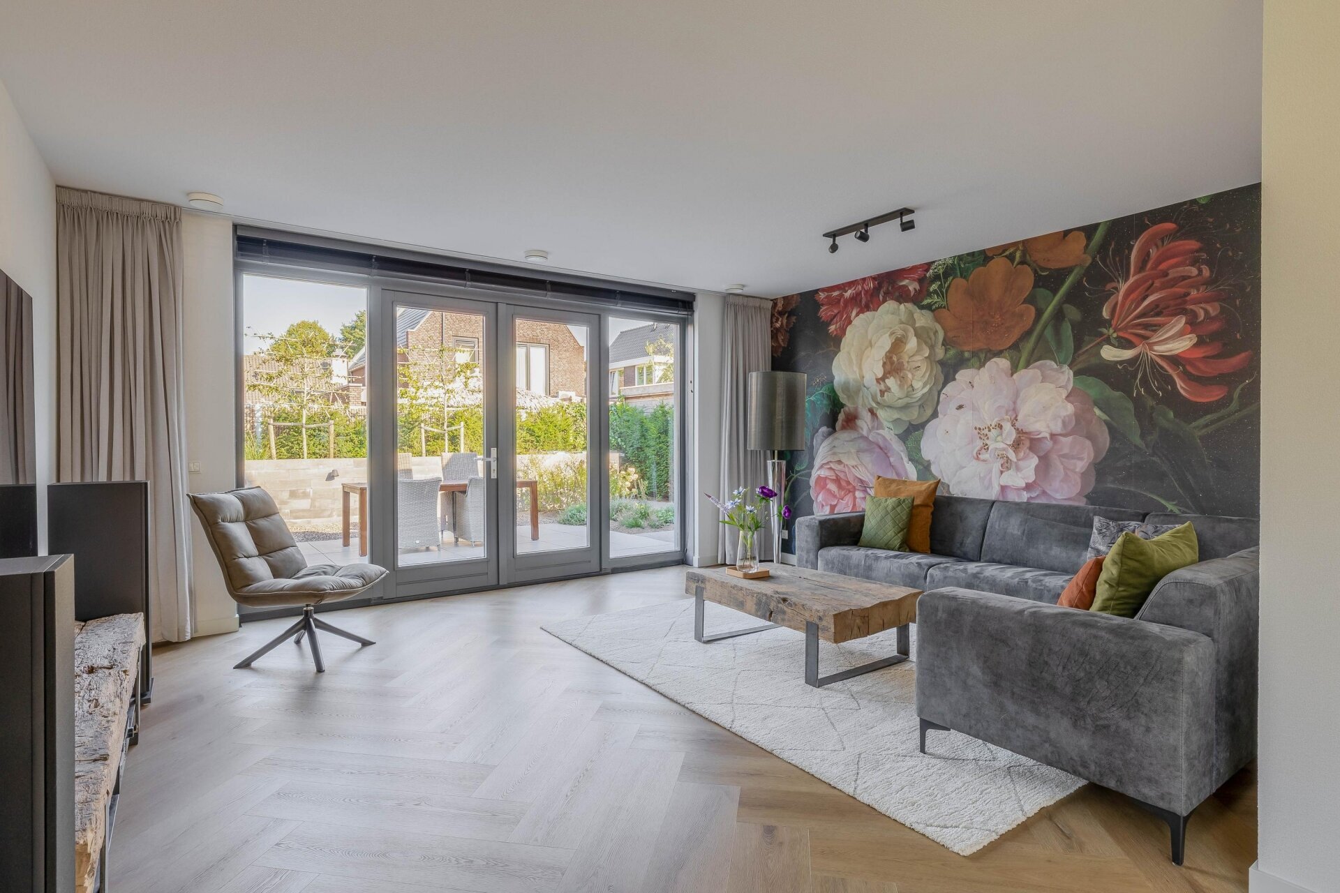 Binnenkomend in de ruime hal valt meteen de stijlvolle afwerking op: gestuukte wanden, een visgraat pvc-vloer en zwarte stalen binnendeuren. De woonkamer is tuingericht, met openslaande deuren naar het terras. Dankzij de grote raampartijen komt er volop natuurlijk licht binnen.