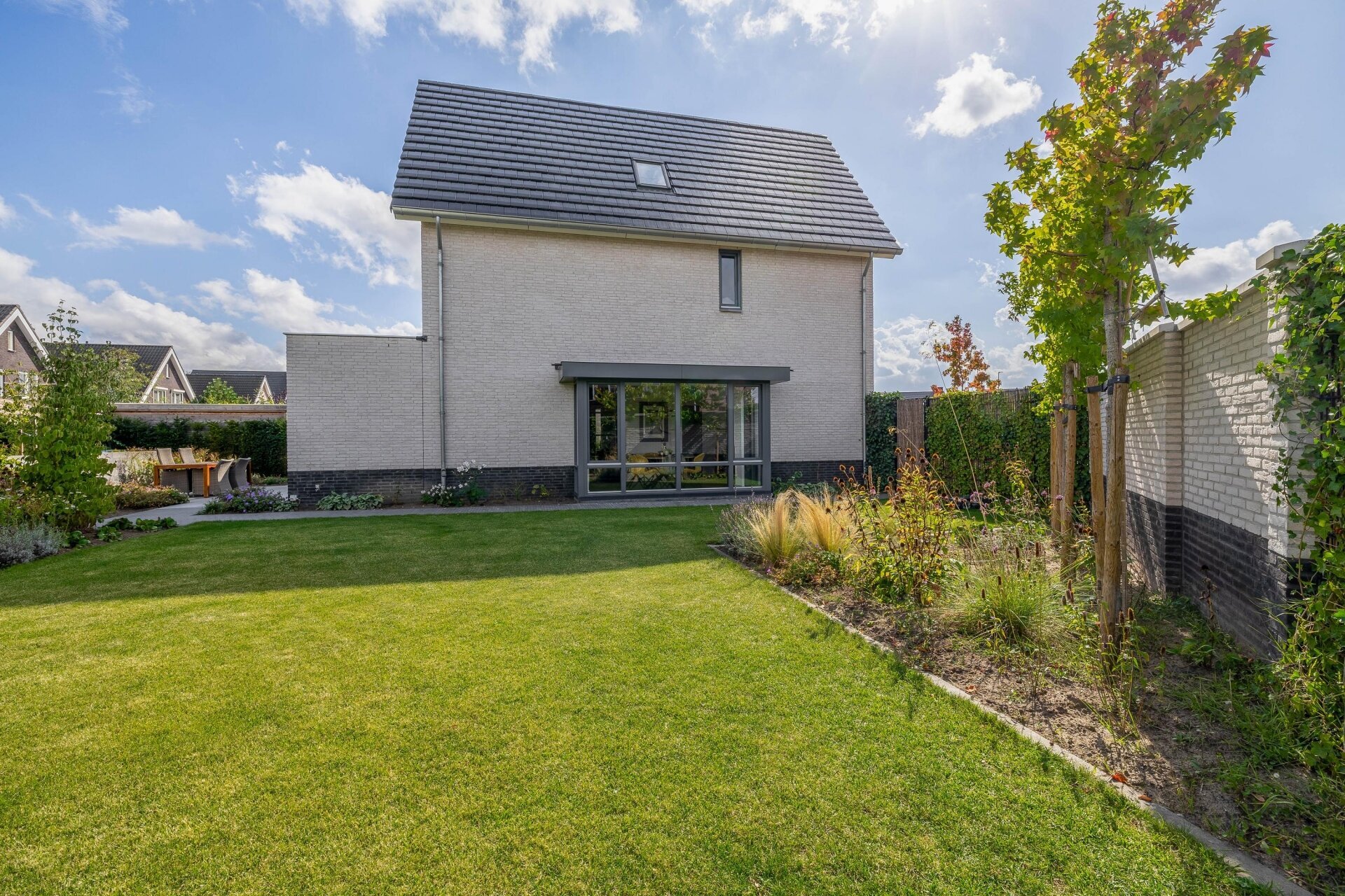 De tuin is modern aangelegd met meerdere terrassen, een strak gazon en volwassen beplanting. Er staat geen aparte berging in de tuin, maar dankzij de aangebouwde garage heb je voldoende praktische opbergruimte. De brede oprit biedt plaats aan circa vier auto’s op eigen terrein.