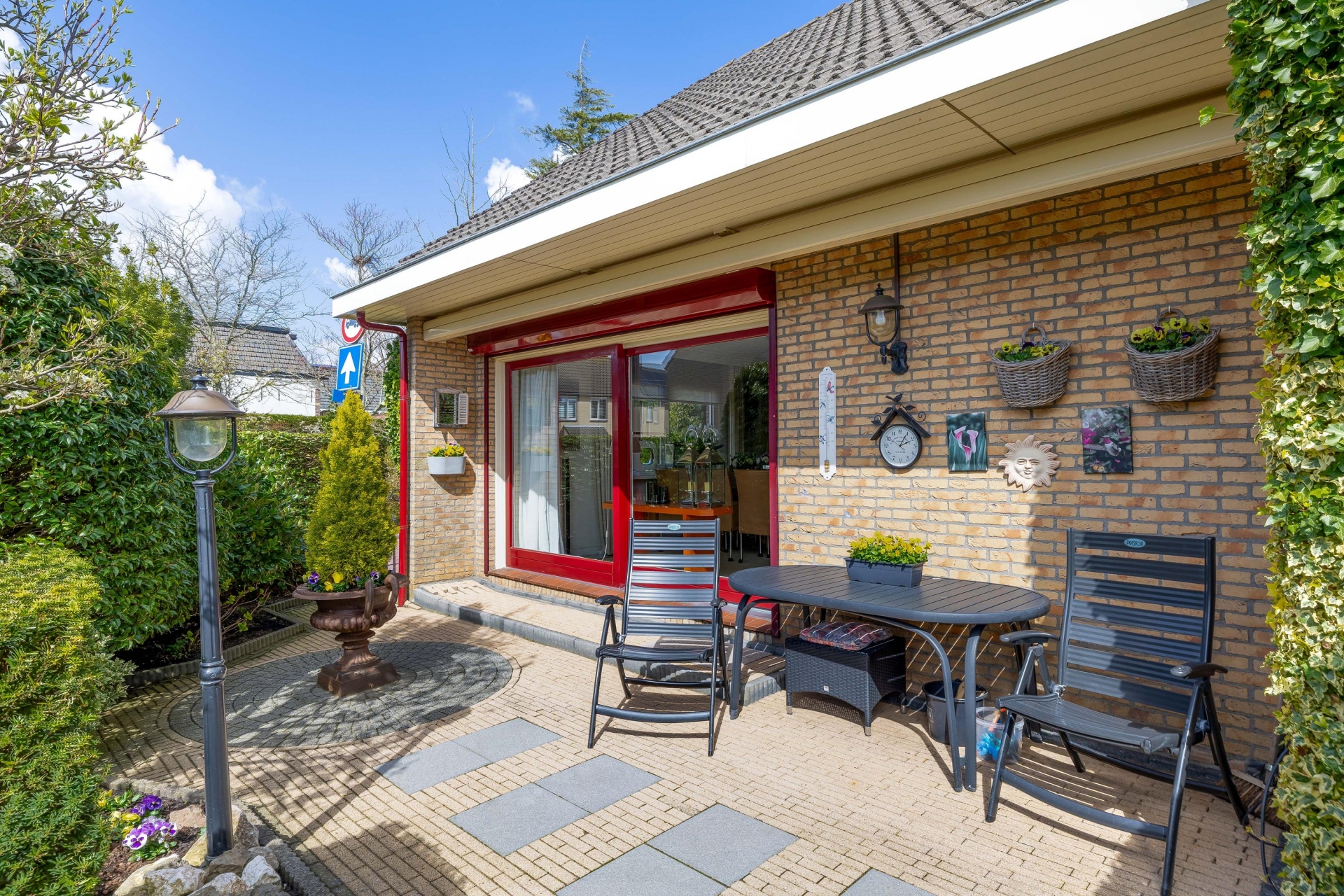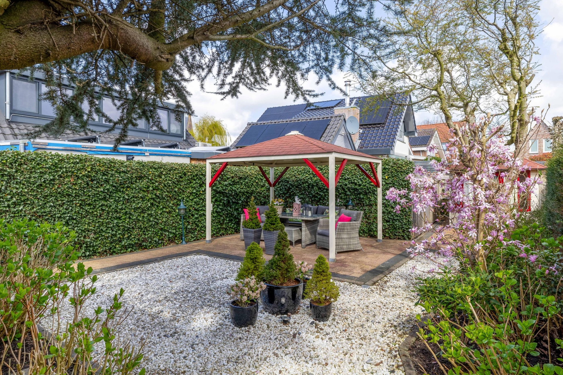 Rondom het huis ligt een fraai aangelegde tuin die met zorg is onderhouden. Er zijn meerdere plekken gecreëerd om te zitten, waardoor je op ieder moment van de dag een fijne plek hebt in de zon of schaduw.