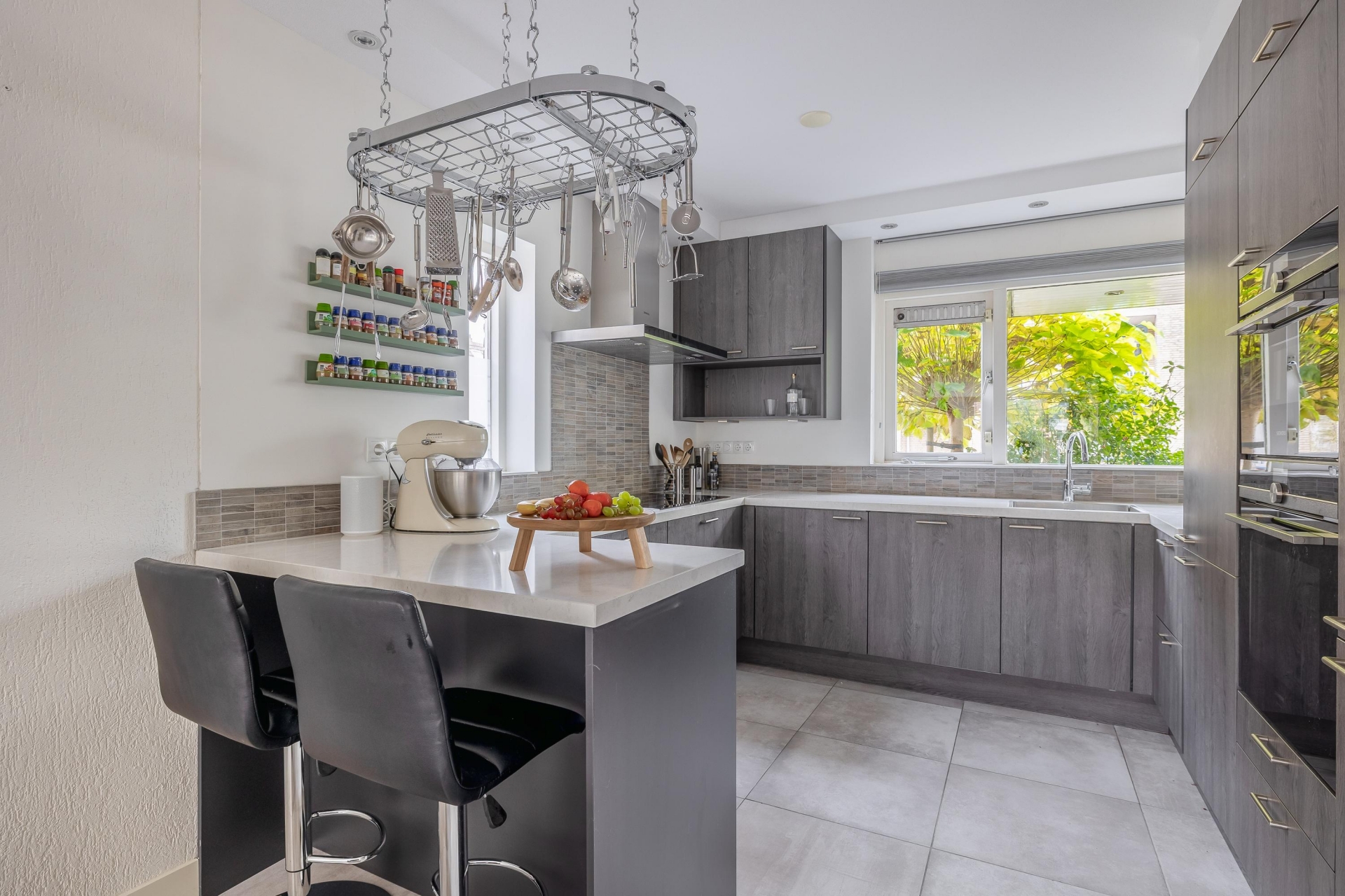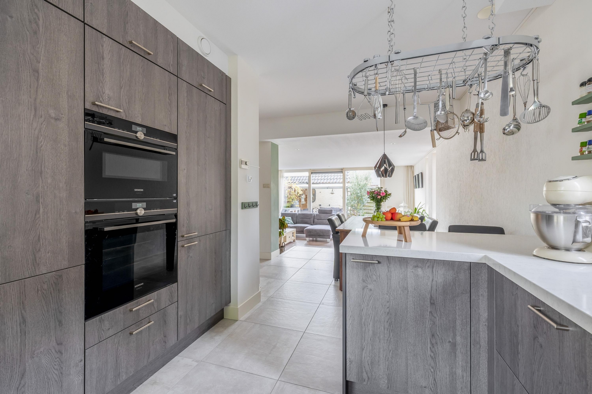 Entree via de verzorgde voortuin. Hal met meterkast en toiletruimte met fonteintje. De sfeervolle doorzonwoonkamer beschikt over een verlaagd plafond met inbouwspots en een grote schuifpui naar de zonnige achtertuin. Aan de voorzijde bevindt zich de moderne open keuken is voorzien van diverse Siemens studio line inbouwapparatuur, waaronder een koel-/vriescombinatie, stoomoven, combi-oven, vaatwasser, inductiekookplaat en afzuigkap. De keuken beschikt tevens over een praktisch bar-gedeelte.
