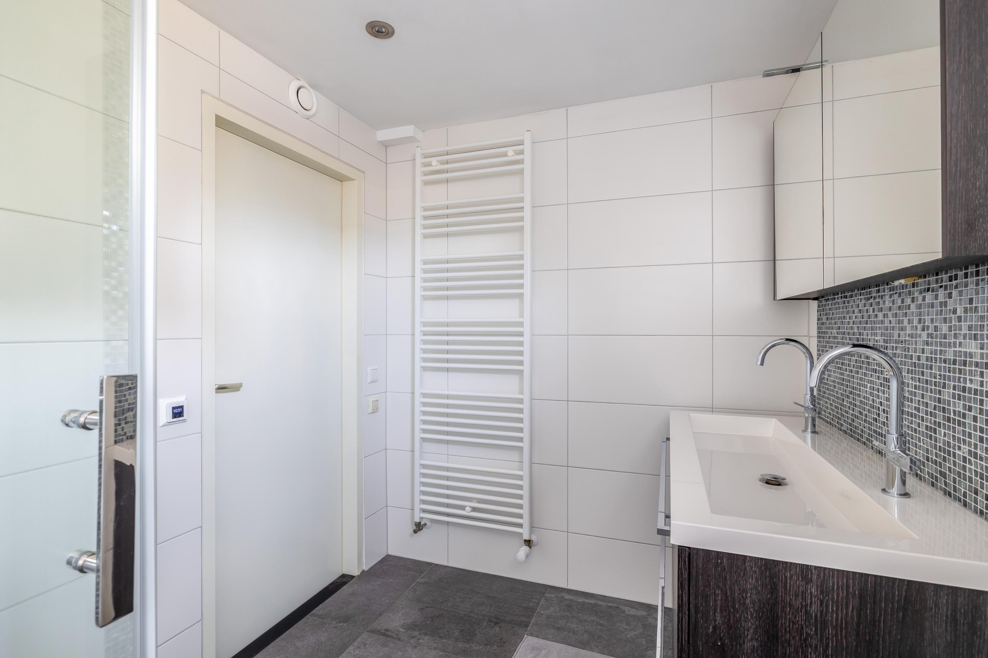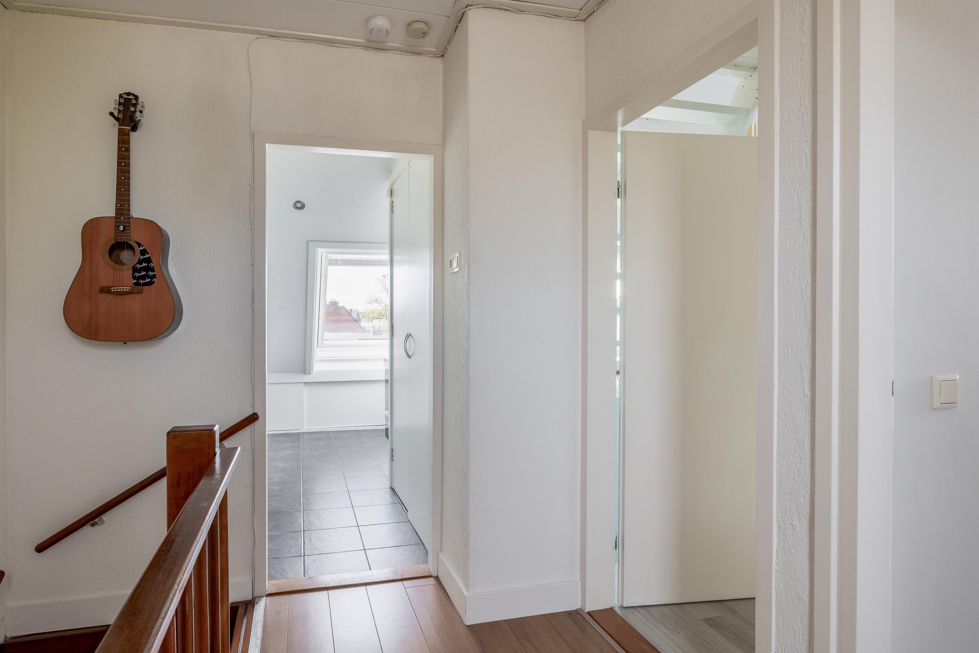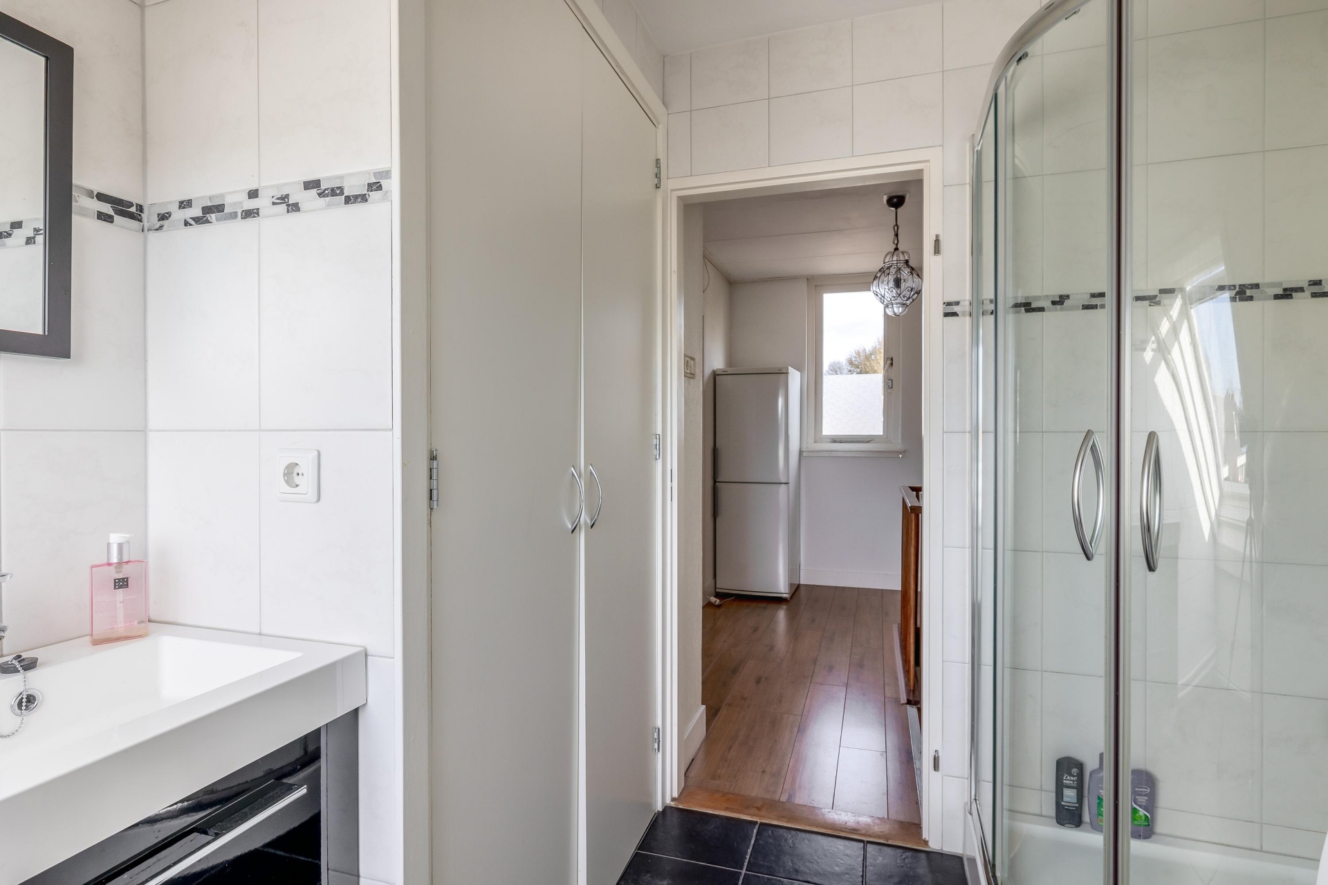 Overloop met toegang tot de ruime slaapkamer aan de voorzijde. In het midden van de woning bevindt zich de moderne badkamer, uitgerust met een inloopdouche, vrijhangend toilet en dubbel wastafelmeubel. Dankzij het raam geniet de badkamer van natuurlijke ventilatie en daglicht. Aan de achterzijde liggen nog twee slaapkamers, beide met toegang tot het zonnige balkon.