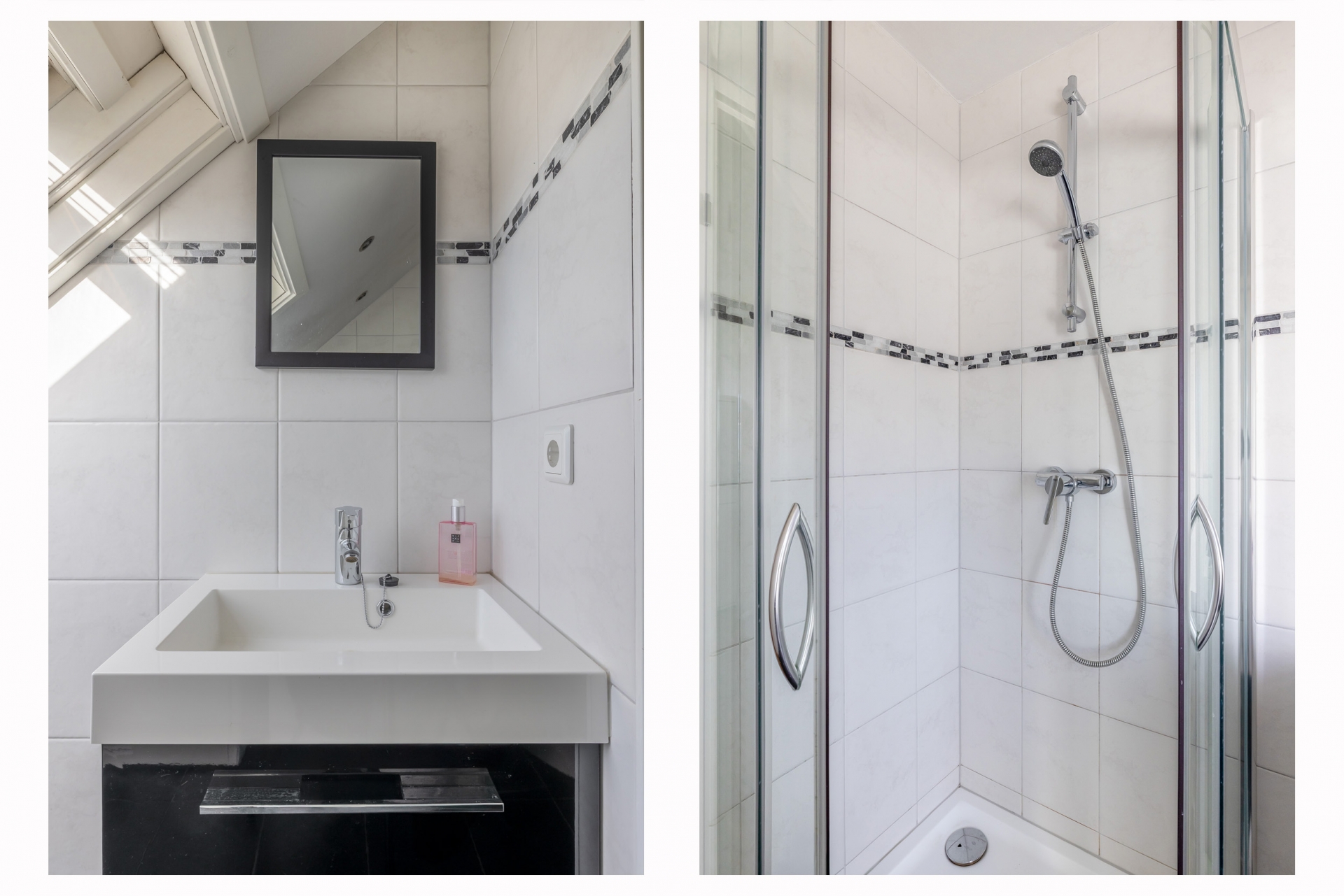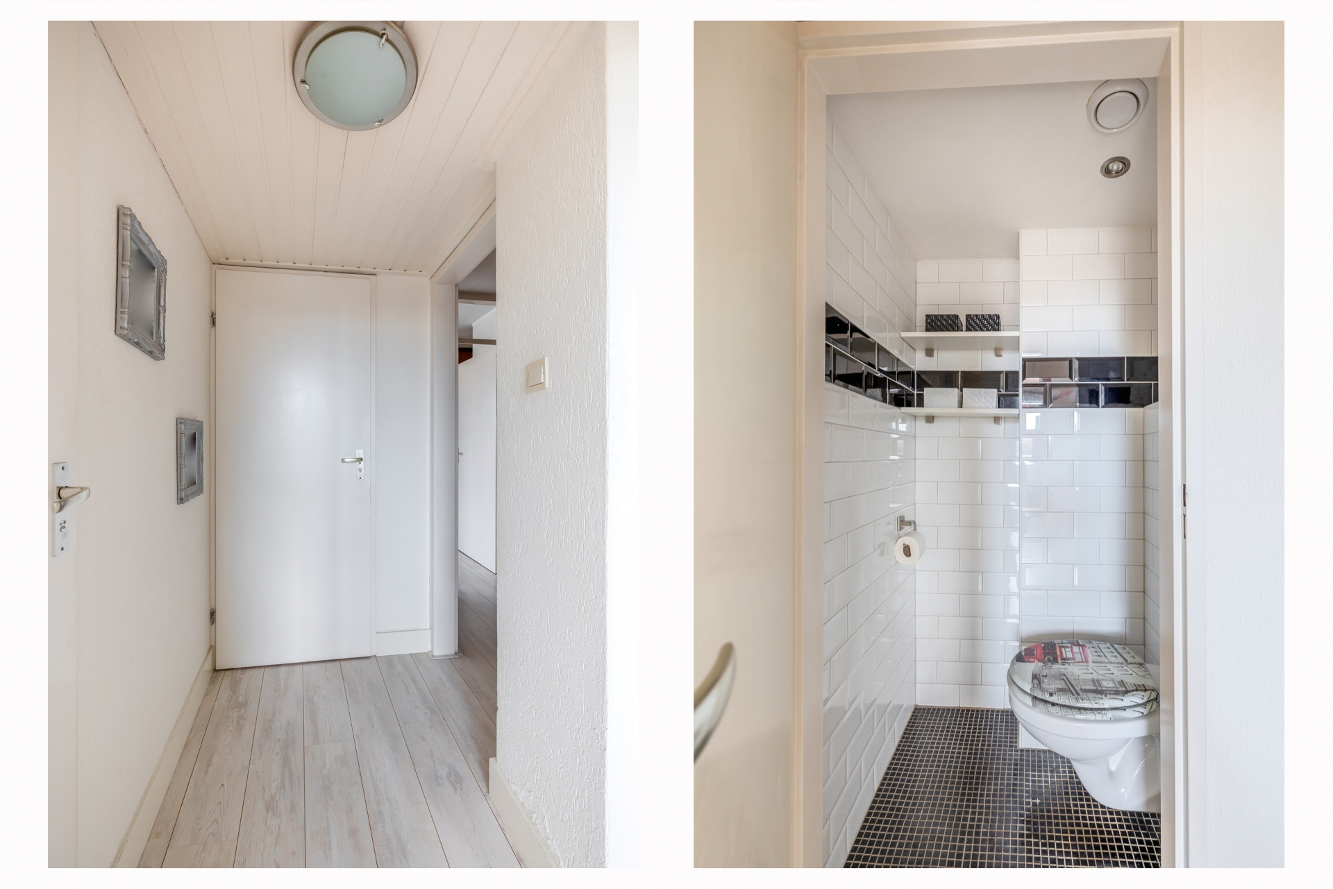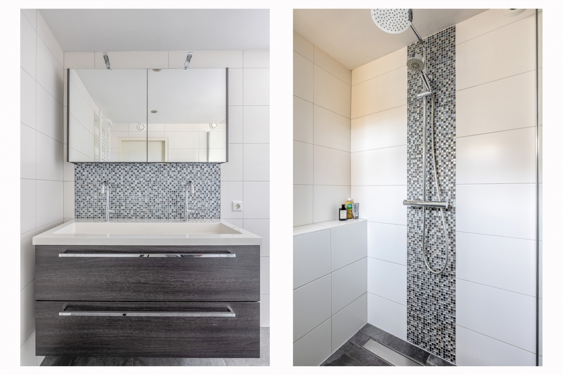 Overloop met toegang tot de ruime slaapkamer aan de voorzijde. In het midden van de woning bevindt zich de moderne badkamer, uitgerust met een inloopdouche, vrijhangend toilet en dubbel wastafelmeubel. Dankzij het raam geniet de badkamer van natuurlijke ventilatie en daglicht. Aan de achterzijde liggen nog twee slaapkamers, beide met toegang tot het zonnige balkon.