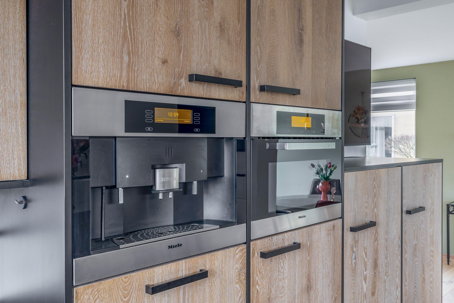 De keuken sluit mooi aan op de leefruimte en heeft een stoere, landelijke uitstraling. Het grote fornuis springt direct in het oog en nodigt uit om uitgebreid te koken. Er is veel werkblad en kastruimte aanwezig, waardoor functionaliteit en uitstraling hier hand in hand gaan. Vanuit het raam kijk je uit op de tuin, wat zorgt voor een fijne connectie met buiten tijdens het koken.