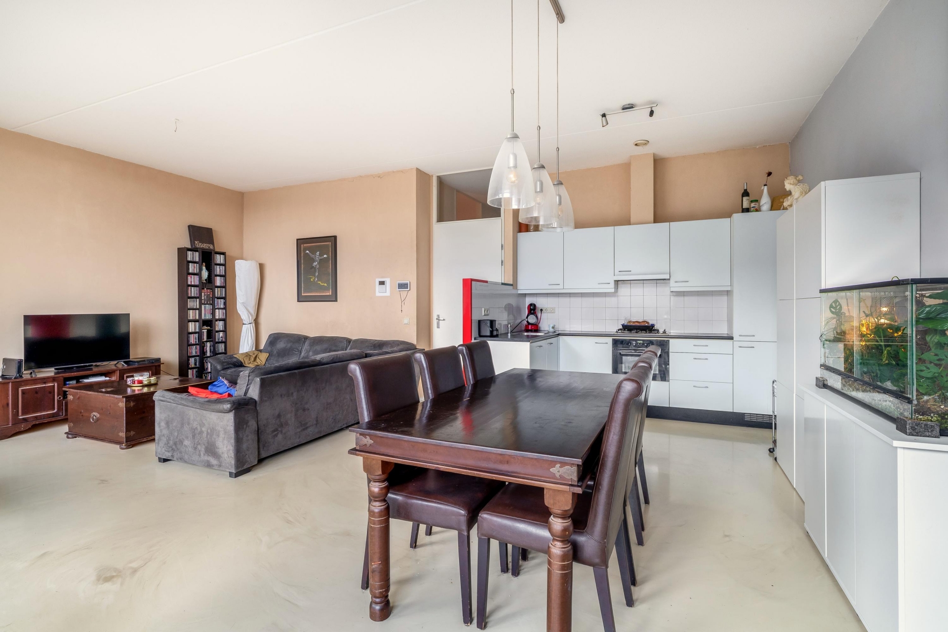De woonkamer is zonder twijfel het hart van het huis. Dankzij de grote raampartijen en de schuifpui naar het balkon komt er veel natuurlijk licht binnen. Je hebt hier meer dan genoeg ruimte voor een royale zithoek én een flinke eettafel. De open keuken sluit hier mooi op aan en is uitgevoerd in een praktische L-opstelling met veel kastruimte, een gaskookplaat, oven en koel-vriescombinatie. Alles wat je nodig hebt om lekker te koken of gewoon een snelle maaltijd klaar te maken. Vanuit de woonkamer kijk je uit over de rustige straat en zie je de levendigheid van het dorp aan je voorbijtrekken, zonder dat het onrustig wordt.