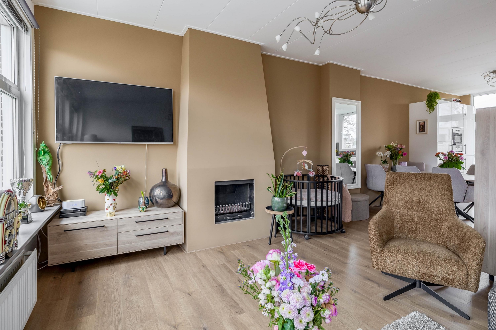 De zithoek biedt volop ruimte voor een royale hoekbank en een extra fauteuil. De gezellige open haard vormt hier een sfeervolle blikvanger en maakt deze ruimte extra uitnodigend tijdens de koudere maanden.