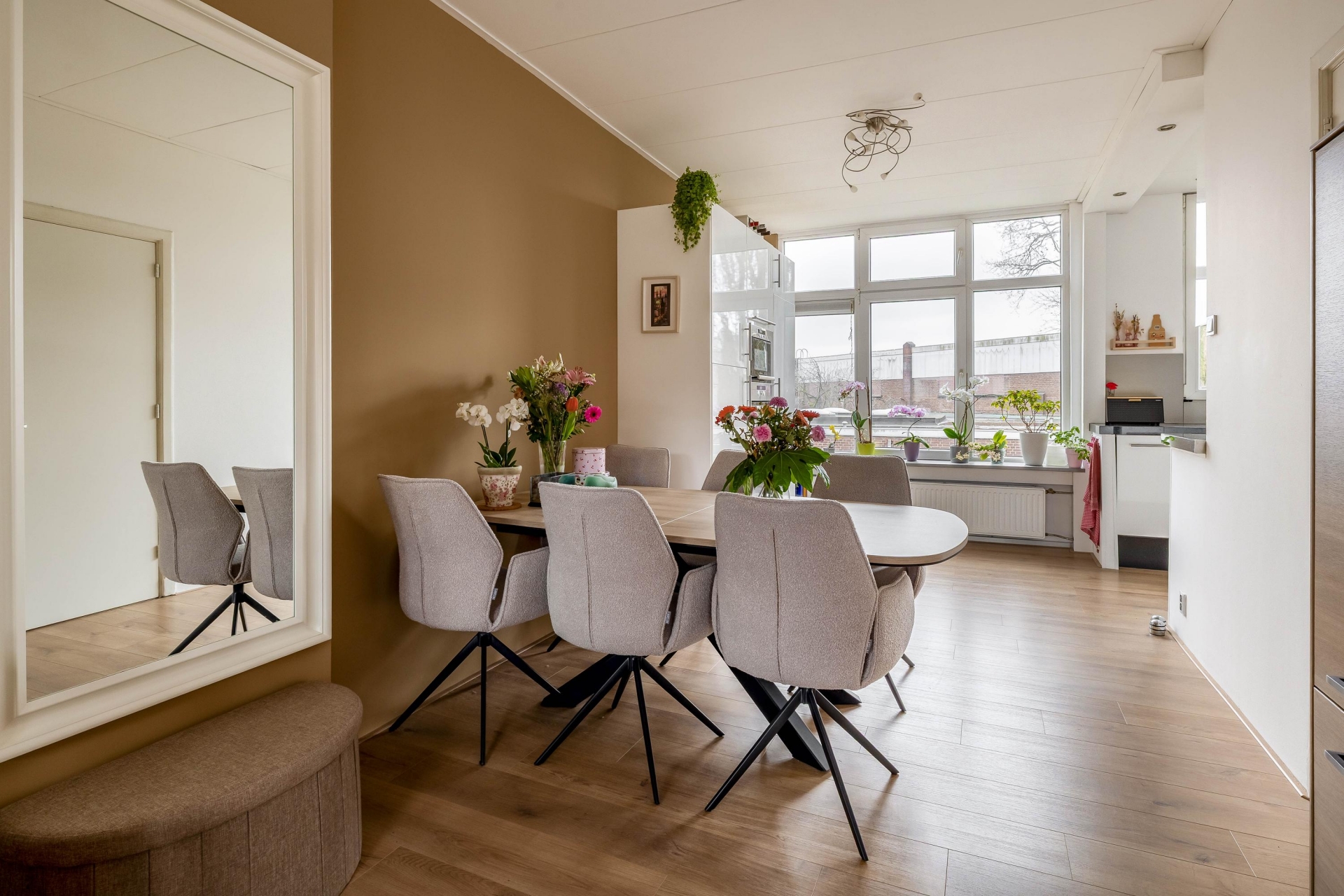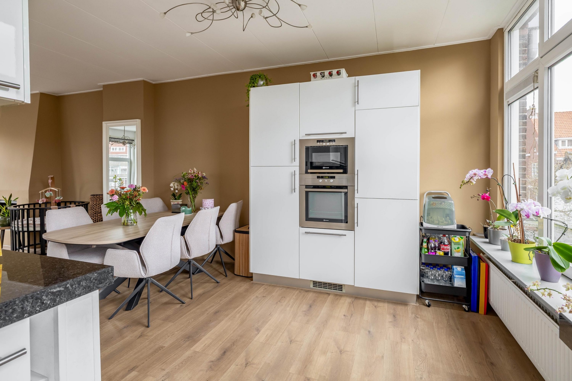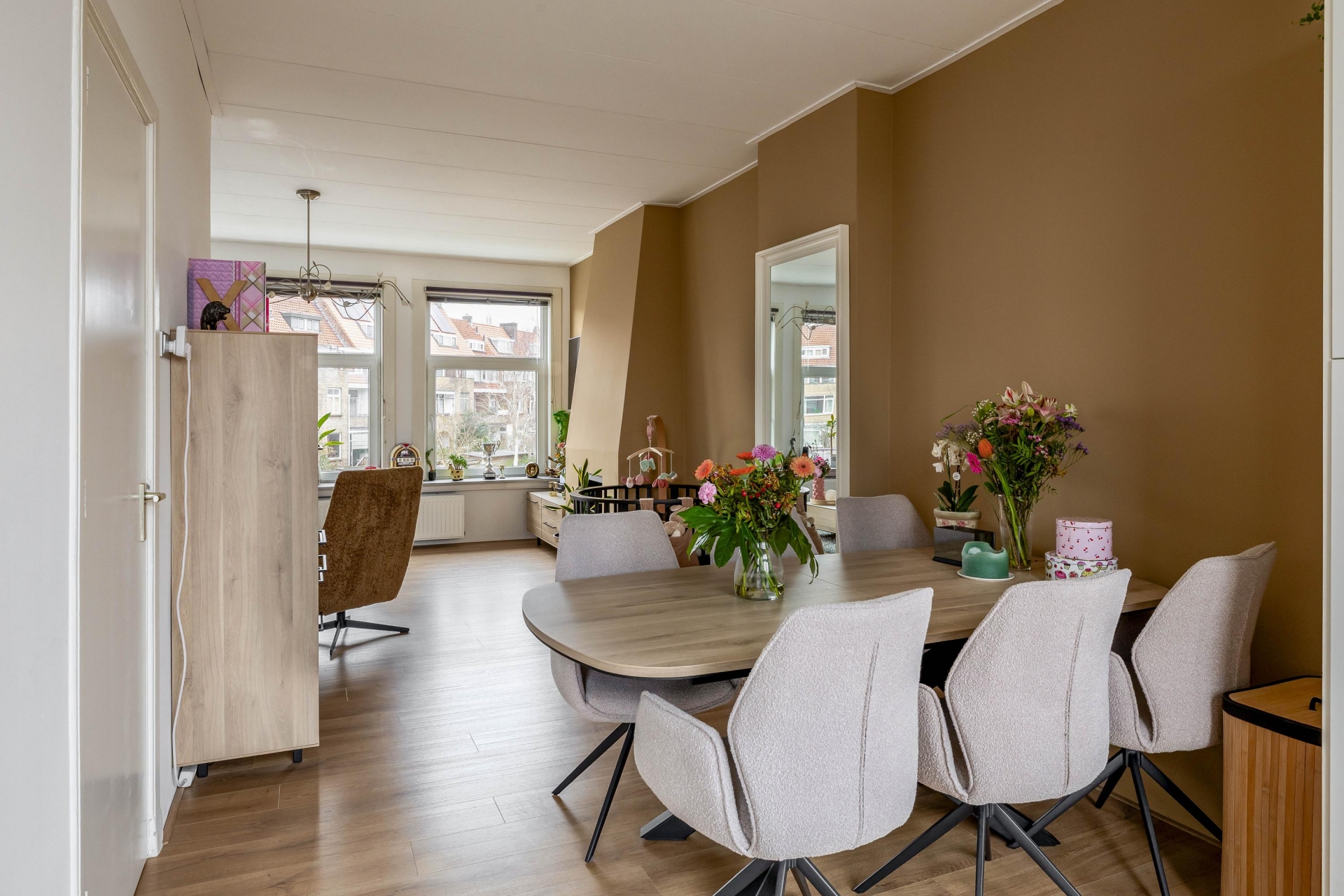Aan de achterzijde bevindt zich de eetkamer met plek voor een grote tafel waar je gemakkelijk met vrienden of familie kunt dineren. De open verbinding tussen wonen en eten zorgt voor een ruimtelijk gevoel en maakt dit een fijne leefverdieping.