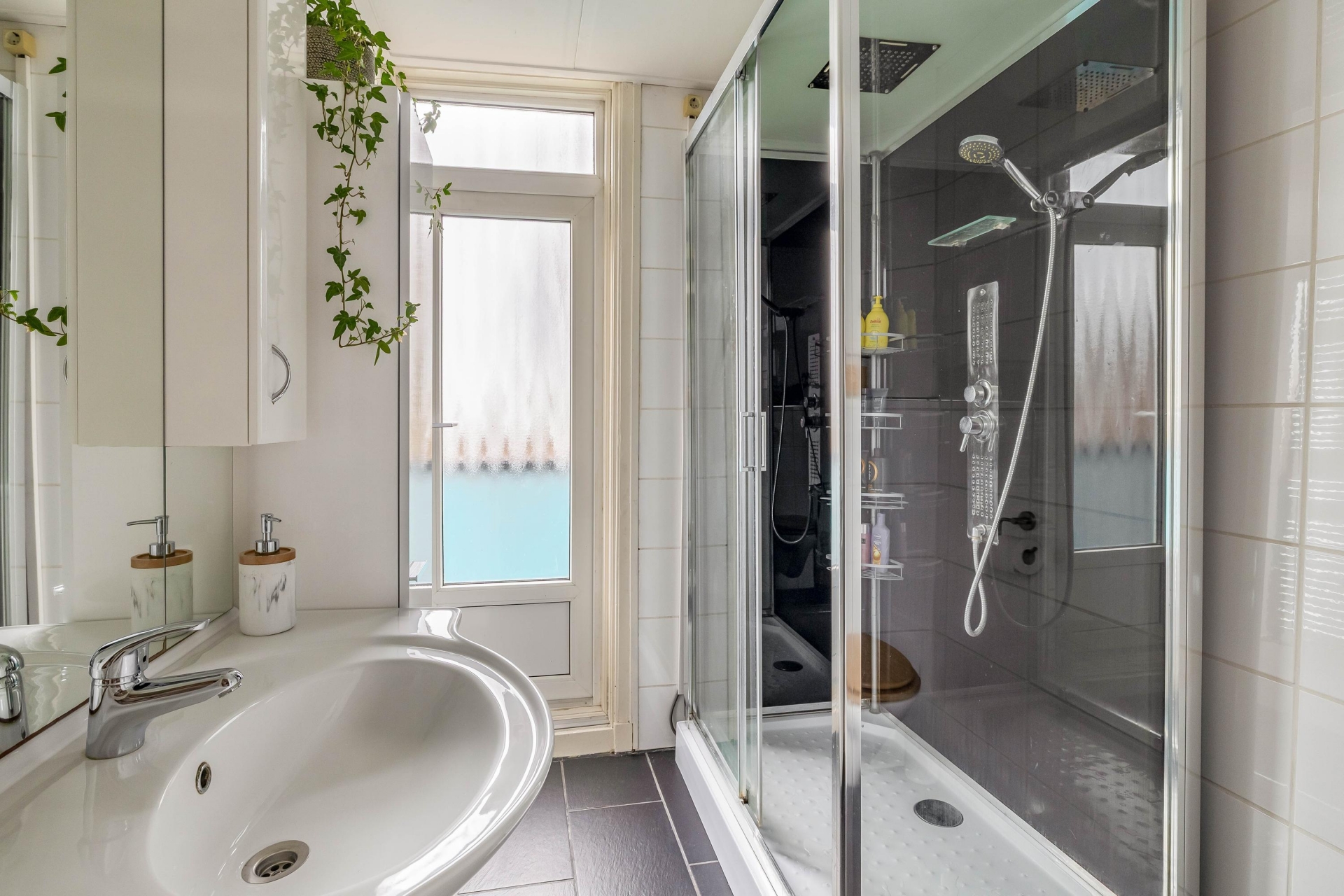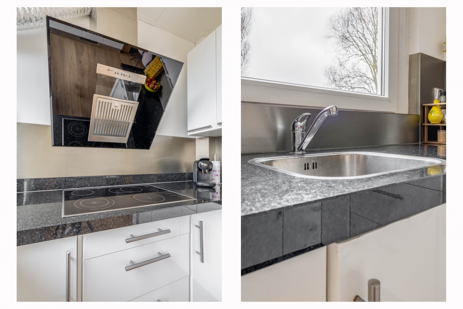 De keuken is opgesteld in een praktische hoekopstelling met donkere werkbladen en veel kastruimte. Door het raam valt prettig daglicht naar binnen en kijk je uit over de achtergelegen bebouwing.