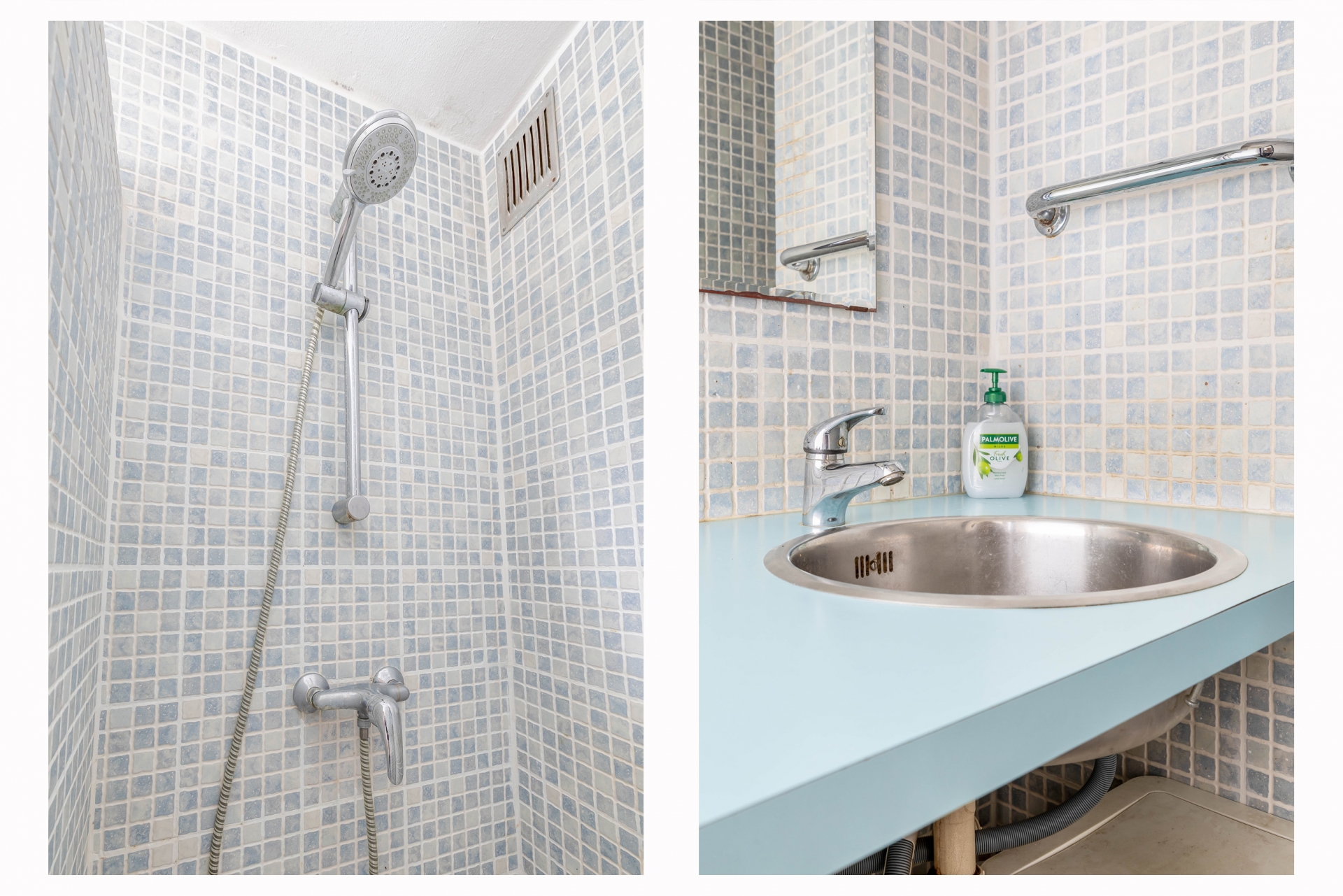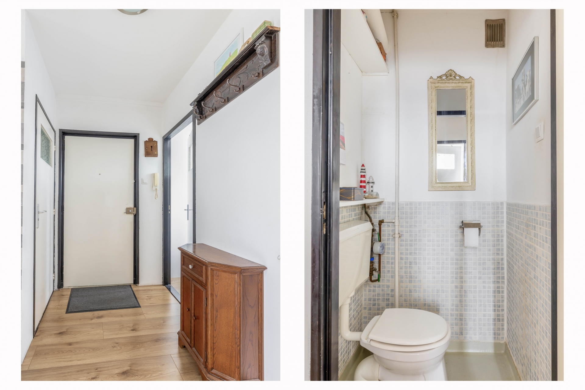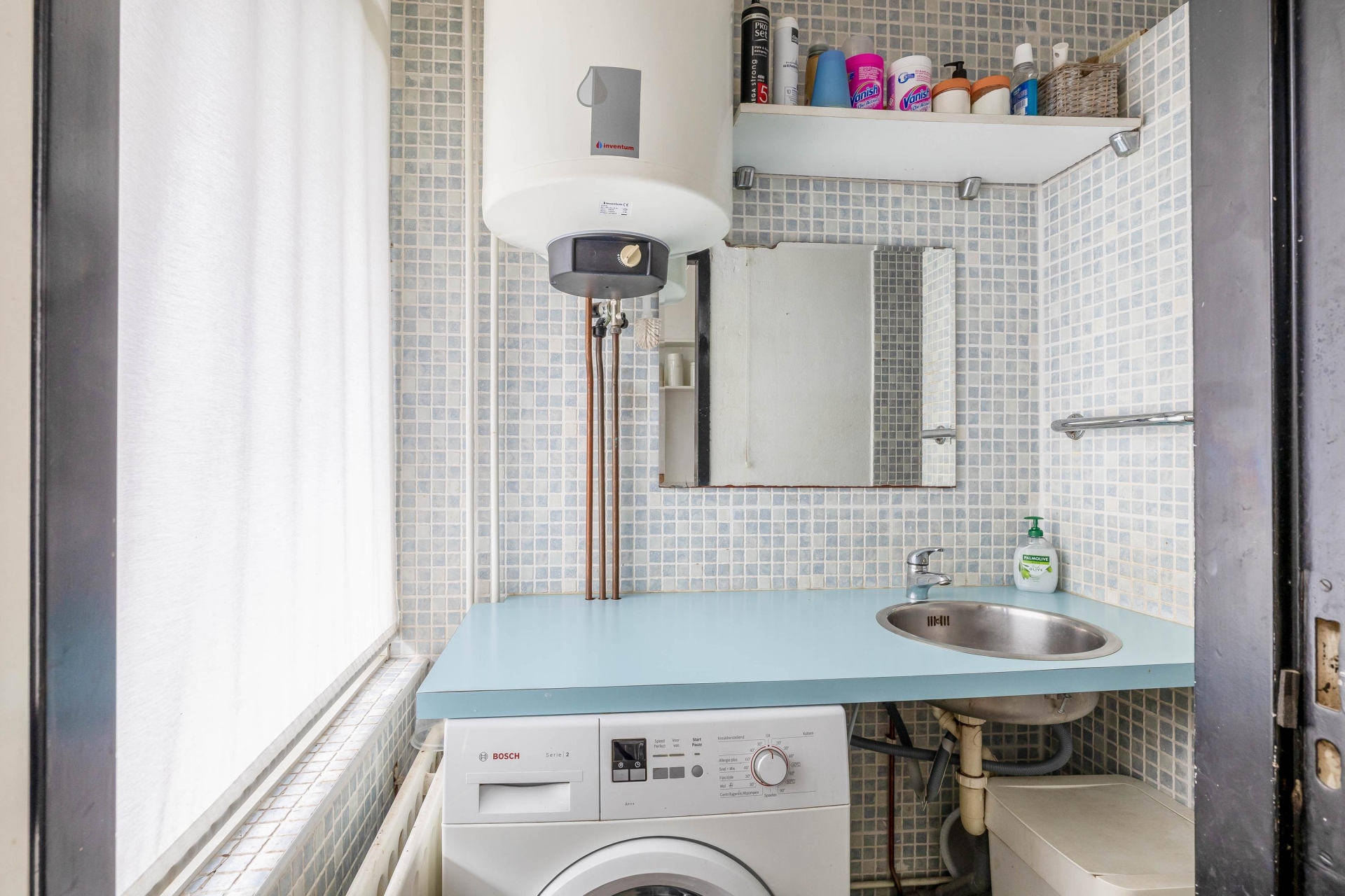De badkamer is compact maar praktisch ingericht met een douche, wastafelmeubel en aansluiting voor de wasmachine. Het toilet is separaat, wat extra comfort biedt. De woning is netjes onderhouden en direct te betrekken.