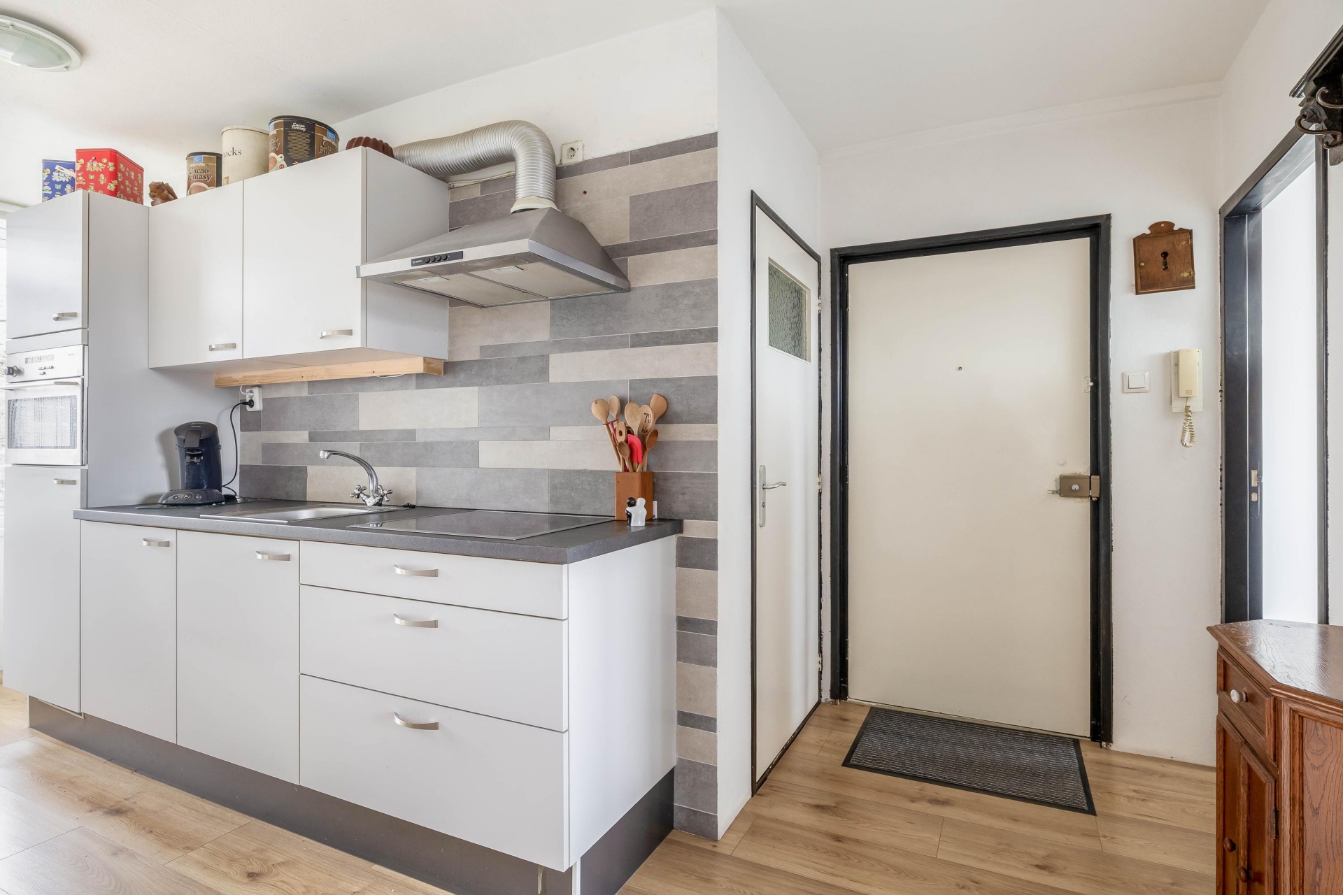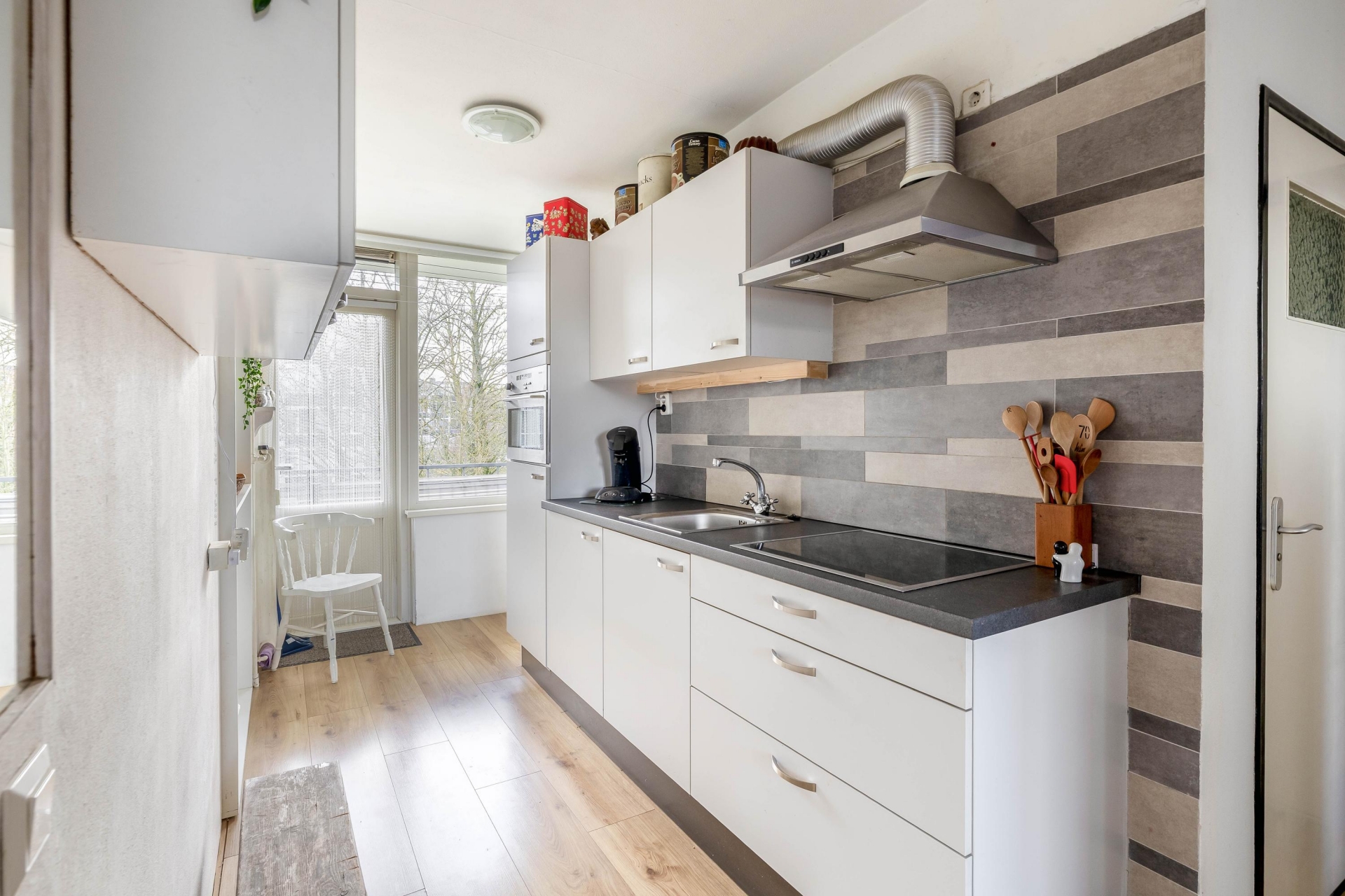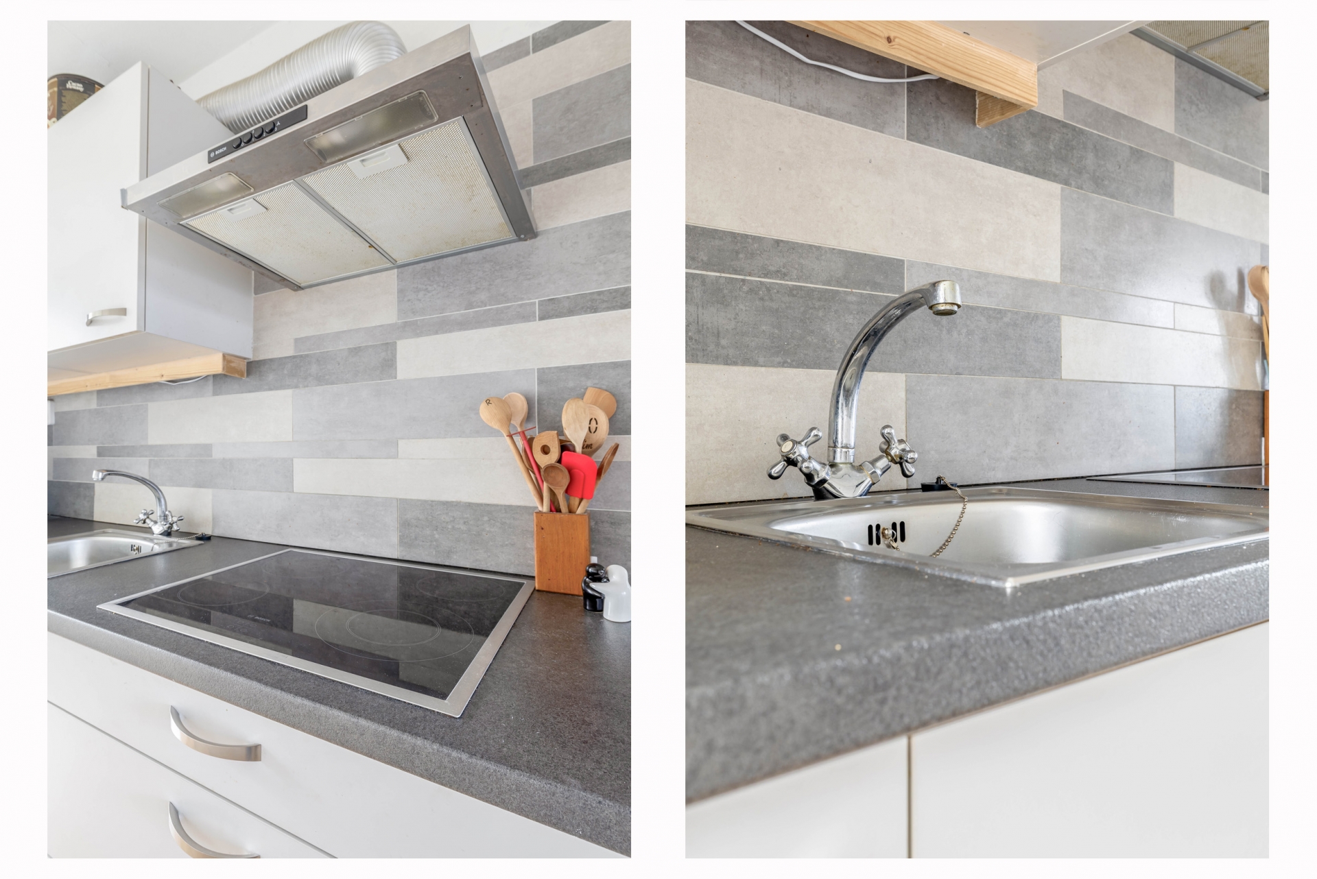 De keuken is vanuit de hal opengetrokken en sluit mooi aan op de woonkamer. Dankzij de praktische opzet oogt het geheel licht en ruim. De keuken is voorzien van een inductiekookplaat met afzuigkap, een inbouwkoelkast en een oven.