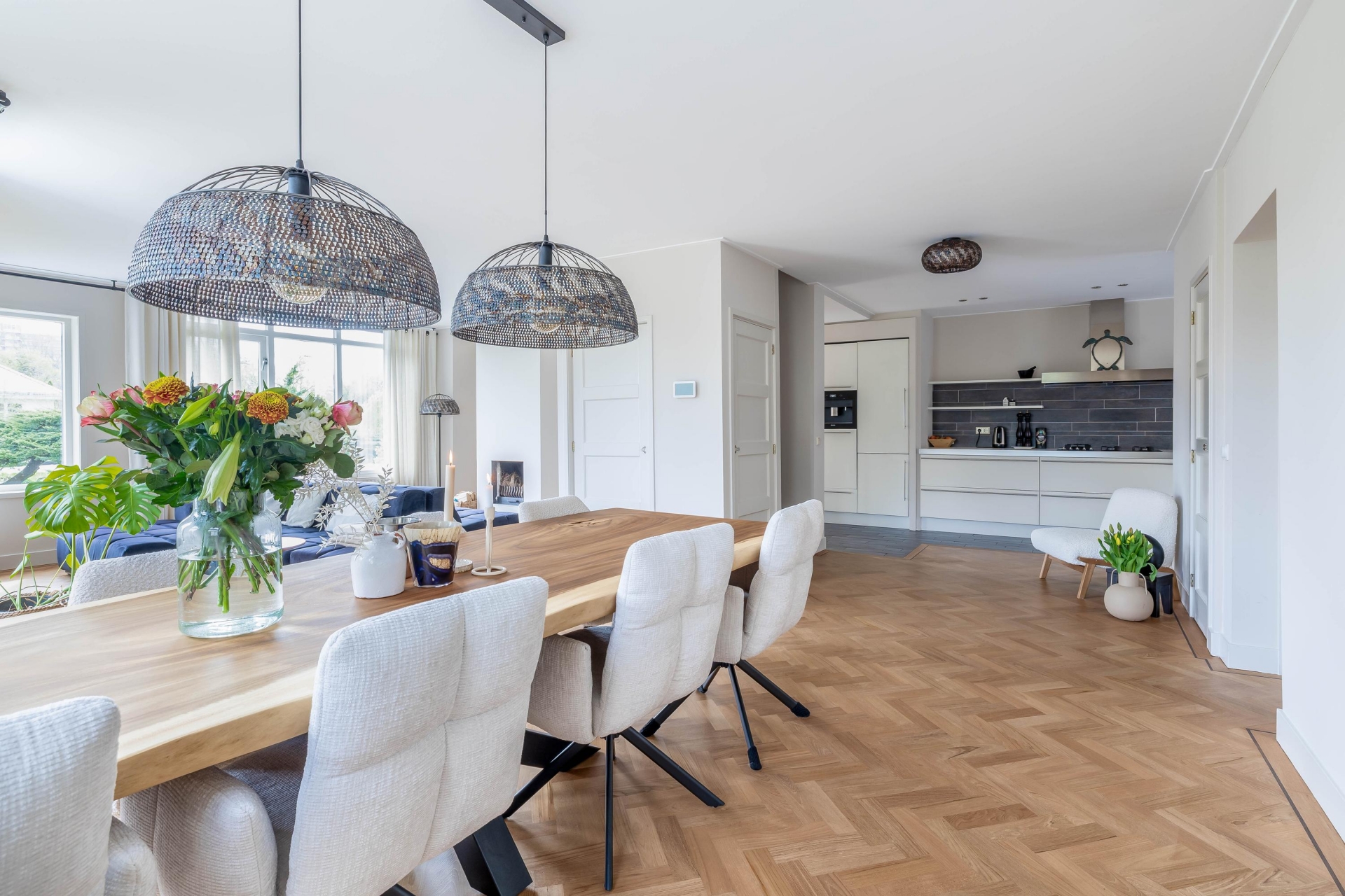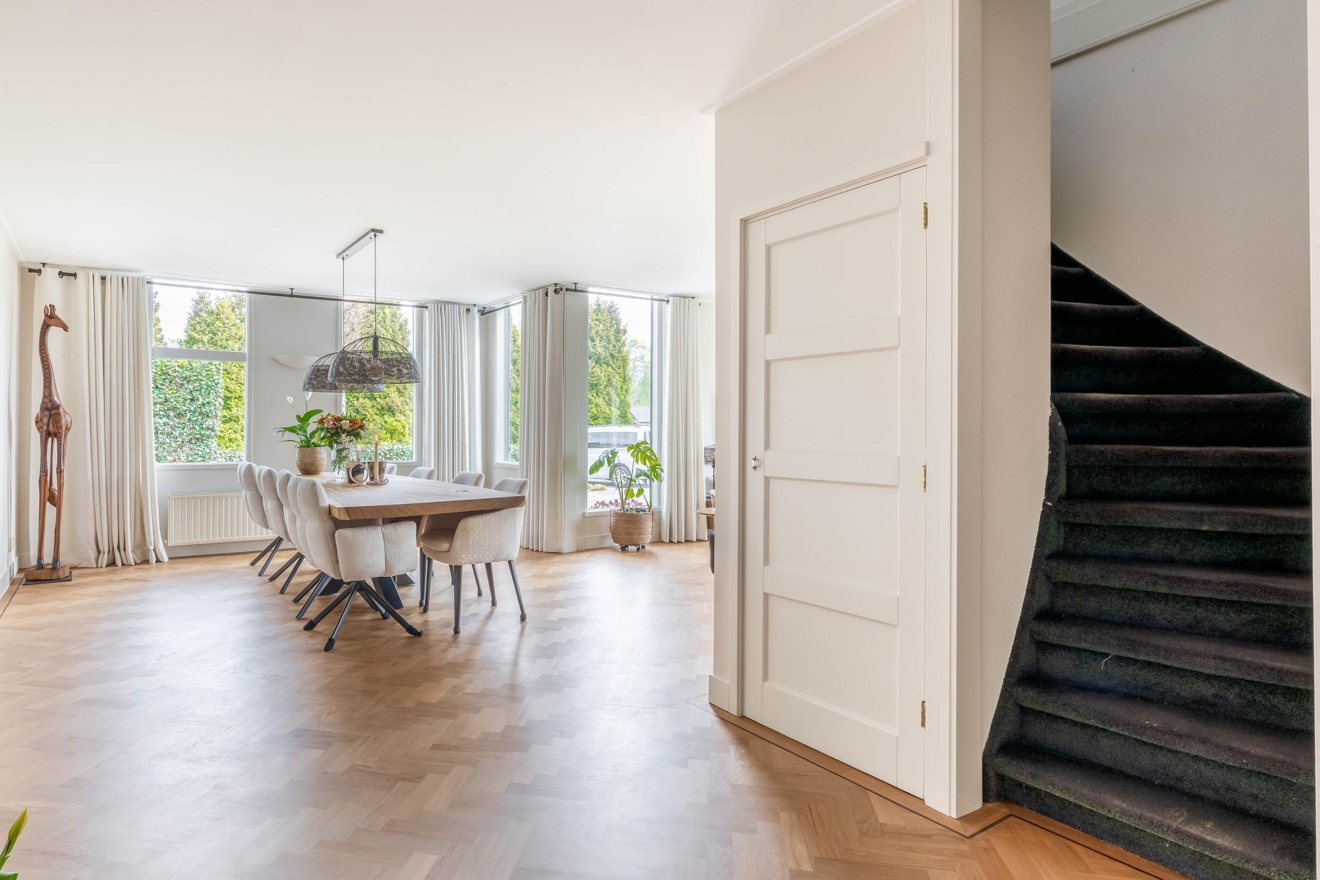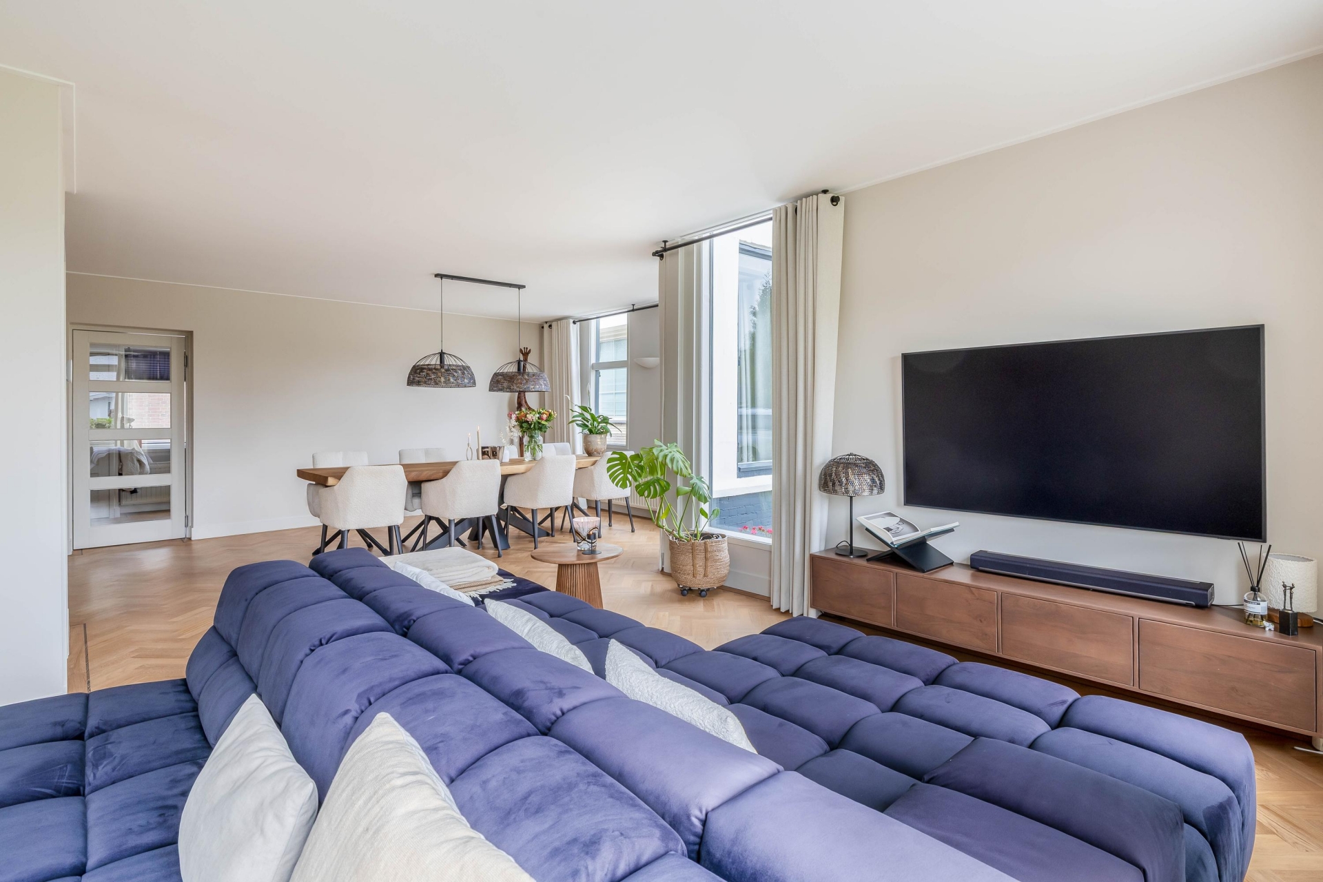 Zodra je binnenkomt, valt direct op hoe ruim en licht dit huis is. De woonkamer en eetkamer lopen op een natuurlijke manier in elkaar over en bieden alle ruimte voor zowel een royale zithoek als een grote eettafel. De vele raampartijen zorgen voor een prettige lichtinval en geven een mooi zicht op het groen rondom het huis. De afwerking is verzorgd en in balans, met een warme houten visgraad vloer die direct sfeer brengt.