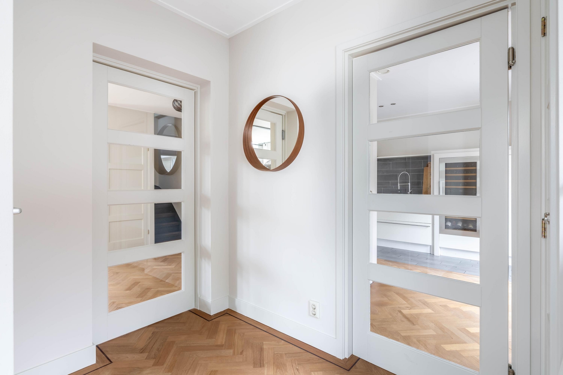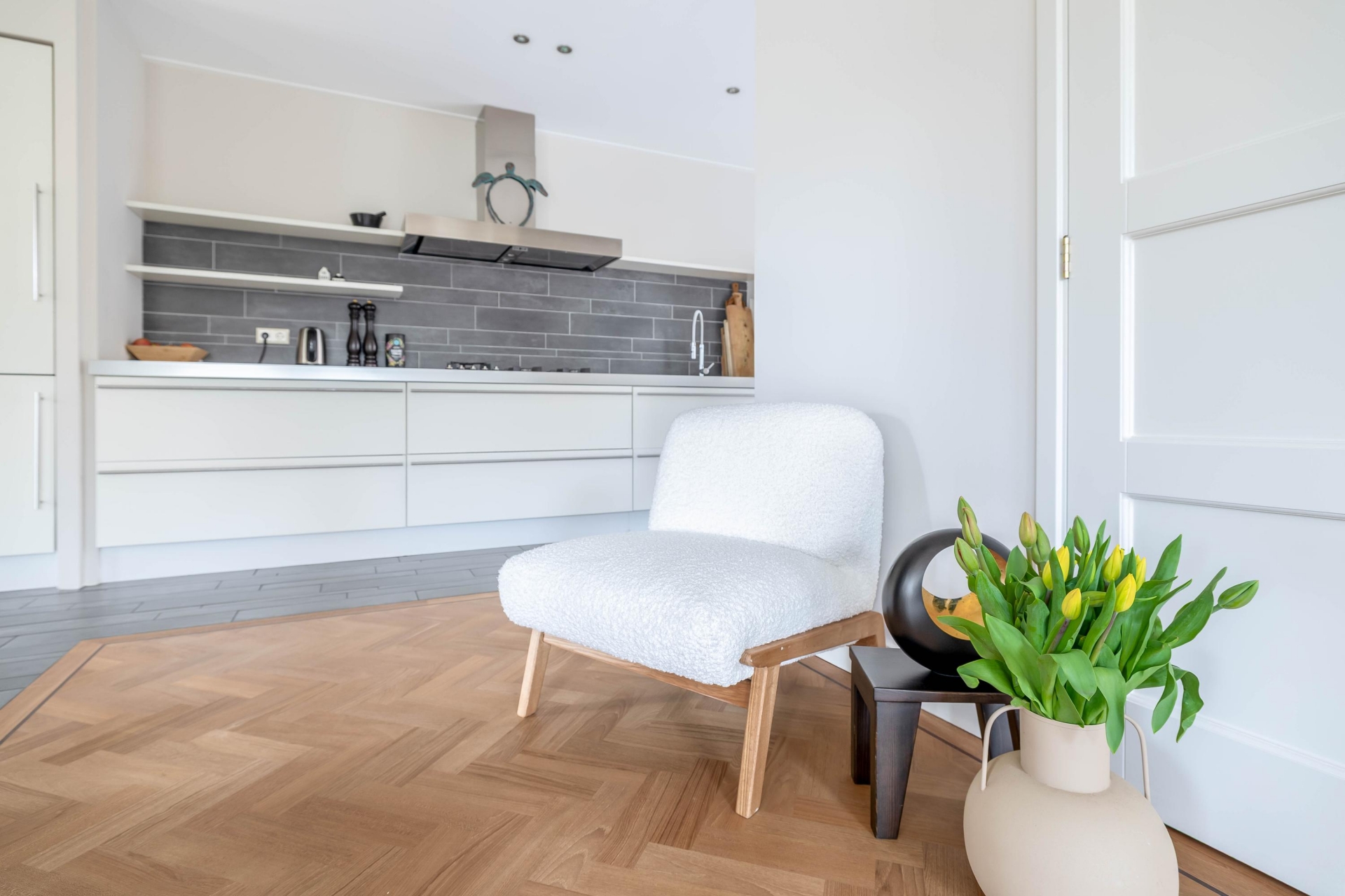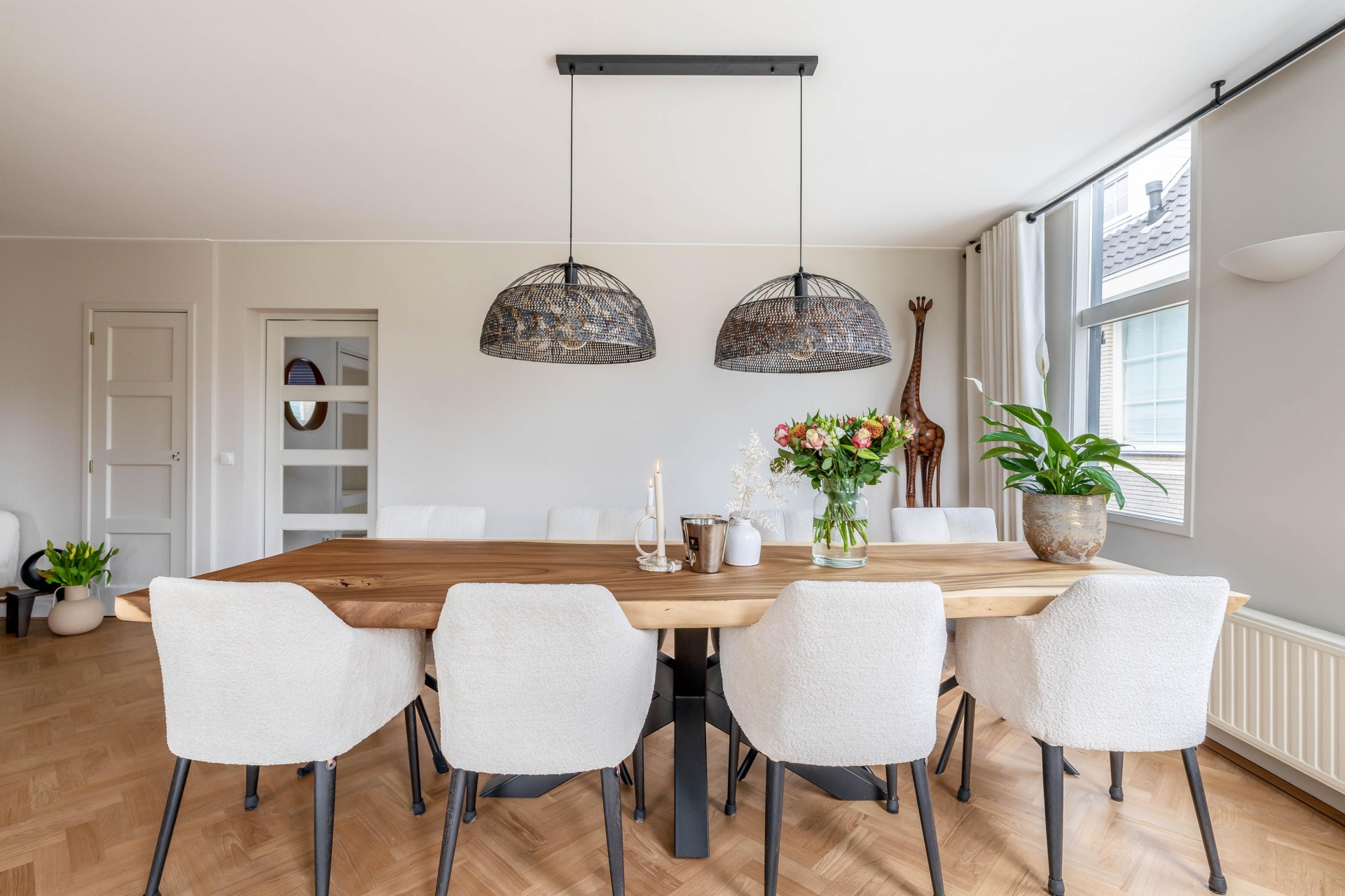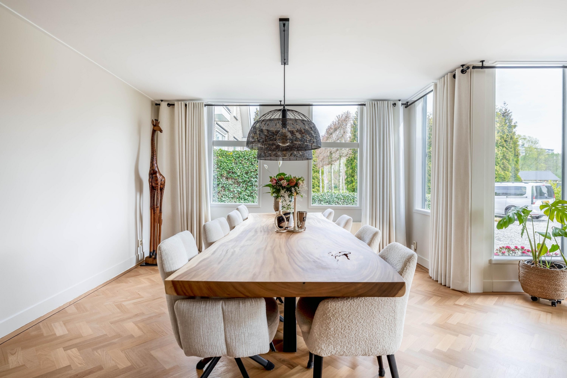 Zodra je binnenkomt, valt direct op hoe ruim en licht dit huis is. De woonkamer en eetkamer lopen op een natuurlijke manier in elkaar over en bieden alle ruimte voor zowel een royale zithoek als een grote eettafel. De vele raampartijen zorgen voor een prettige lichtinval en geven een mooi zicht op het groen rondom het huis. De afwerking is verzorgd en in balans, met een warme houten visgraad vloer die direct sfeer brengt.