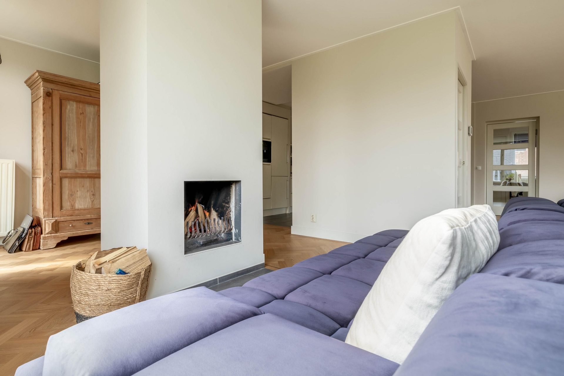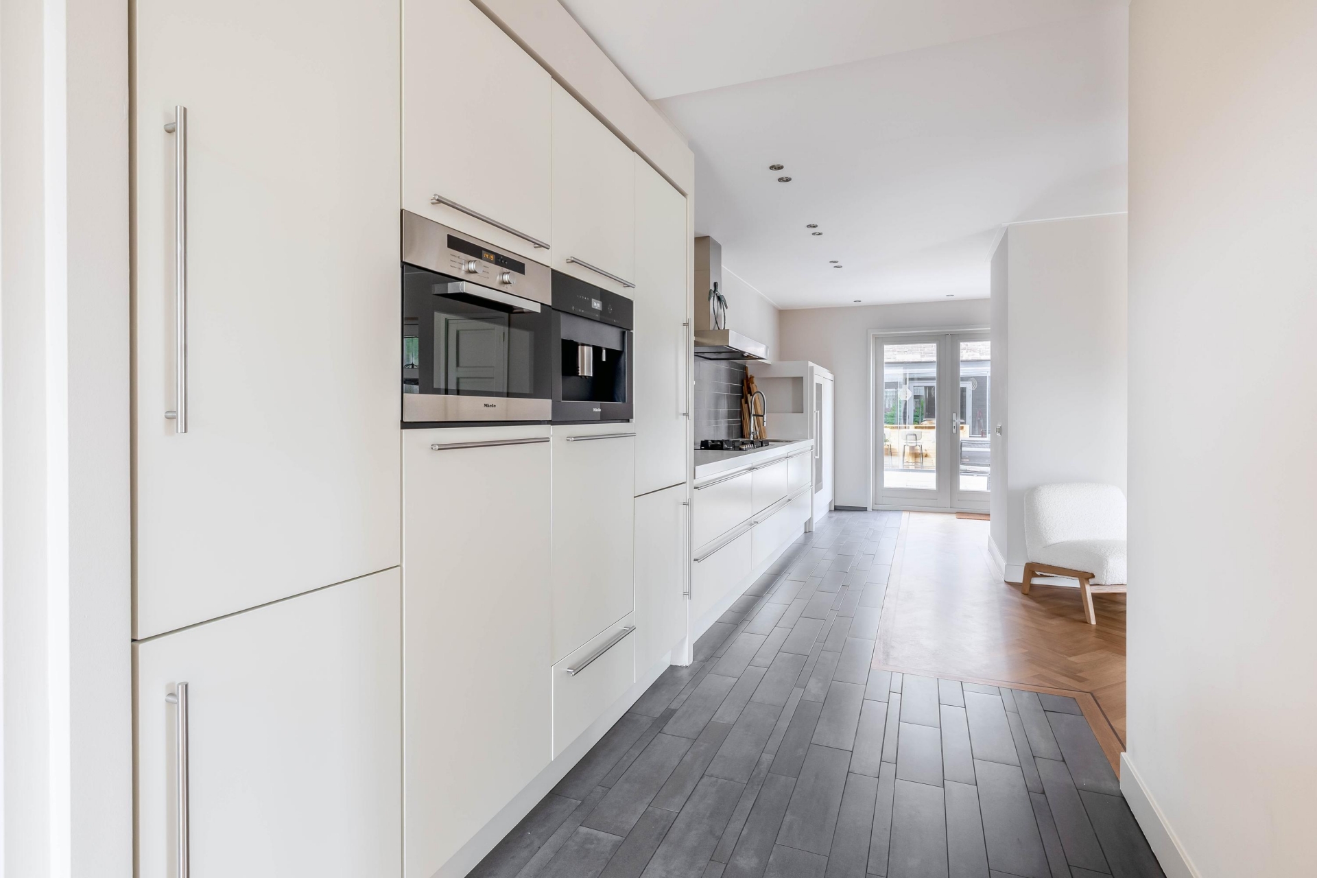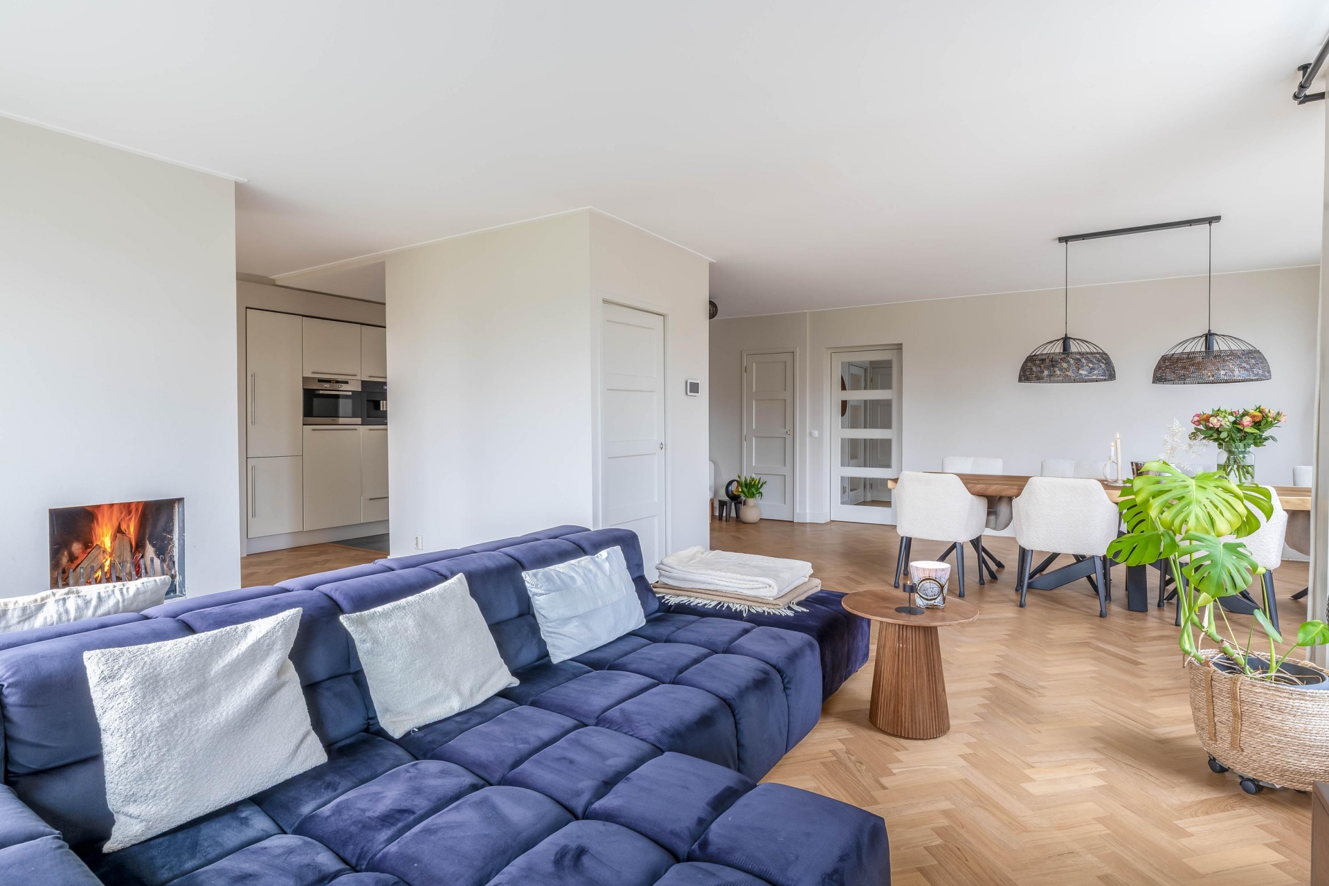 De zithoek is gesitueerd rondom de haard, wat zorgt voor een fijne plek om te ontspannen. Aan de andere zijde vind je de eetkamer, die in open verbinding staat met de keuken. Hier is volop ruimte om uitgebreid te tafelen met familie of vrienden. De keuken zelf is strak en modern uitgevoerd en voorzien van diverse inbouwapparatuur (alles van Miele), waaronder een wijnklimaatkast een detail dat perfect past bij het karakter en luxe van dit huis.