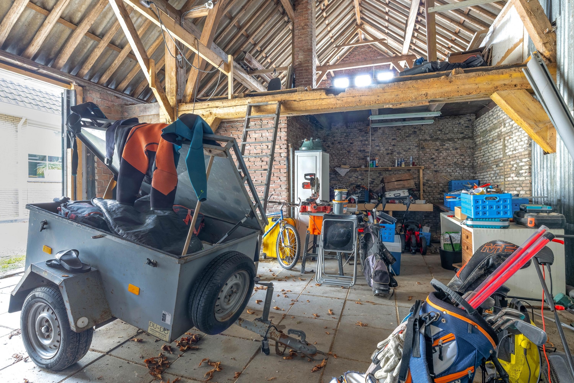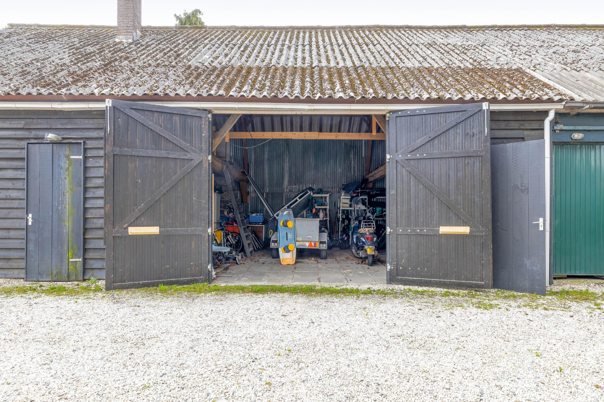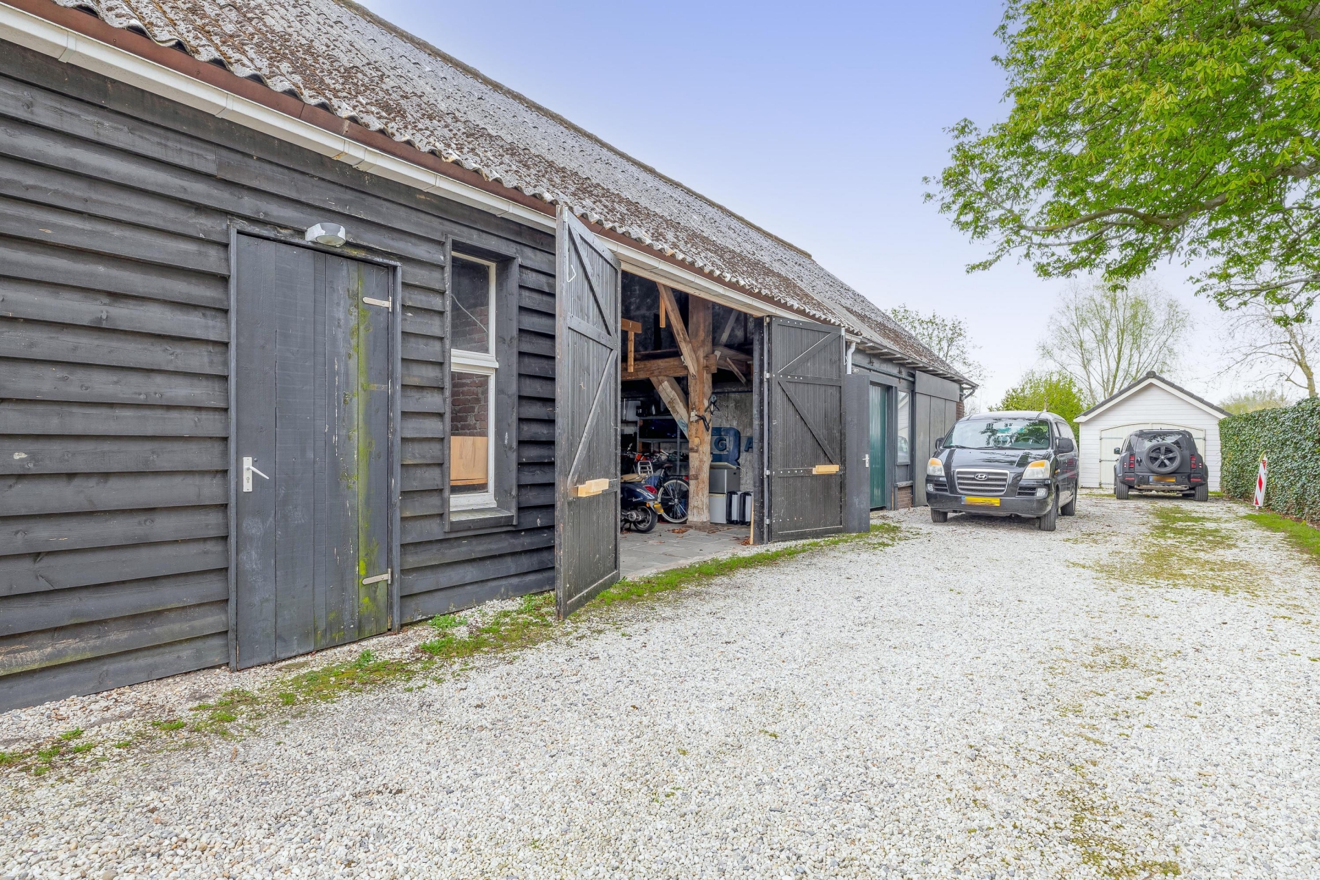 - Grote schuur/garage met openslaande deuren, geschikt voor opslag, hobbyruimte of stalling van fietsen/motoren;