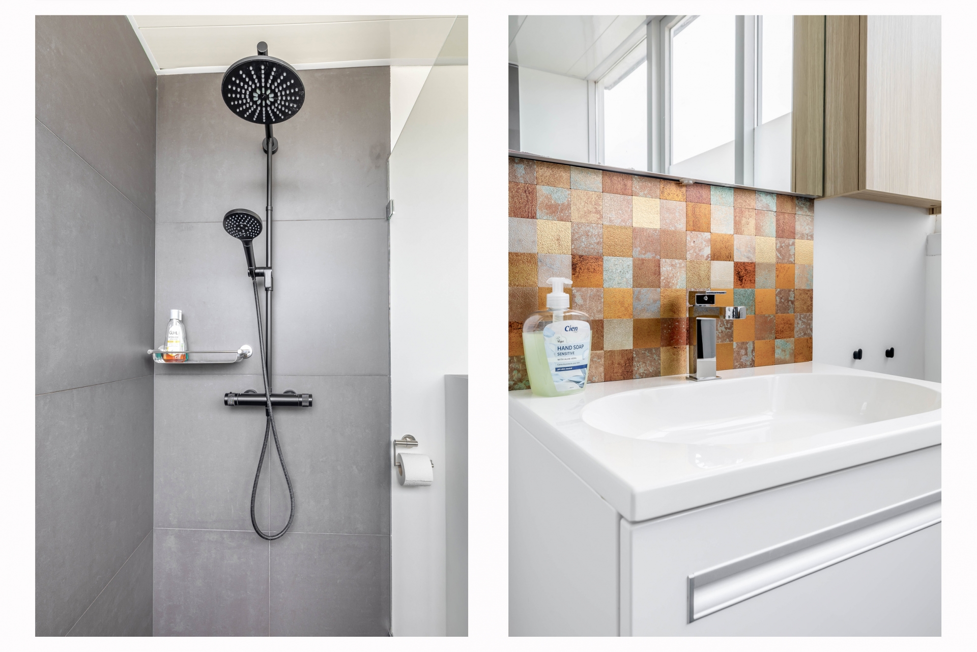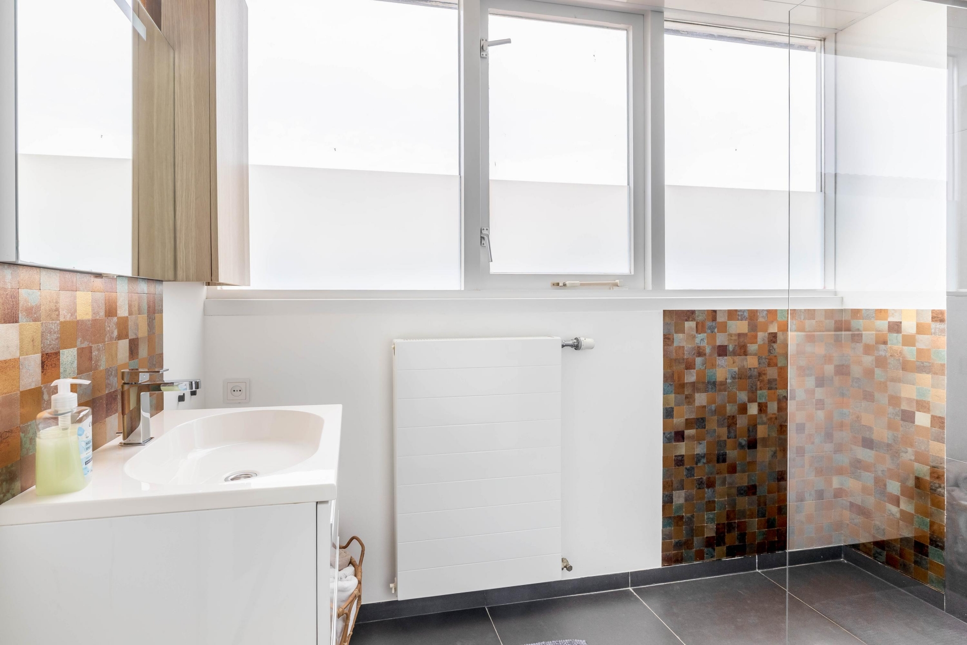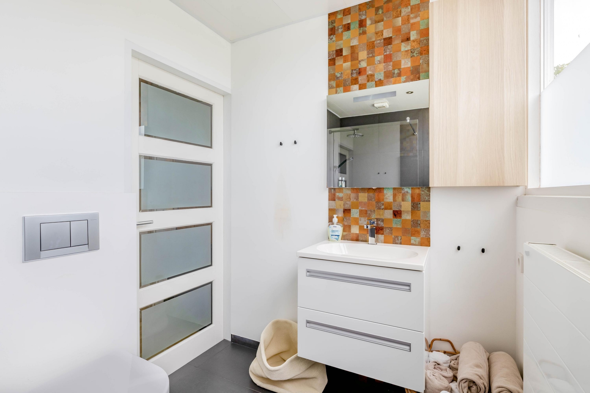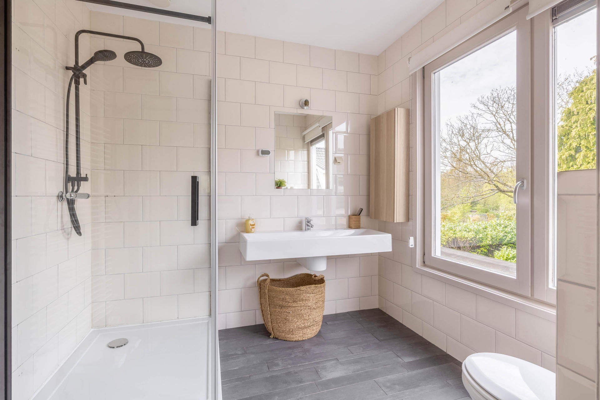 De badkamer bereikbaar vanuit de slaapkamer is fris en verzorgd, met een ruime inloopdouche, wastafelmeubel en toilet. De afwerking is neutraal en tijdloos, waardoor je hier zo in kunt. Verder is er nog een tweede badkamer