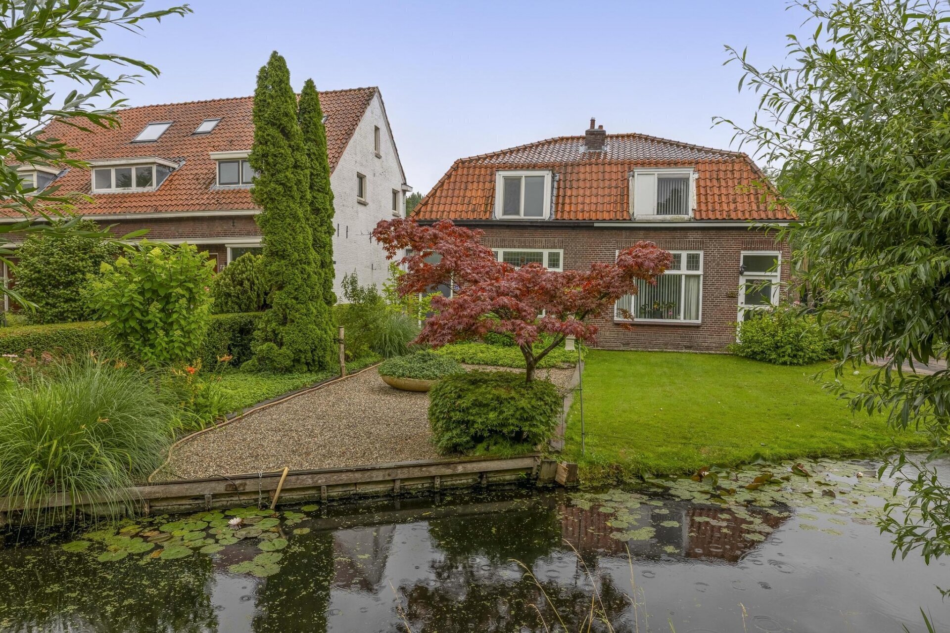 De riante achtertuin is gelegen aan het water en bestaat grotendeels uit gazon.