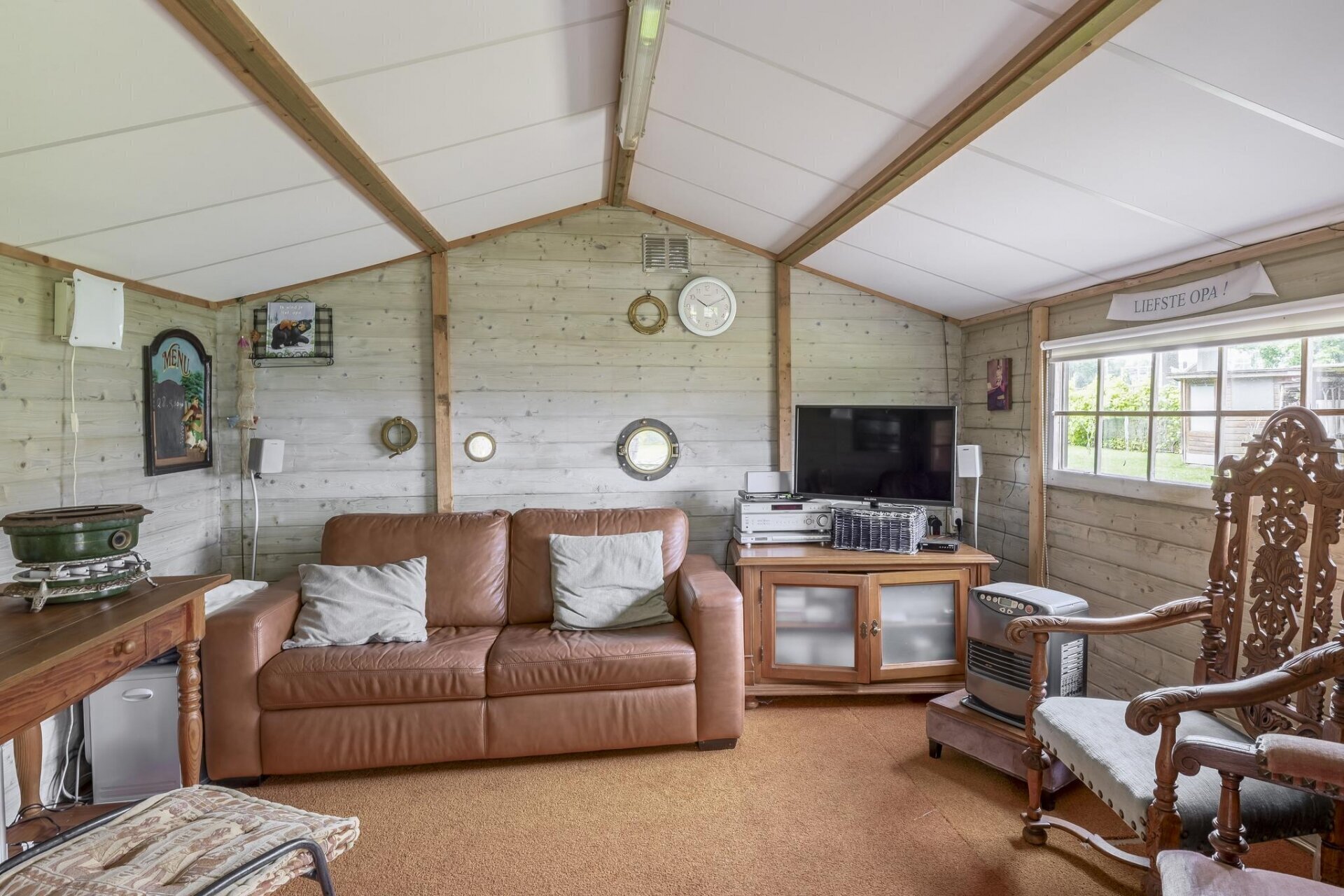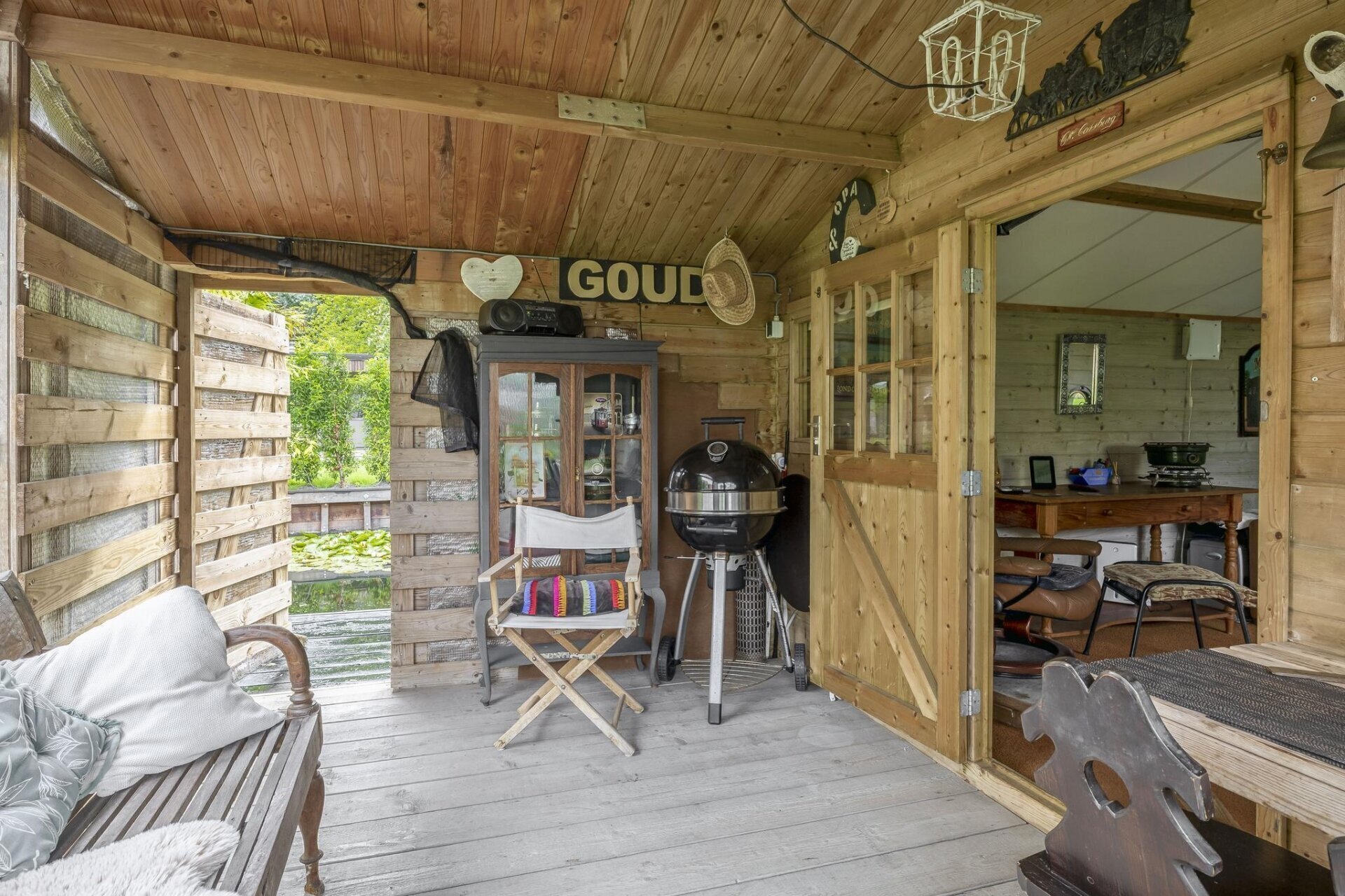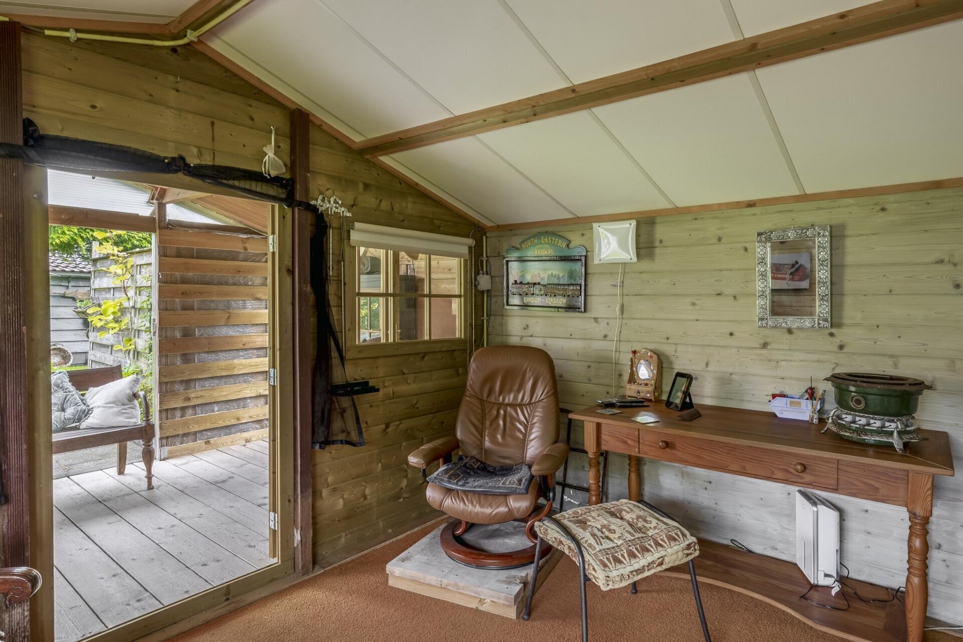 Deze externe bergruimte is onderverdeeld in een achtergelegen garage / opbergschuur en nog een oergezellig tuinhuis met veranda in de achtertuin.