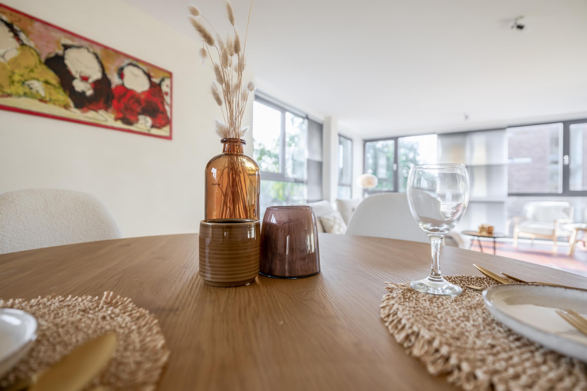 Zodra je binnenkomt, valt de hoogwaardige afwerking direct op. De hardhouten vloer loopt als een warme basis door het gehele appartement. De binnendeuren (slechts 2) zijn taats gescharnierd en voorzien van verzonken grepen, een stijlvol detail dat zorgt voor een strakke en luxe uitstraling. De ruime living biedt volop mogelijkheden voor een gezellige zit- en eethoek en wordt van nature royaal verlicht door de vele ramen aan meerdere zijden. Hier ervaar je echt het loftgevoel: open, licht en ruim.