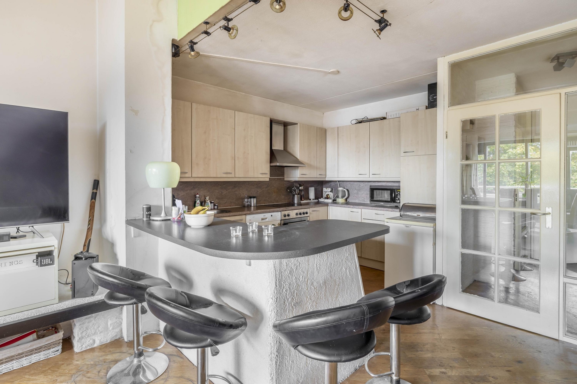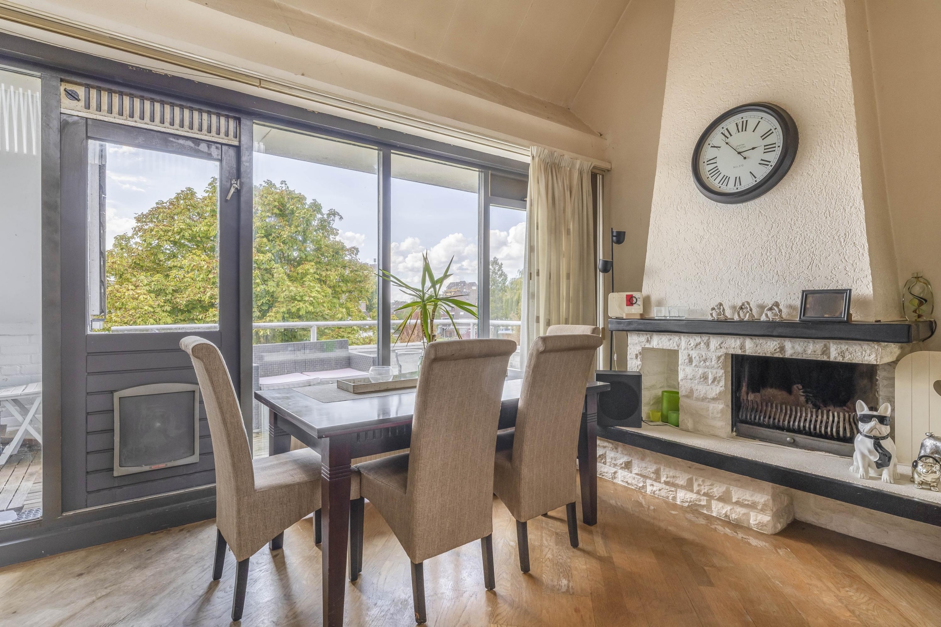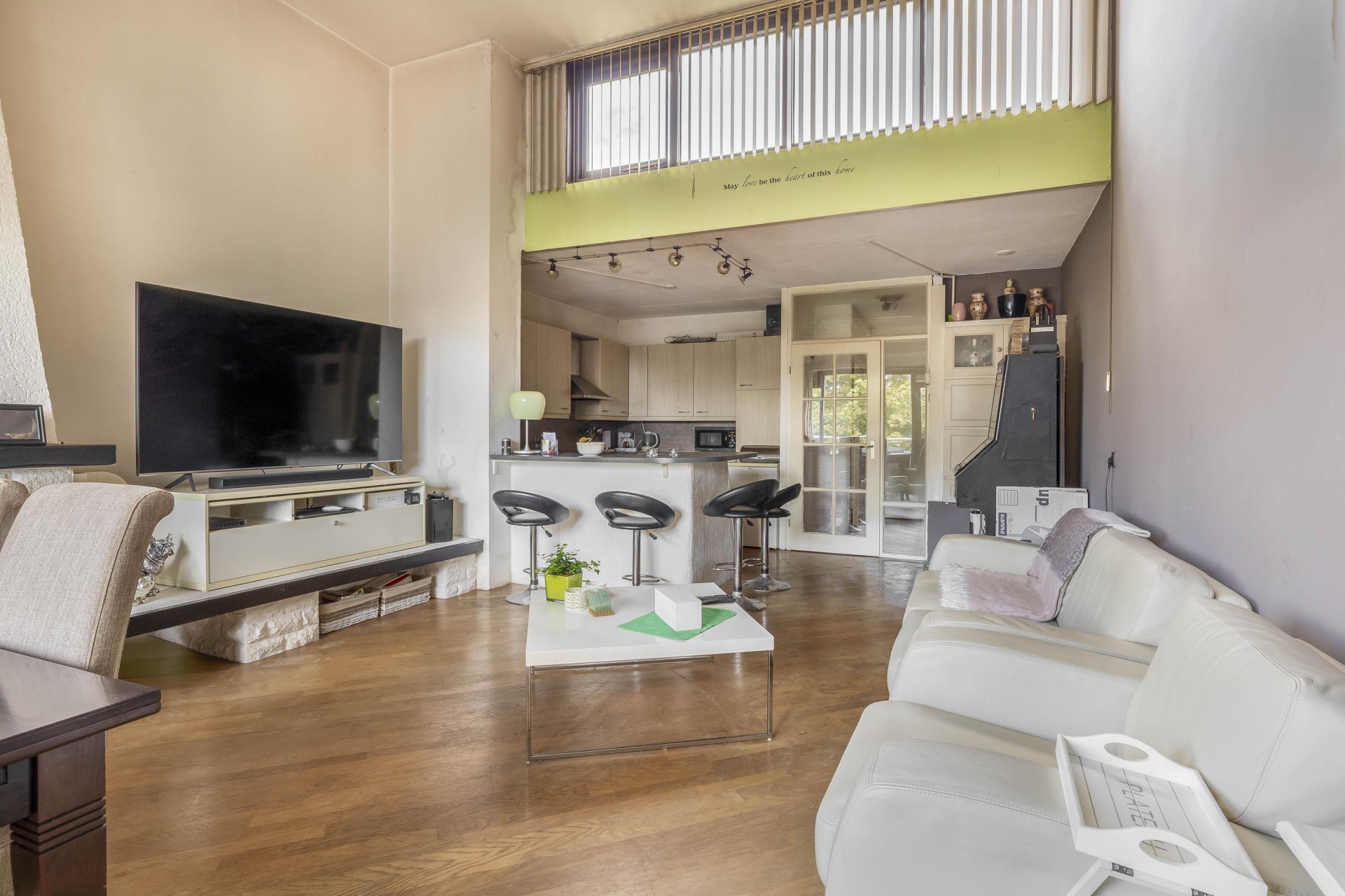 Een verdieping hoger is de woonkamer met hoog plafond en grote raampartijen te vinden. De keuken is functioneel opgezet in een hoekopstelling met veel kastruimte en inbouwapparatuur. De bar tussen keuken en woonkamer maakt het extra gezellig: ideaal voor een snel ontbijt of een drankje met vrienden. De ruimte is voorzien van een houten vloer en een neutrale afwerking die je eenvoudig naar je eigen smaak kunt stylen. Ook een openhaard ontbreekt niet: een sfeervolle toevoeging die voor extra warmte zorgt in de wintermaanden.