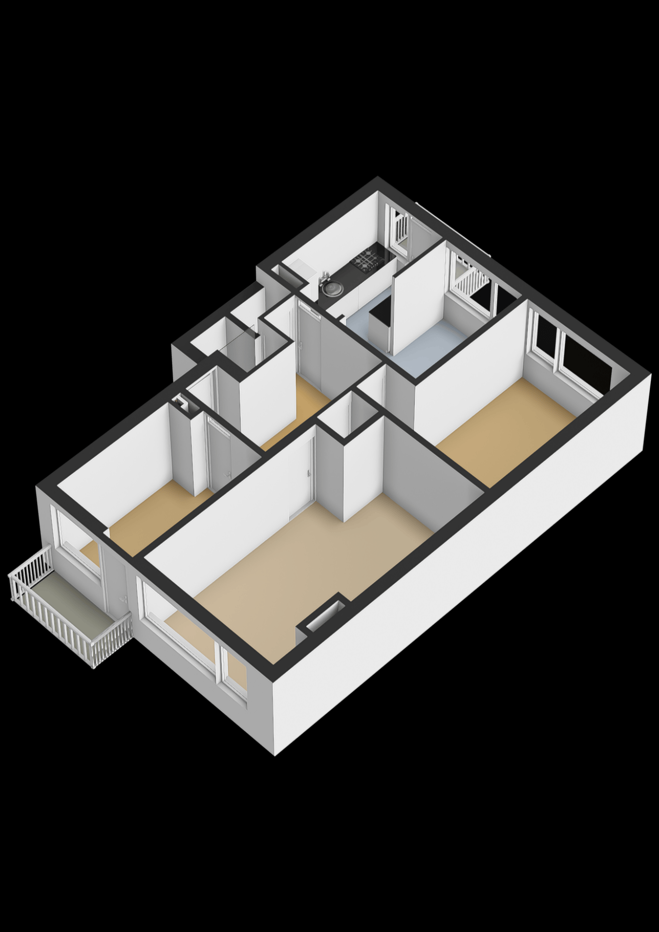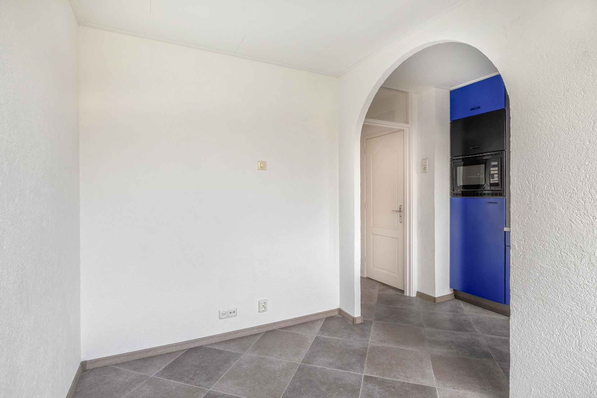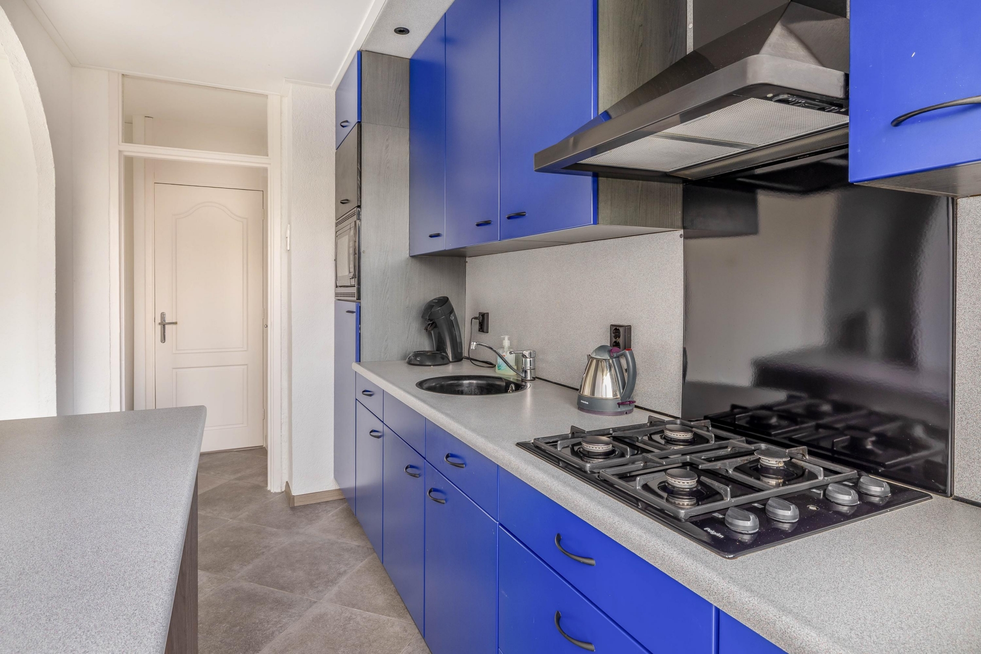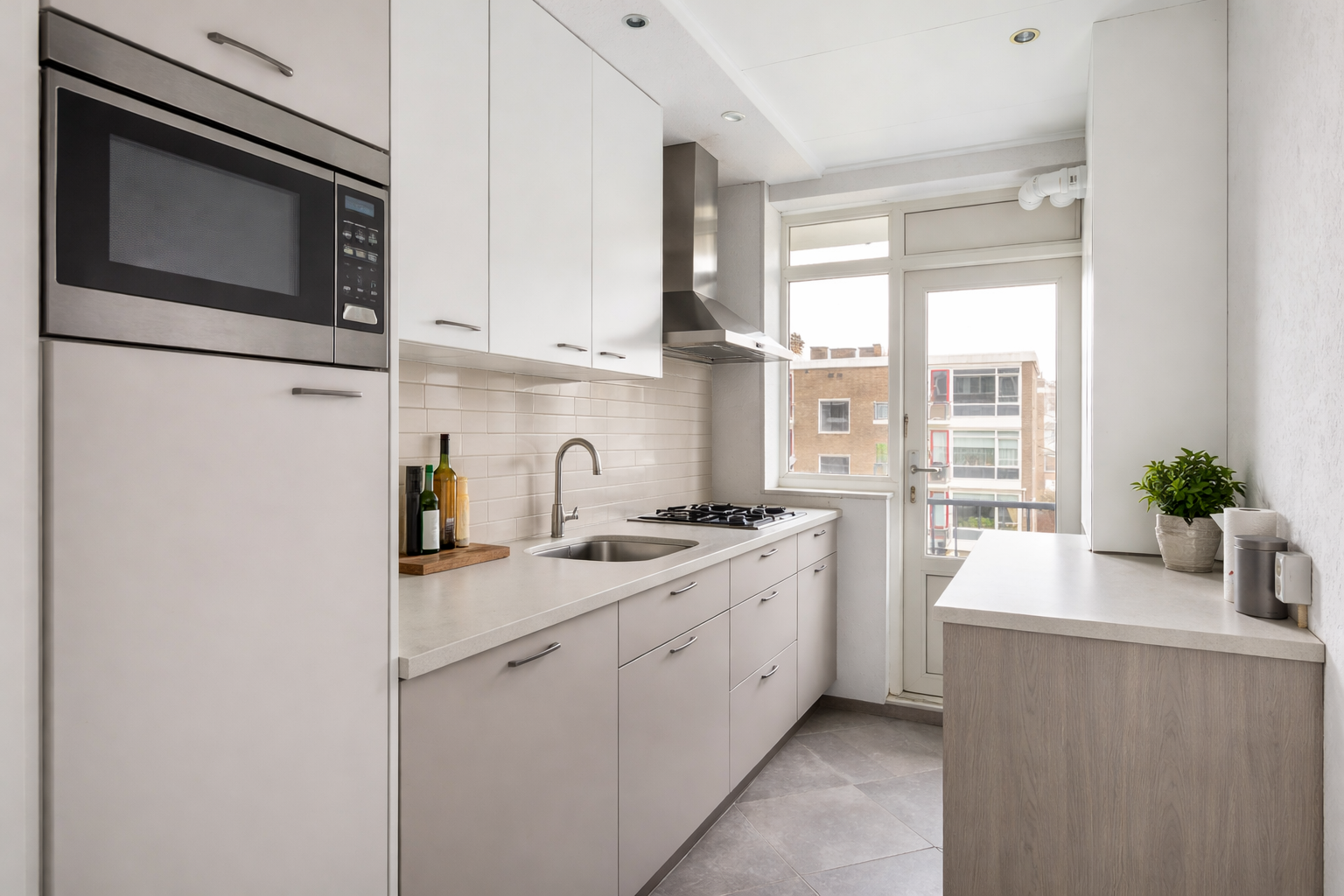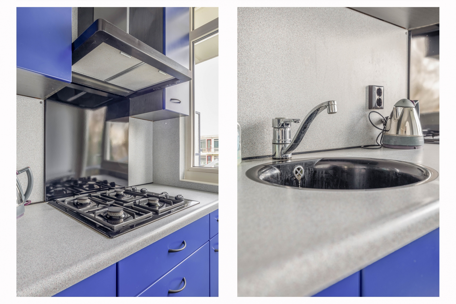 Eén van de voormalige slaapkamers is bij de keuken getrokken, waardoor er nu ruimte is ontstaan voor een gezellige woonkeuken. Perfect voor wie graag uitgebreid kookt of gewoon houdt van een huiselijke sfeer. De keuken is praktisch opgezet, met voldoende kastruimte, een 4-pits gaskookplaat, combi-magnetron en afzuigkap. Via de keuken loop je zó het tweede balkon op, dat op het oosten ligt en uitkijkt over een breed grasveld. Heerlijk om ’s ochtends met een kop koffie de dag te beginnen.