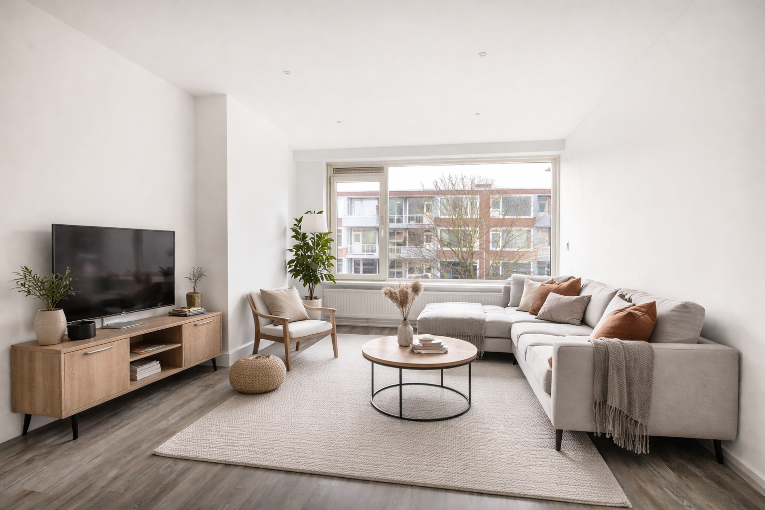 Zodra je het appartement binnenkomt, valt de frisse uitstraling op. Dankzij de grote raampartijen komt er veel daglicht naar binnen, vooral in de woonkamer, die aan de straatzijde ligt. Hier heb je uitzicht op de groene straat en directe toegang tot het balkon op het westen. Dit is de ideale plek om aan het eind van de dag van de zon te genieten.